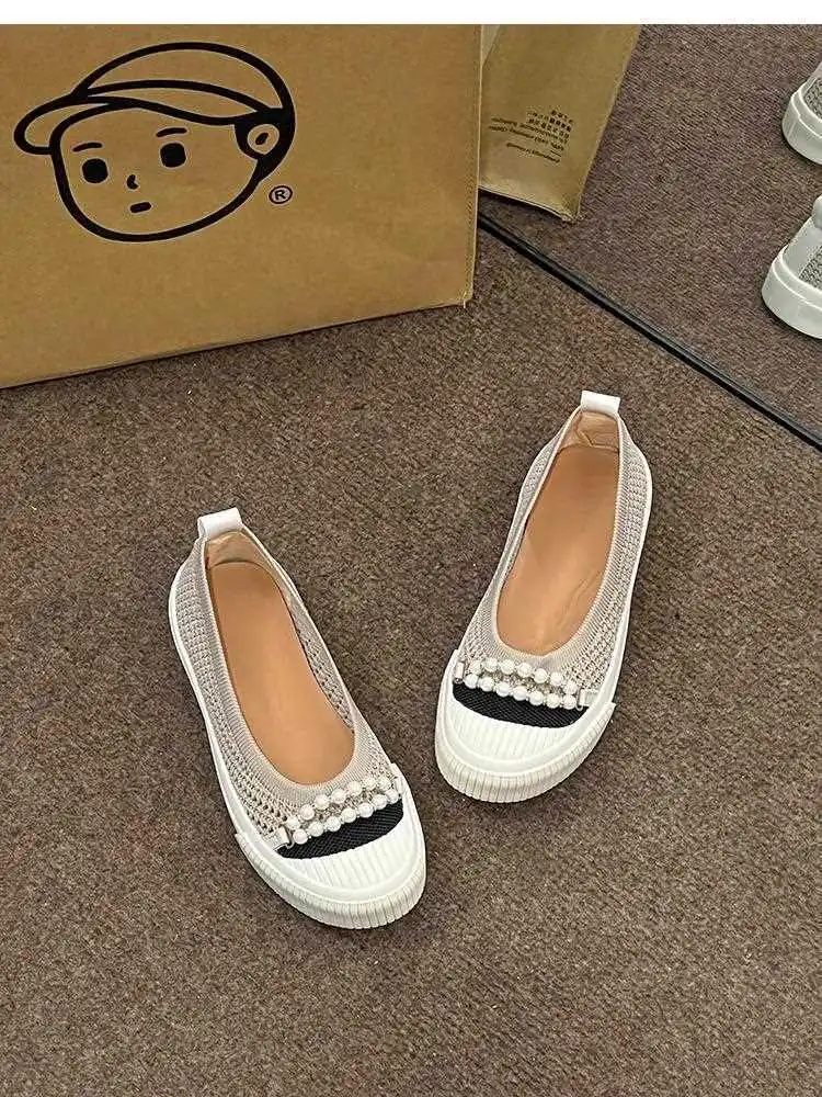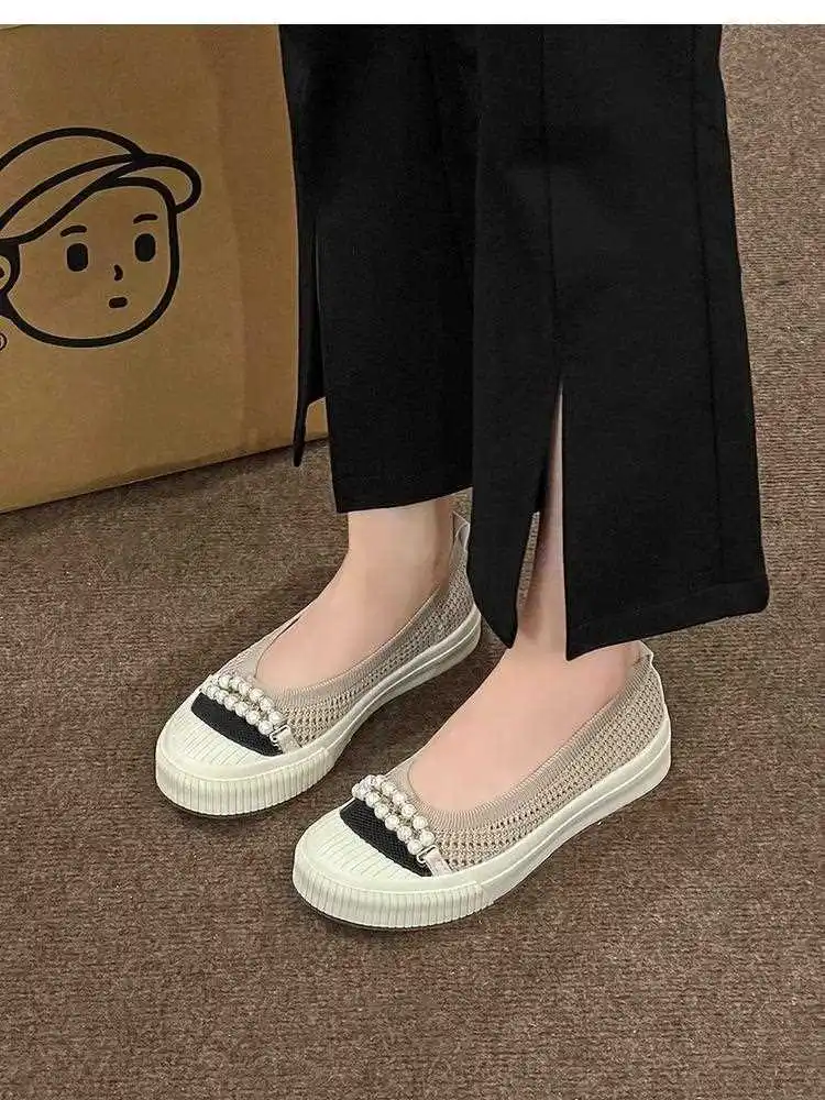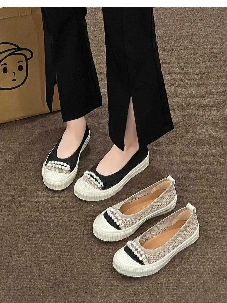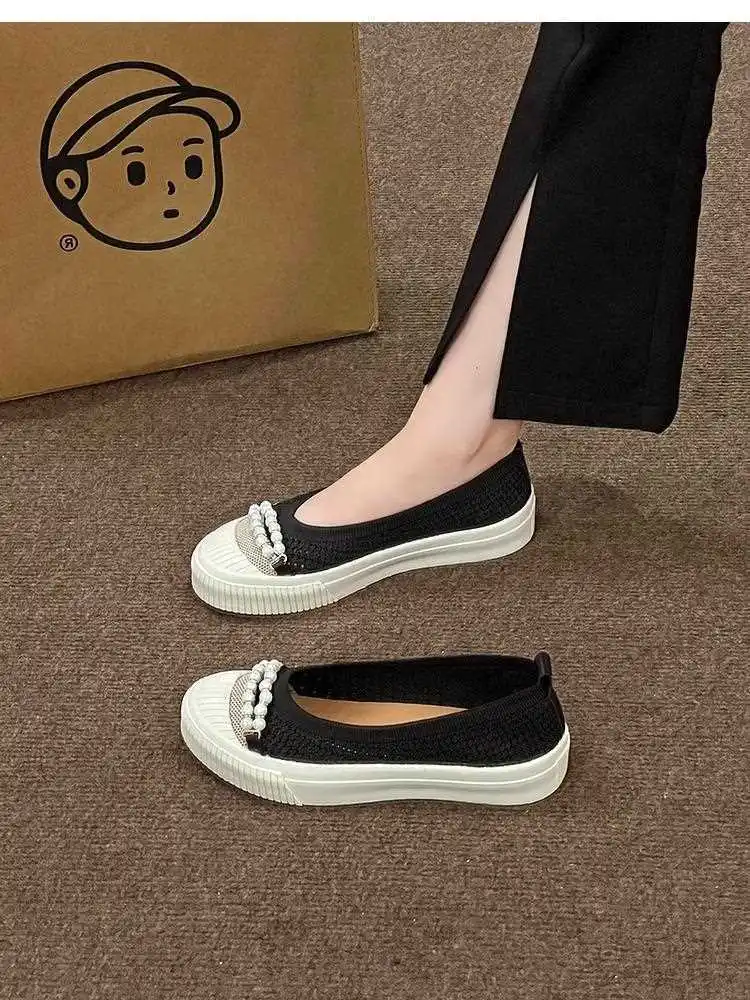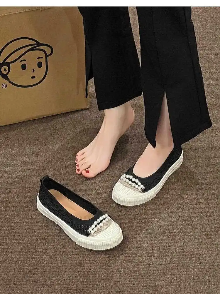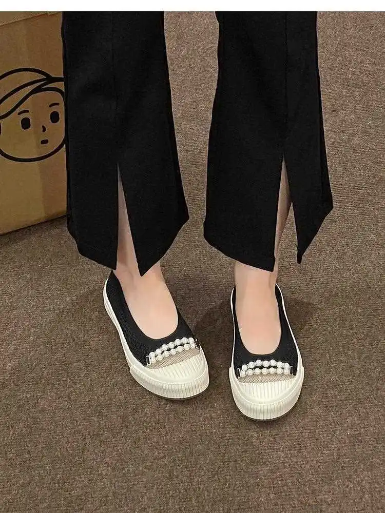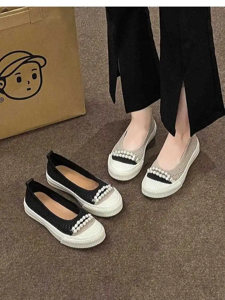 KYLETHOMASW - Fashion Shallow Mouth Round Head Women's Single Shoes Spring Autumn New Woven Pearl Bow Thick Soled Low Comfort Loafer Shoe