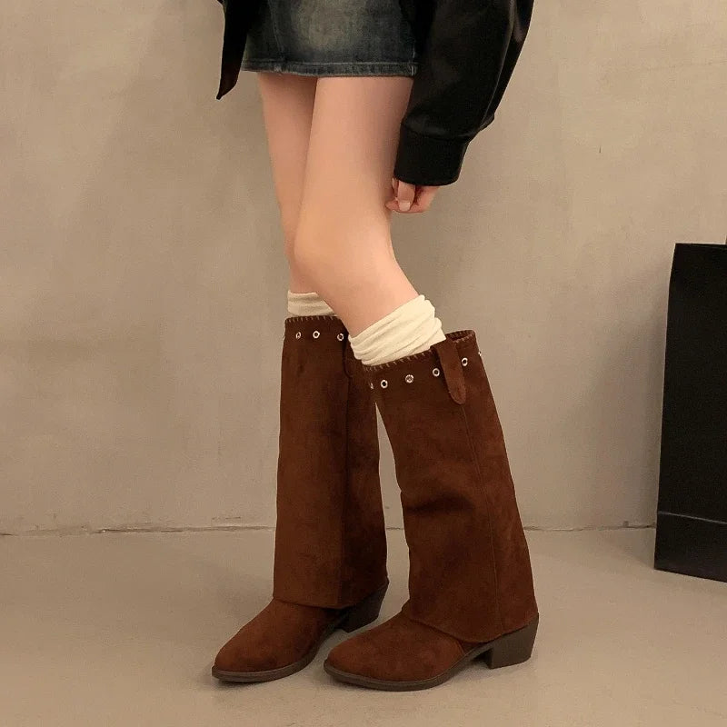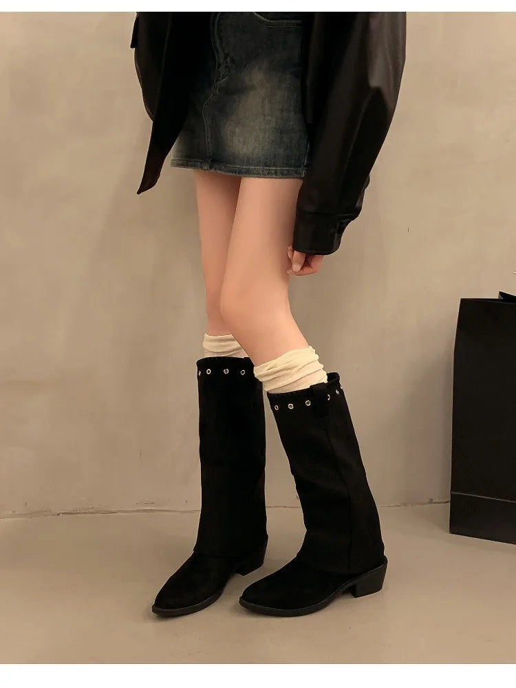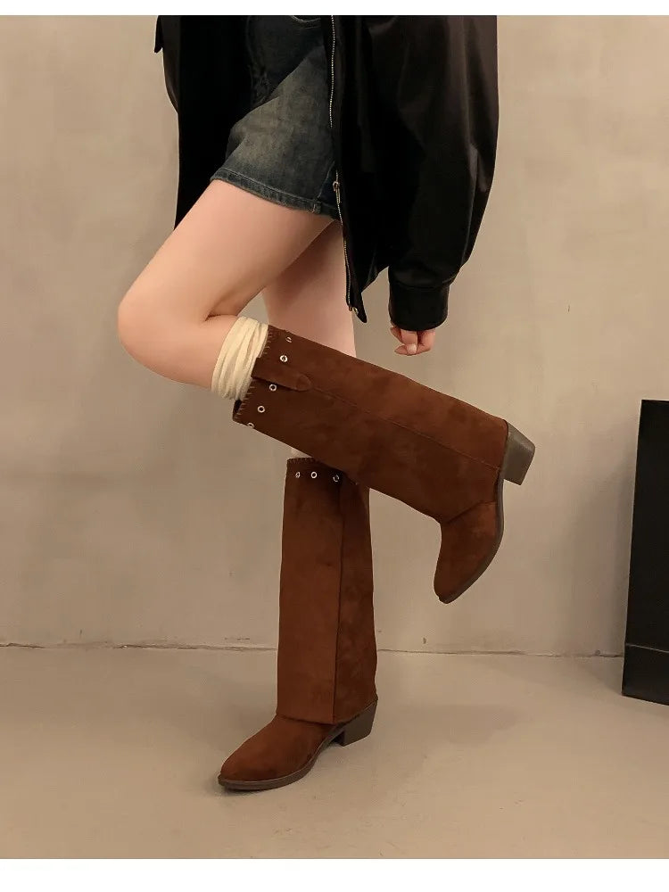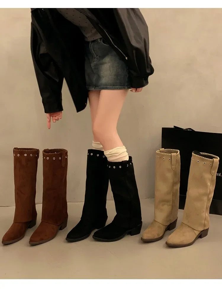 KYLETHOMASW - Fashion Vintage Thick Heel Women Western Cowboy Boots Button Combination Splicing Shoes Autumn Winter Ladies Pipe Long Booties