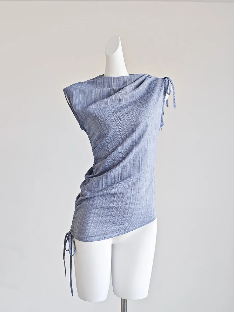 KYLETHOMASW  -  French Blue Striped Drawstring Strap Shirt for Women Summer Outfit Sweet GirlI Irregular Slim Fit Sleeveless Blouses Women Tops
