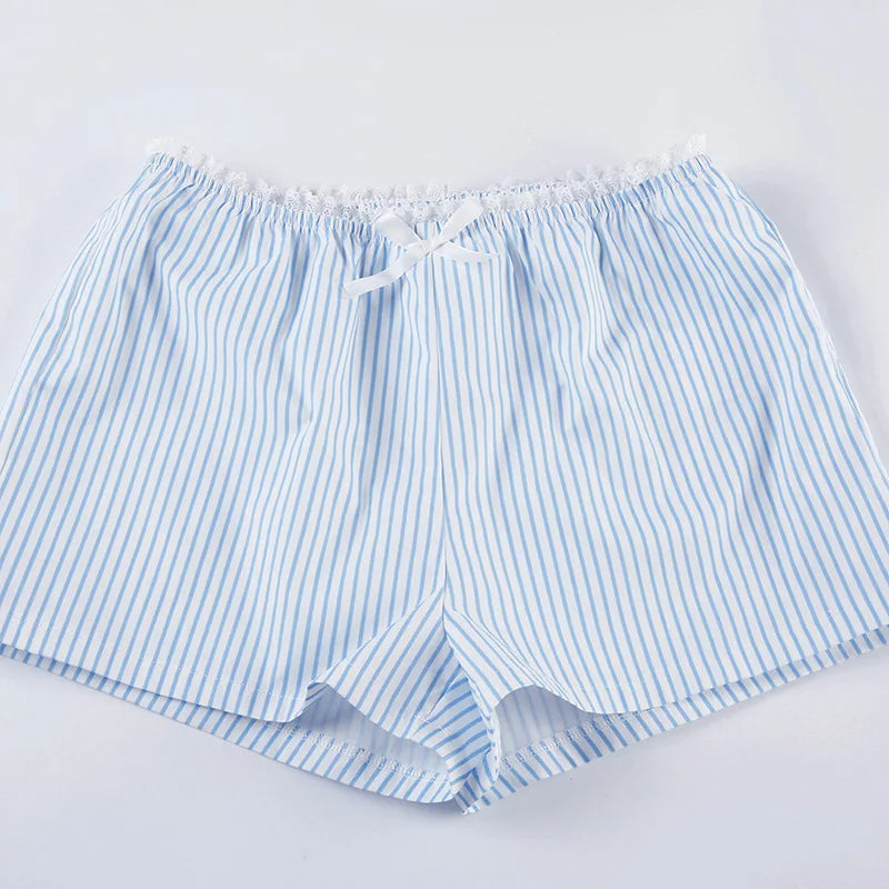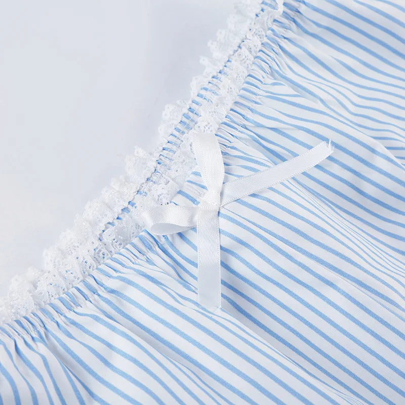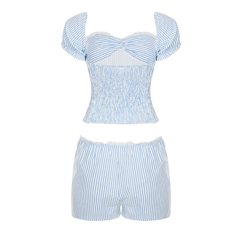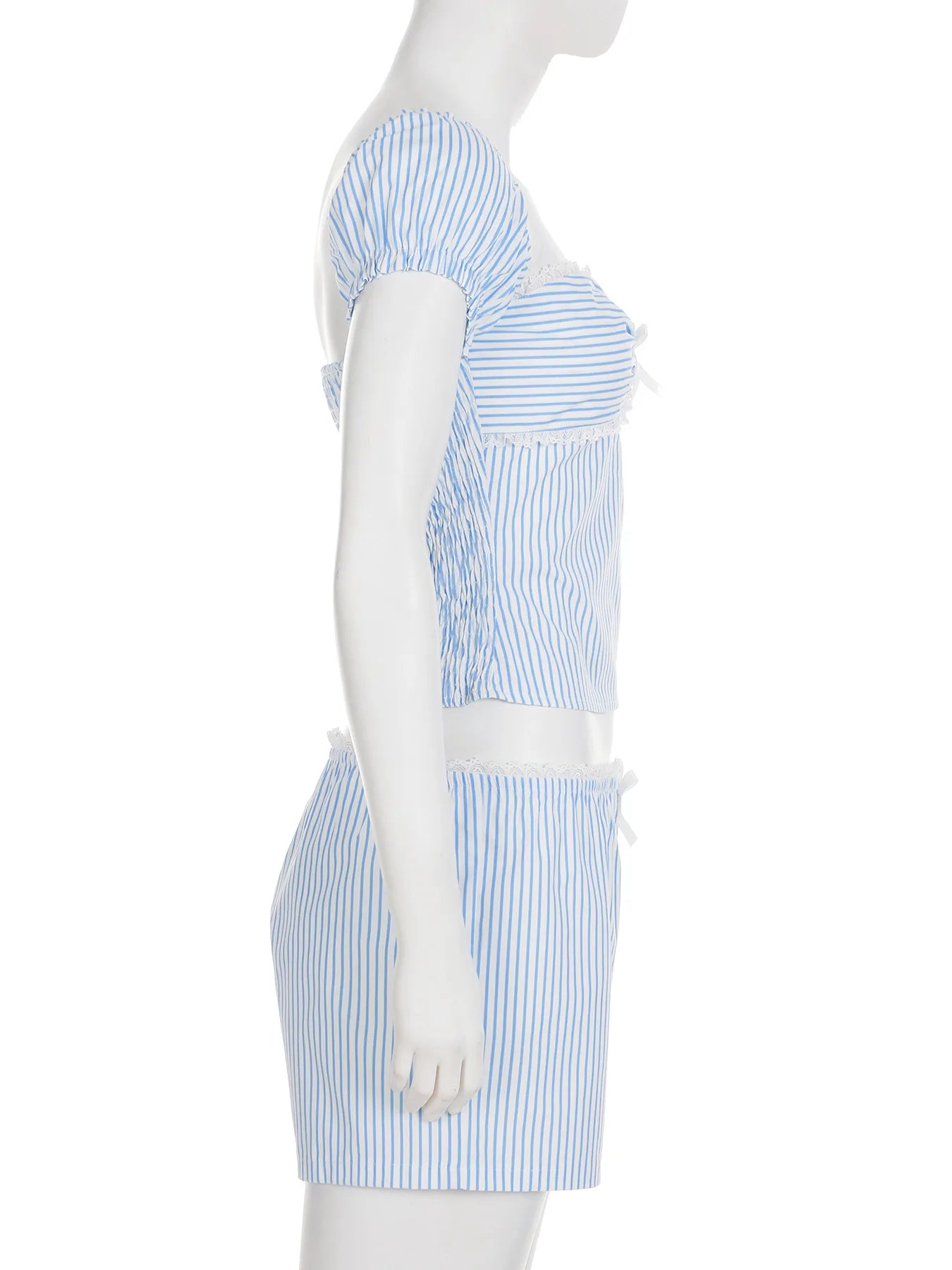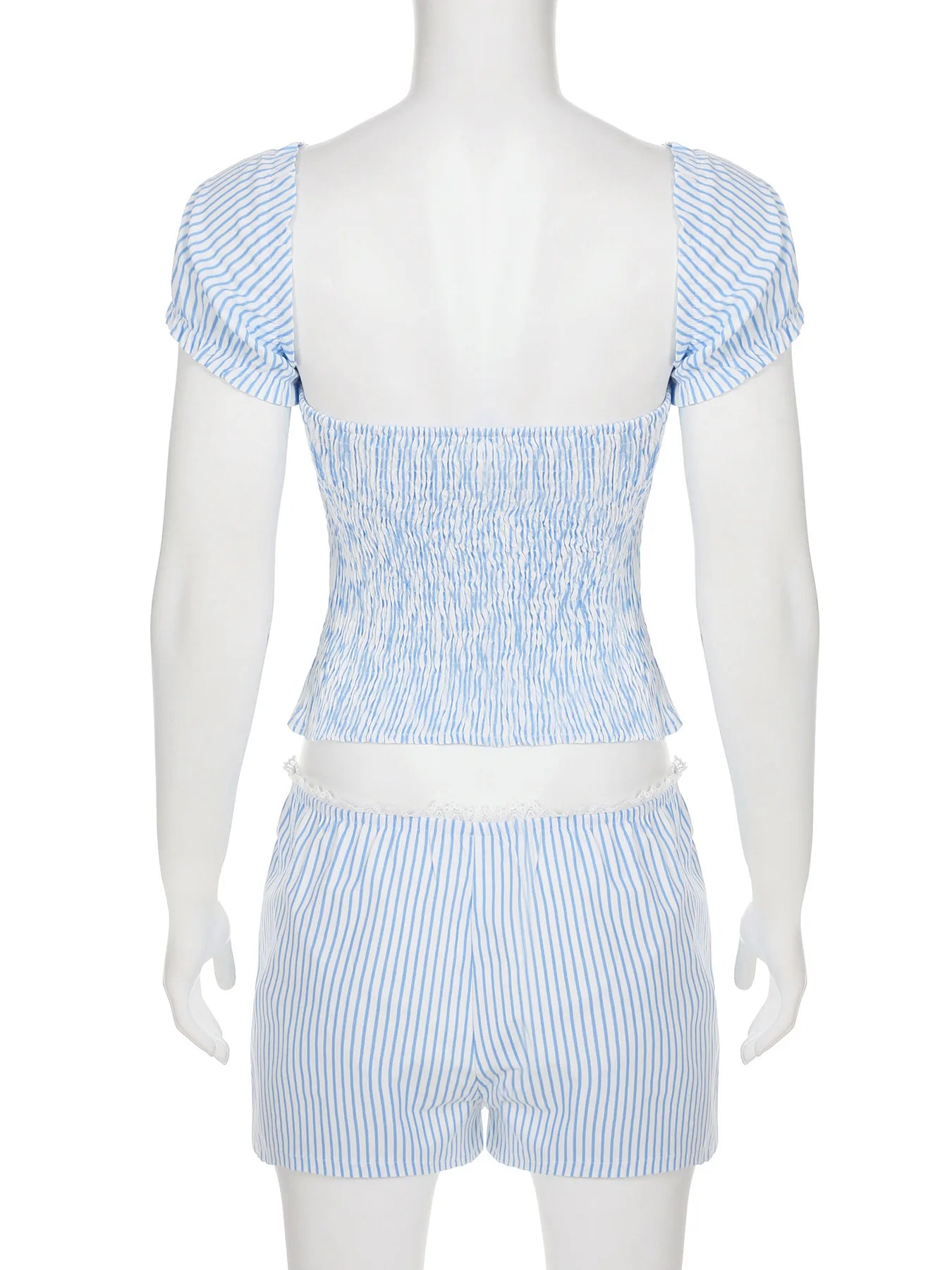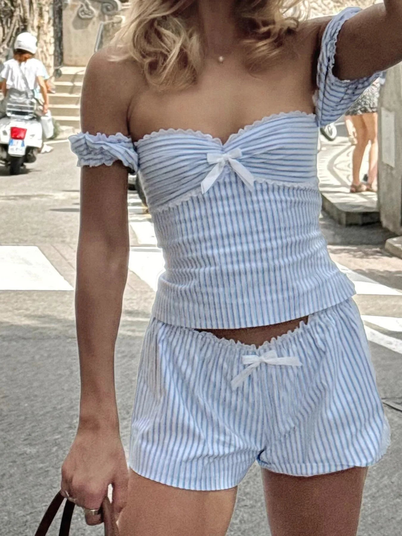 KYLETHOMASW - French Casual Suit Women's Summer Blue Striped Off Shoulder Top Low Waist Shorts Two-piece Set Fashion Female Clothes