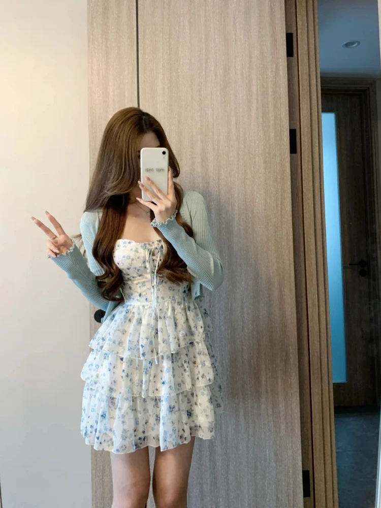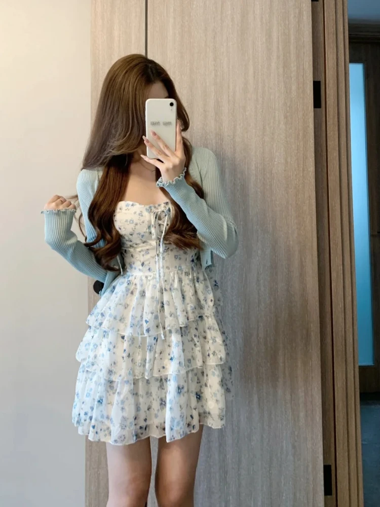 KYLETHOMASW - French Elegant 2 Piece Dress Suits Women Vintage Sexy Slim Floral Dress + Korean Casual Long Sleeve Thin Cardigan Fashion Chic