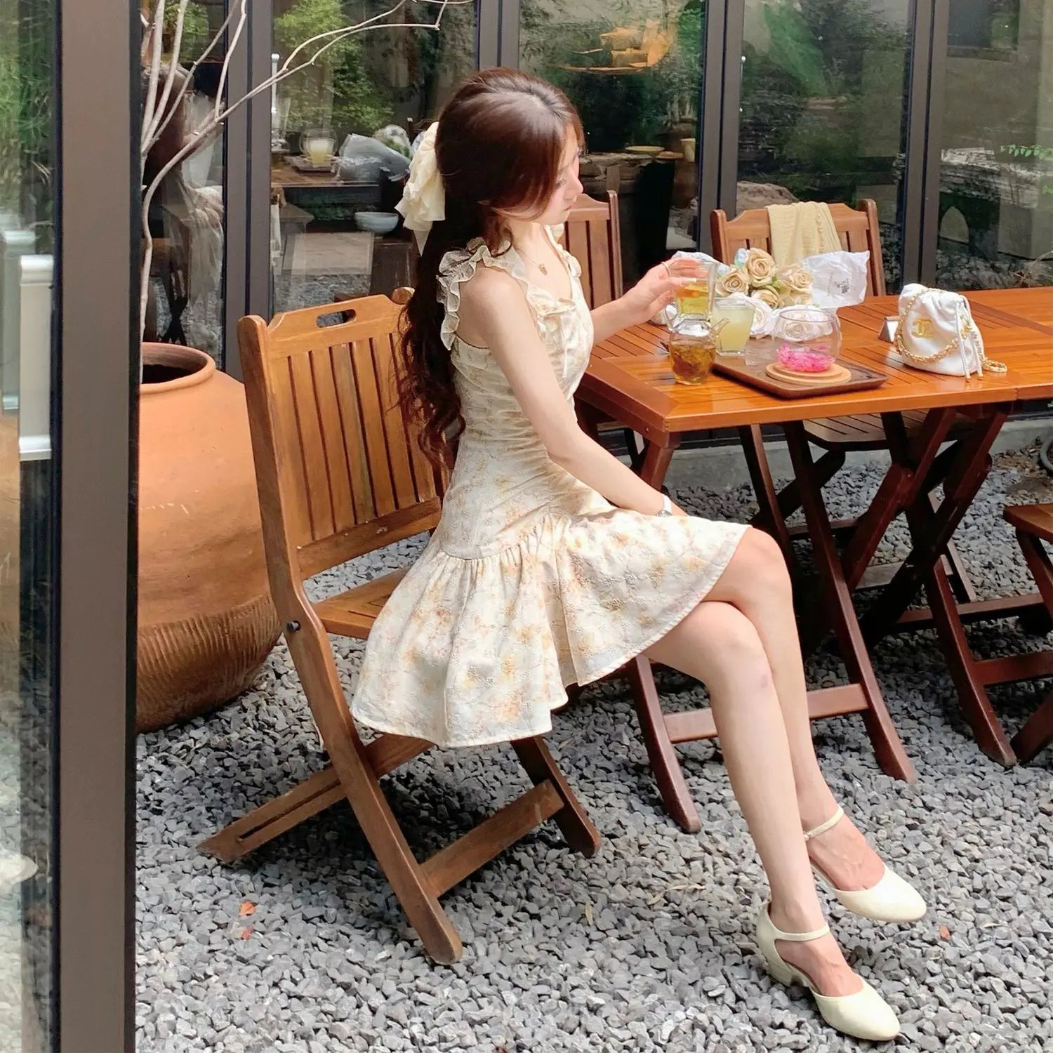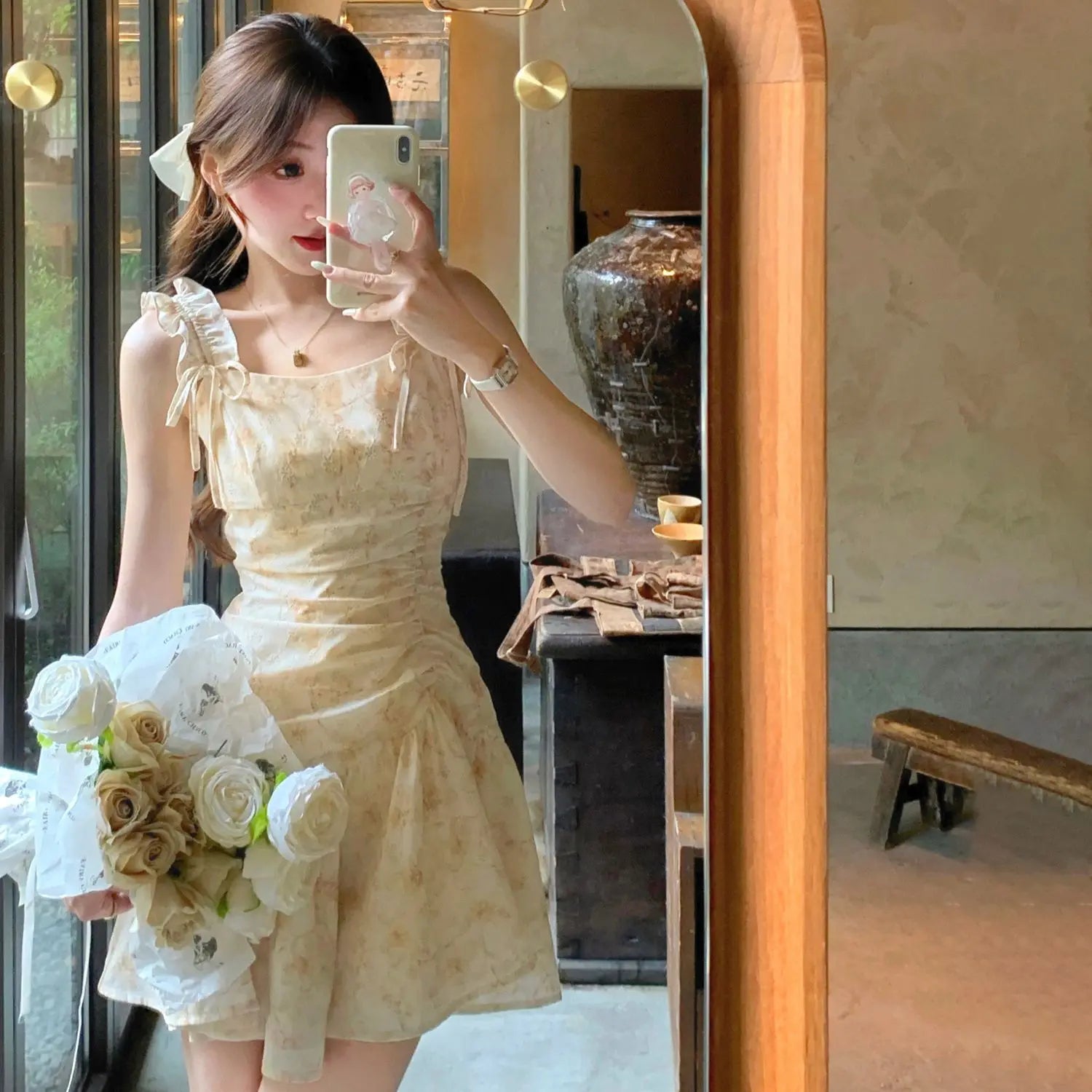 KYLETHOMASW  -  French Romantic Yellow Fragmented Flower Short Dress Summer New Sweet Girl Sleeveless Slim Fit A-line Suspended Dress for Women