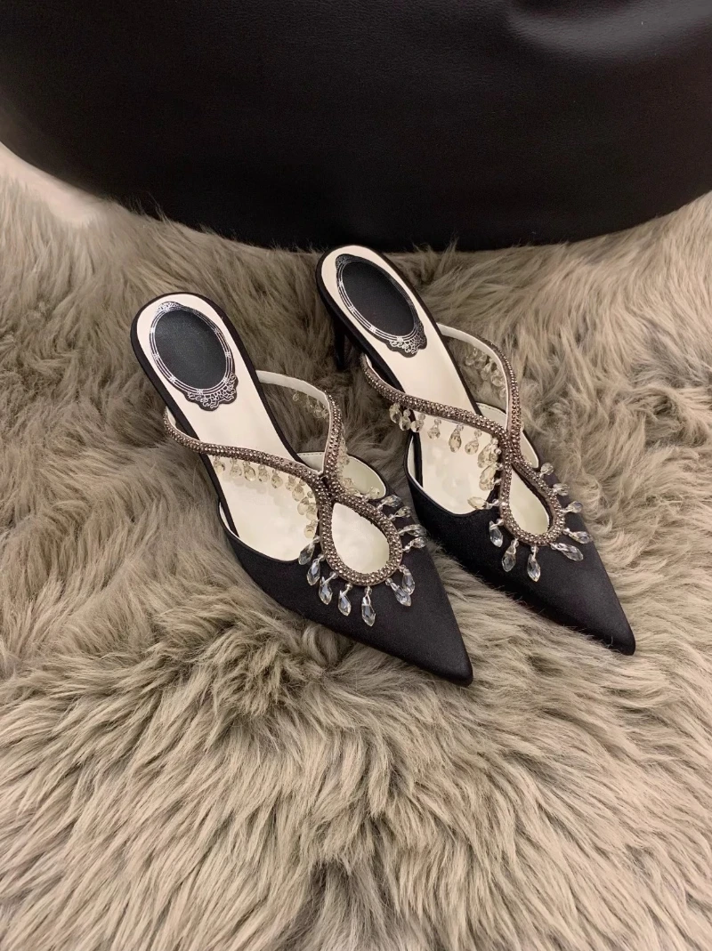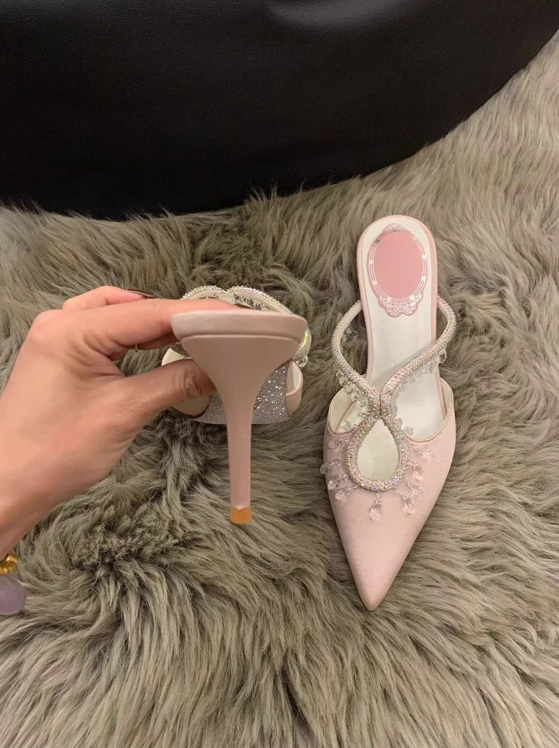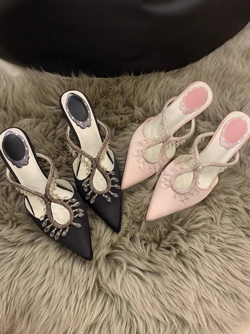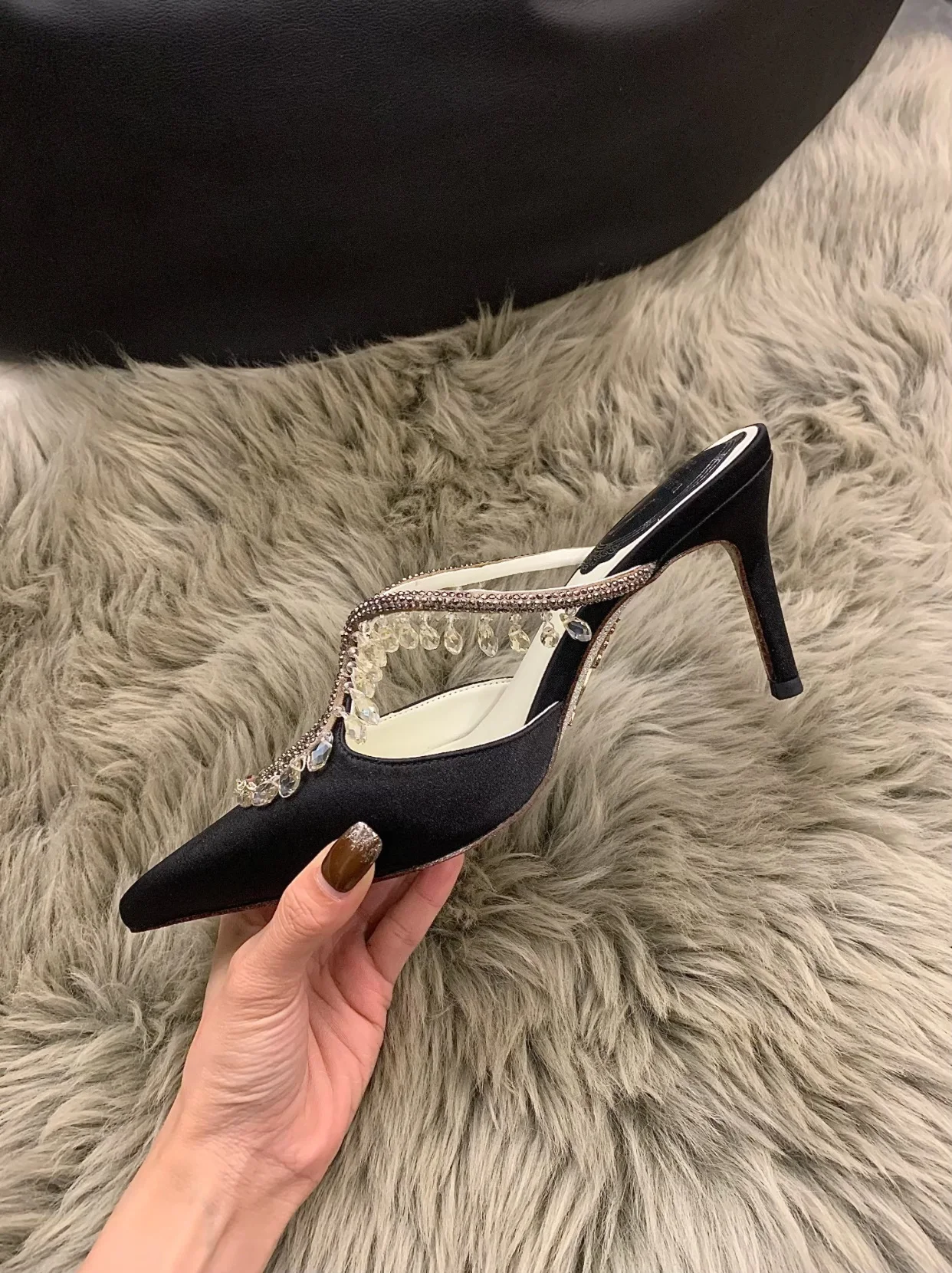 KYLETHOMASW  -  French Satin Rhinestone Stiletto High Heels Women's Pointed Head Crystal Pendant Bag Head Cool Slippers Women