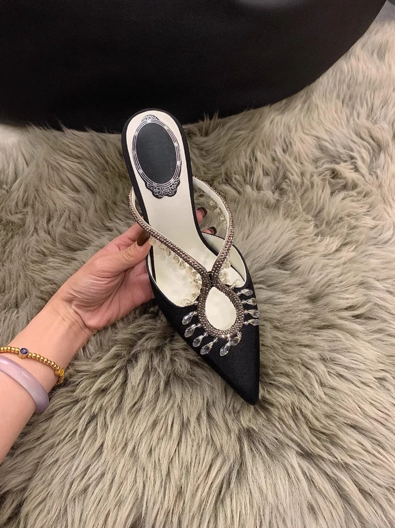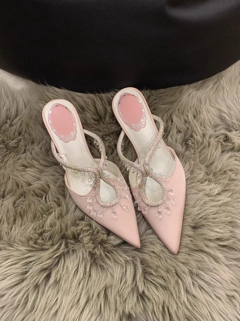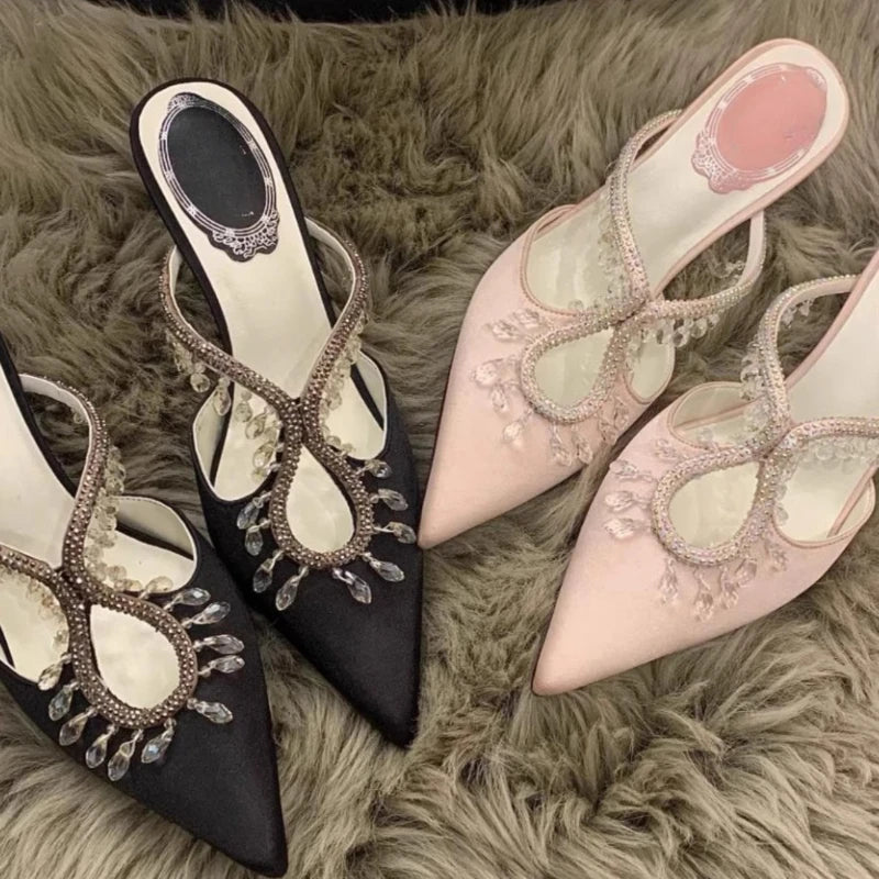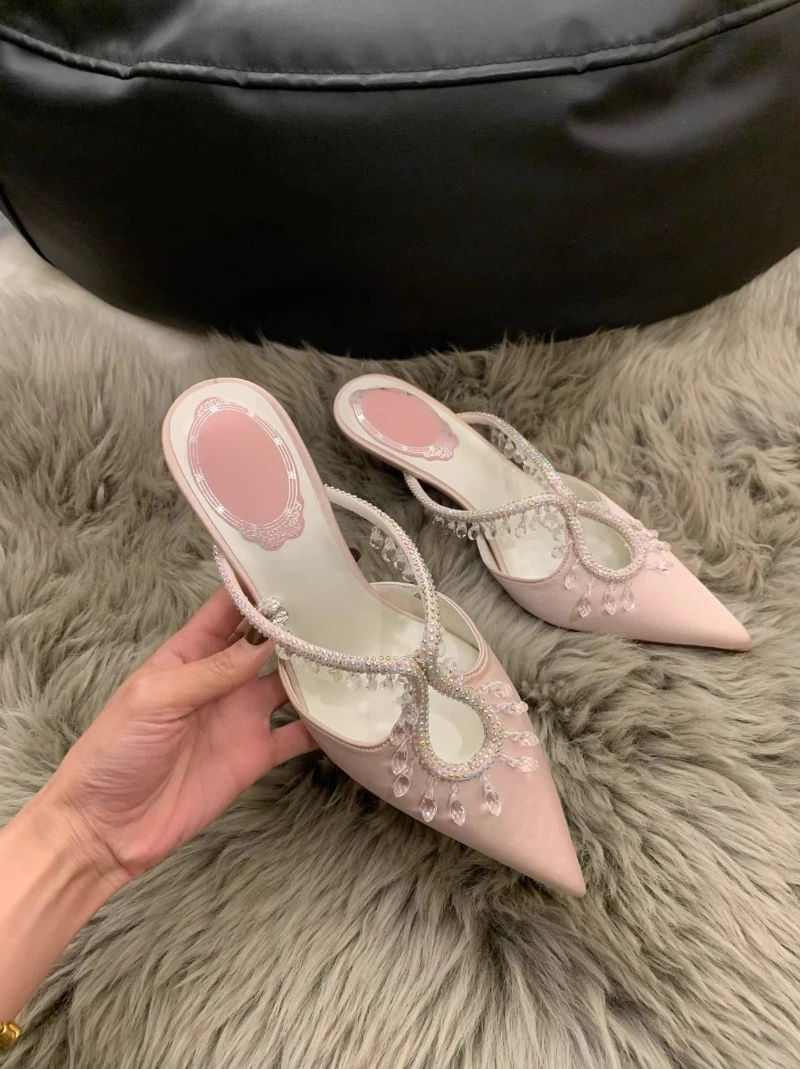 KYLETHOMASW  -  French Satin Rhinestone Stiletto High Heels Women's Pointed Head Crystal Pendant Bag Head Cool Slippers Women