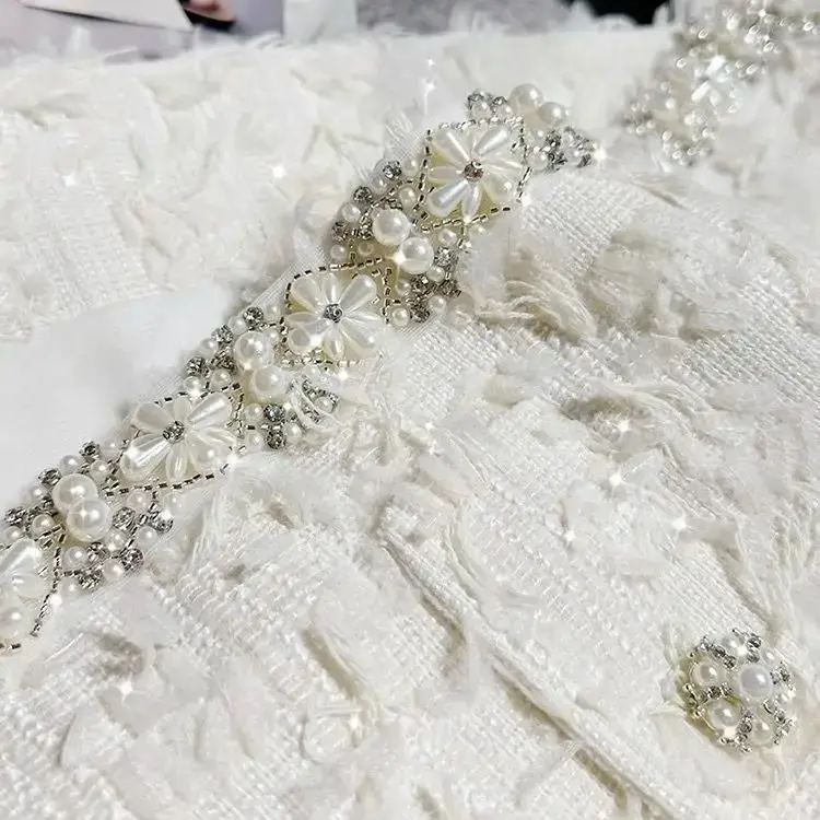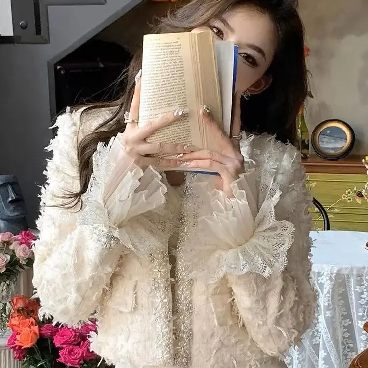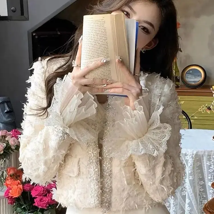 KYLETHOMASW - Fringed Tweed Coat 2024 New Fashion Autumn Women Long Sleeves Heavy Industry Embroidered Bell Bottoms Stitching Lace Casual.