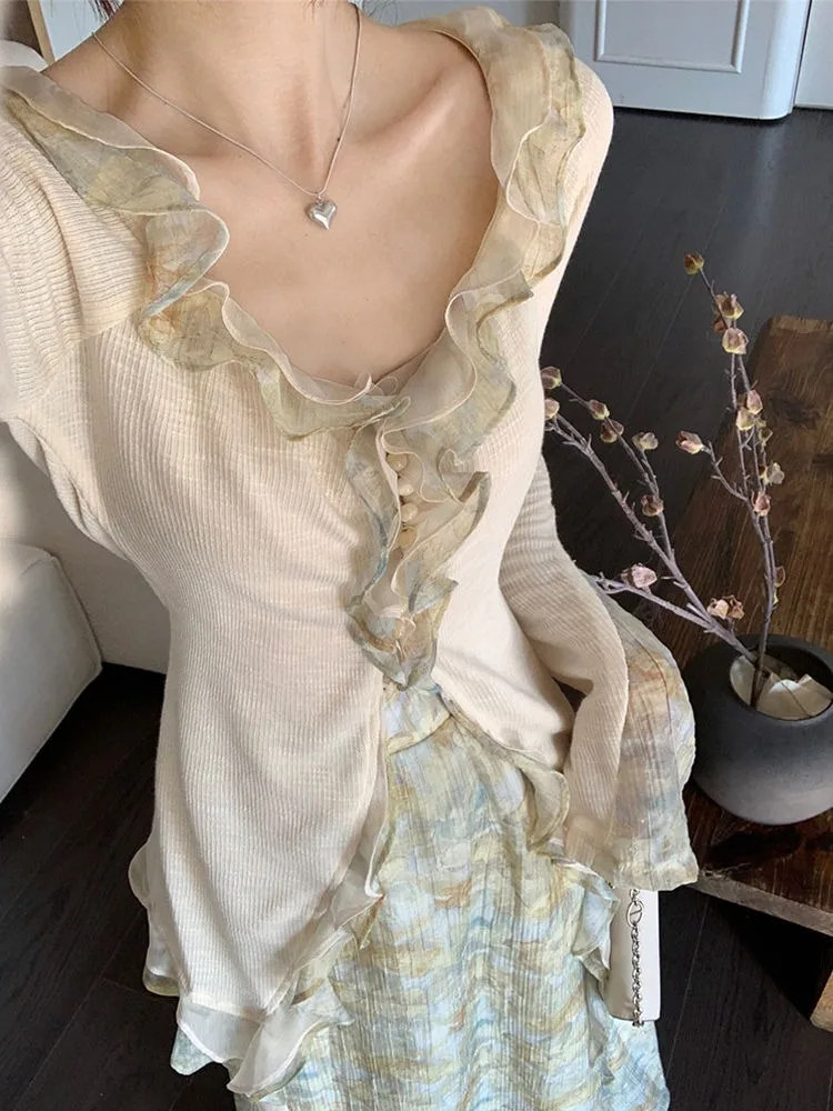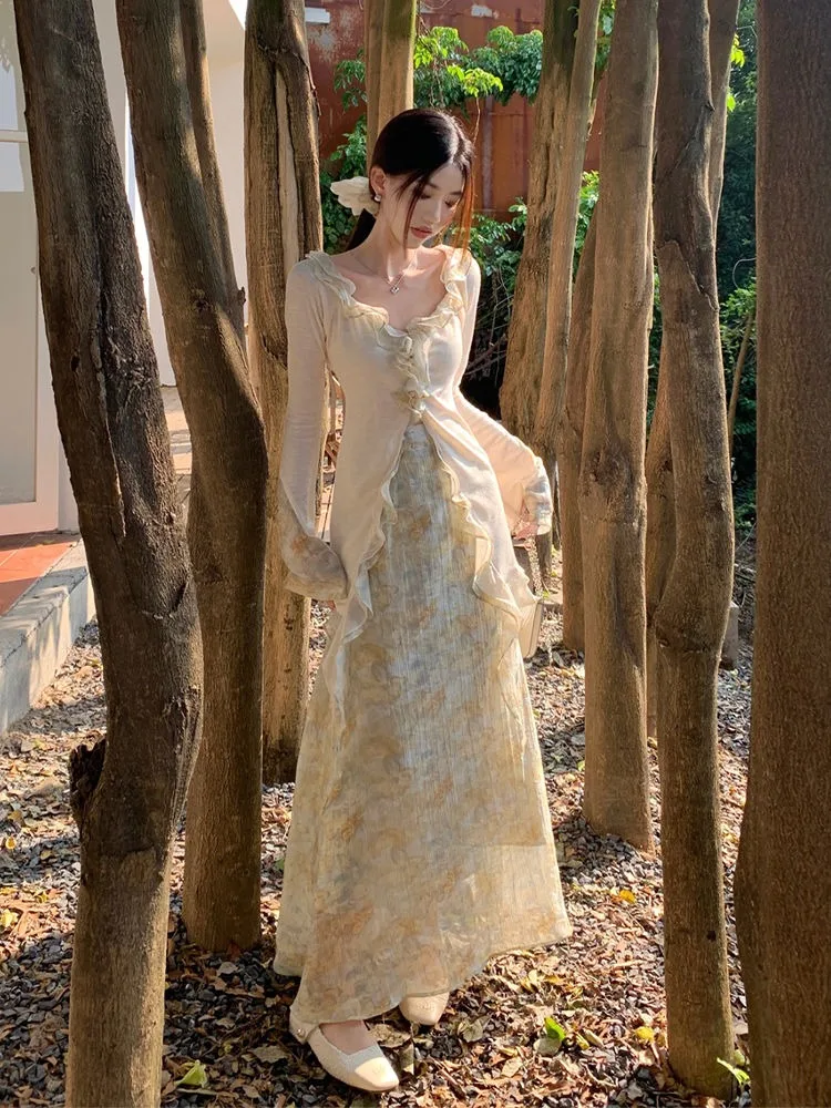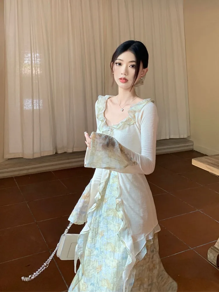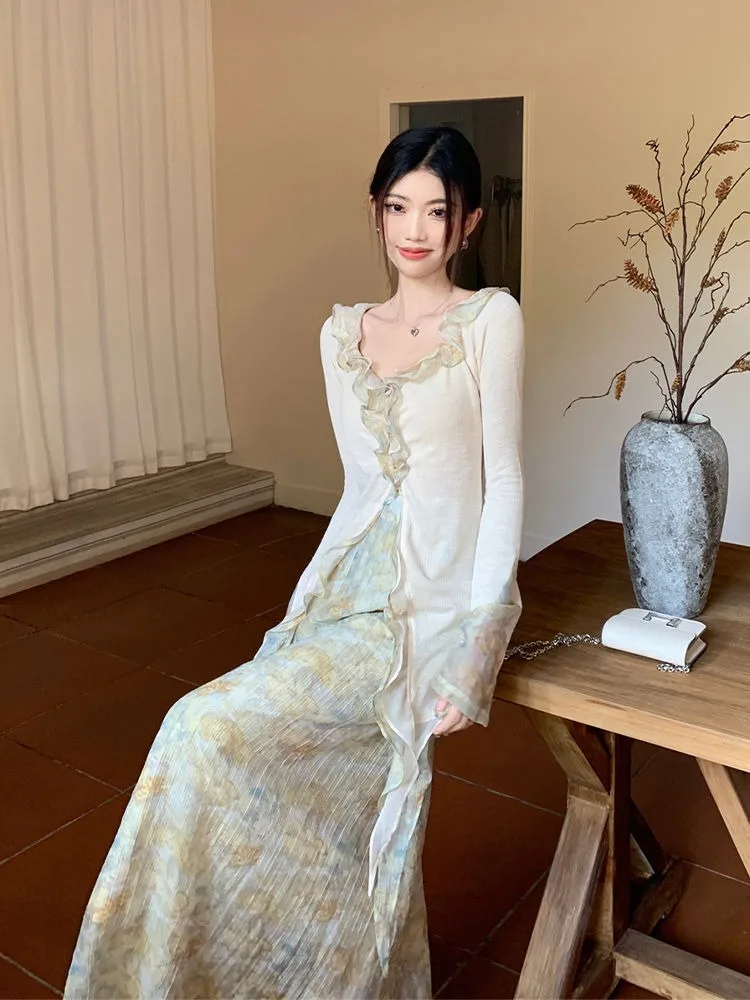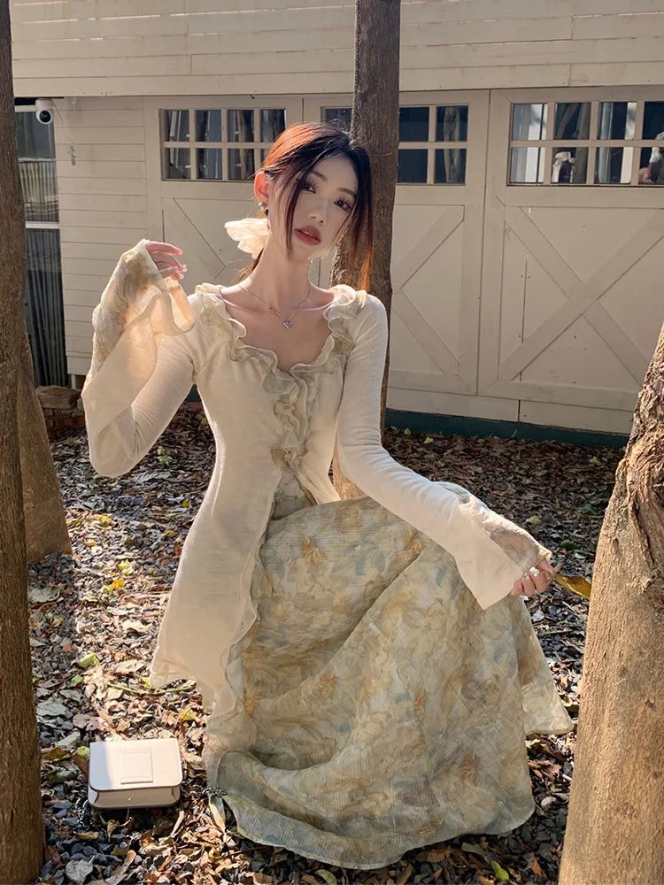 KYLETHOMASW  -  Gentle Wind Ruffle Design Dress For Women's 2024 New Niche Shirt Top Autumn Floral Skirt Suit Daily Fashion Elegant Long Dresses