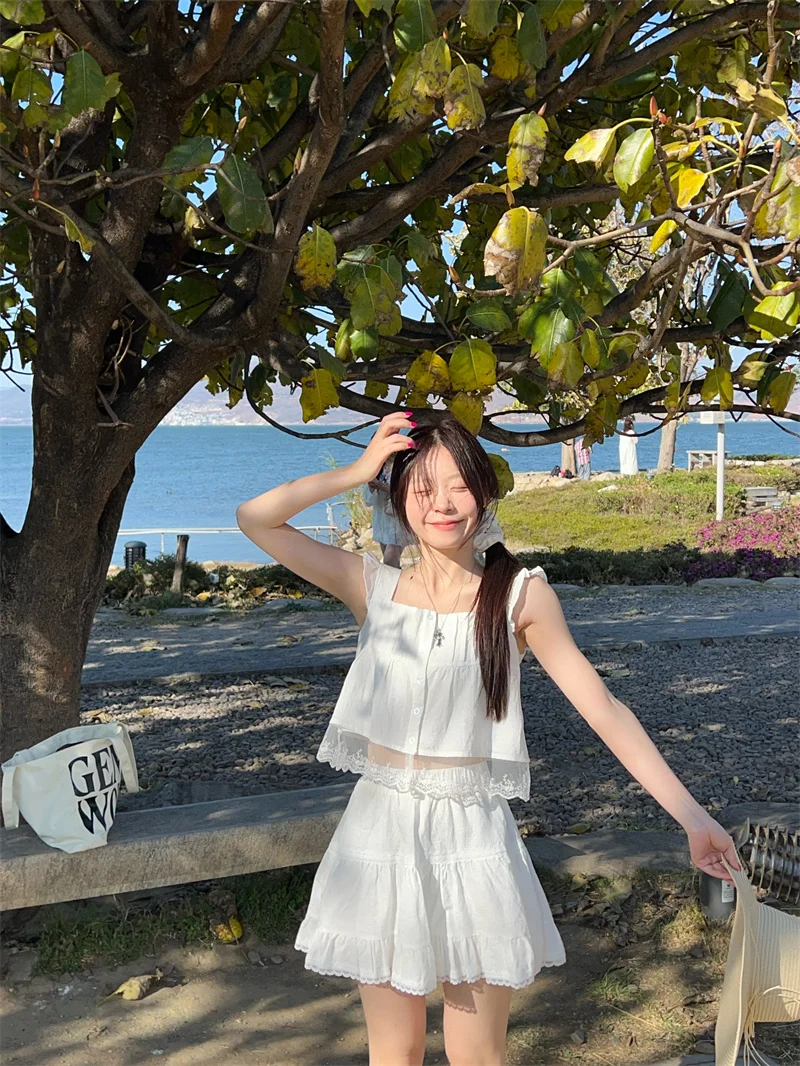 KYLETHOMASW  -  Girl Suit Women's Summer Lace Patchwork Flying Sleeve Vest A-line Mini Skirt Two-piece Set Fashion Female Clothes