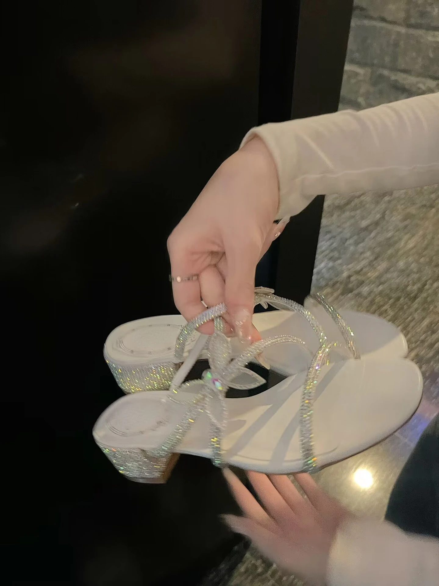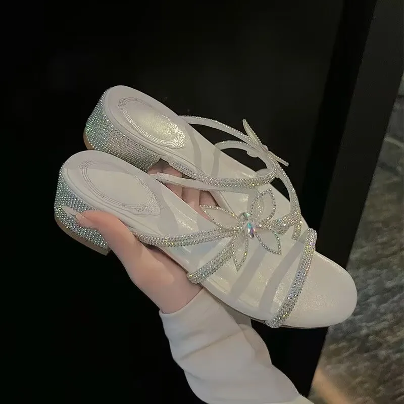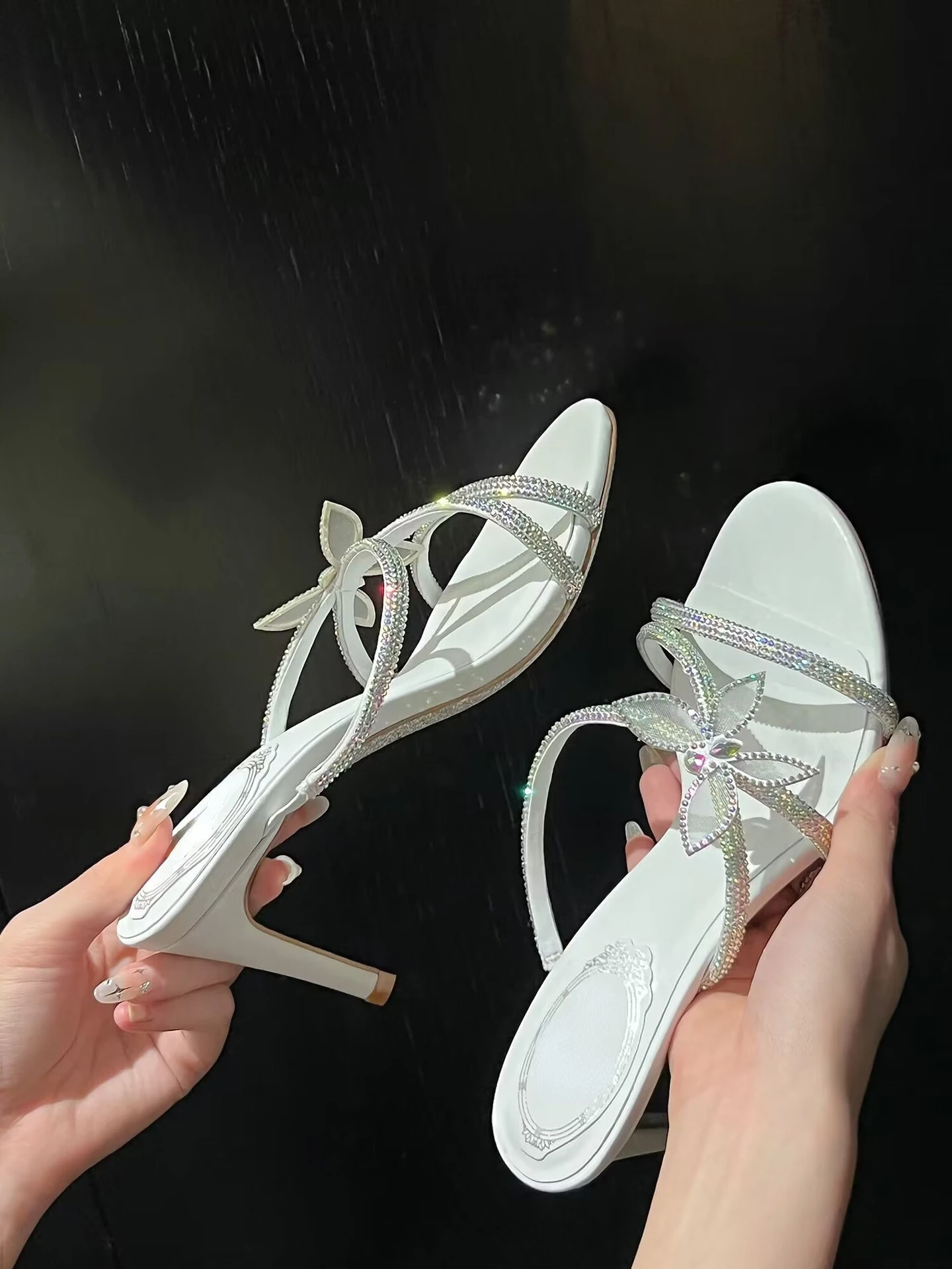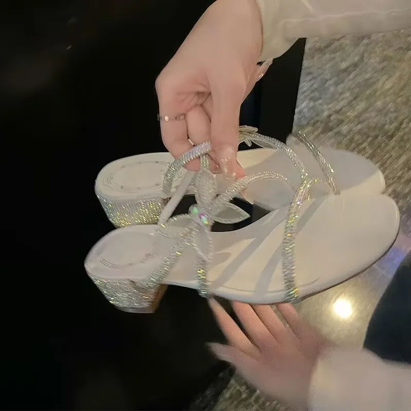 Kylethomasw High Heels Women's Thin Heels 2024 Summer New French One Line with Bow Slippers Wearing Water Diamond Open Toe Sandals Outside