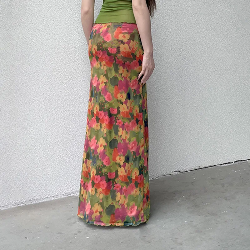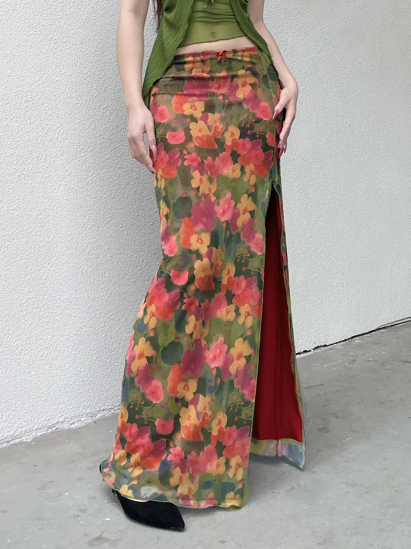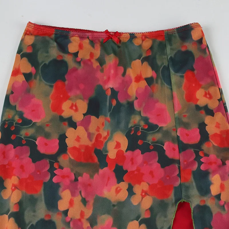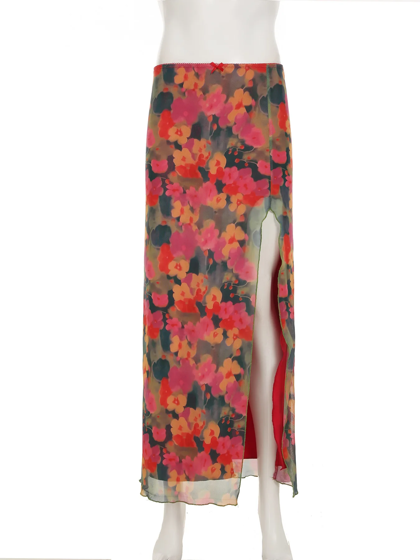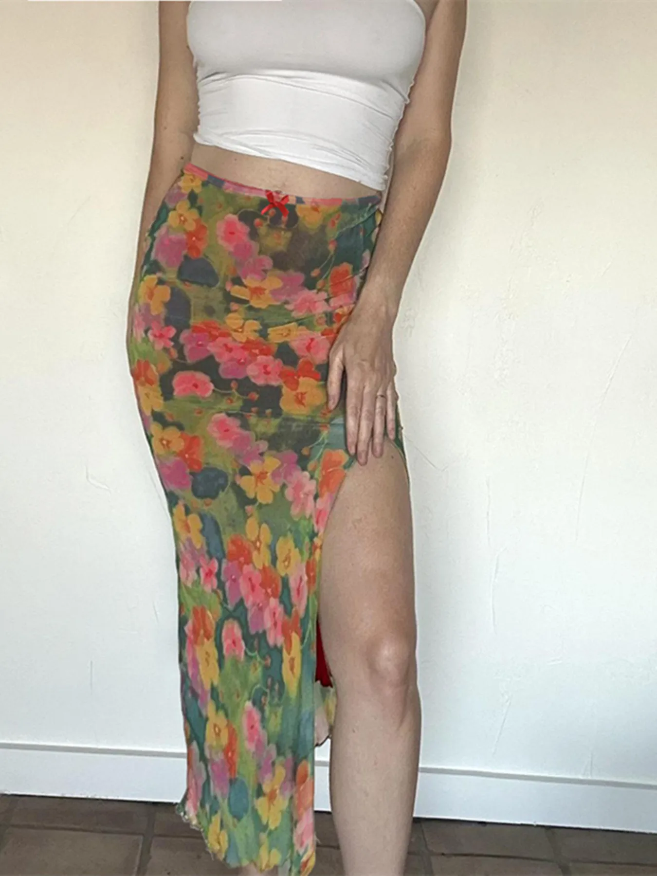 KYLETHOMASW - High Waisted Floral Print Skirt for Women's Summer Spicy Girl Irregular Mesh Split Long Skirt Fashion Female Clothes