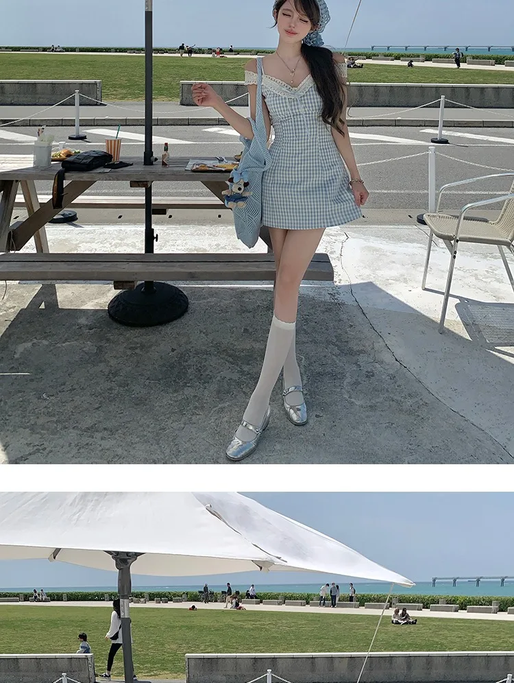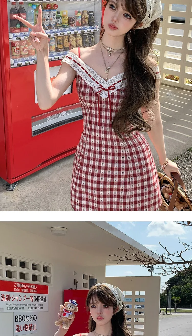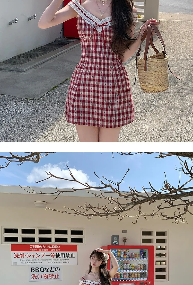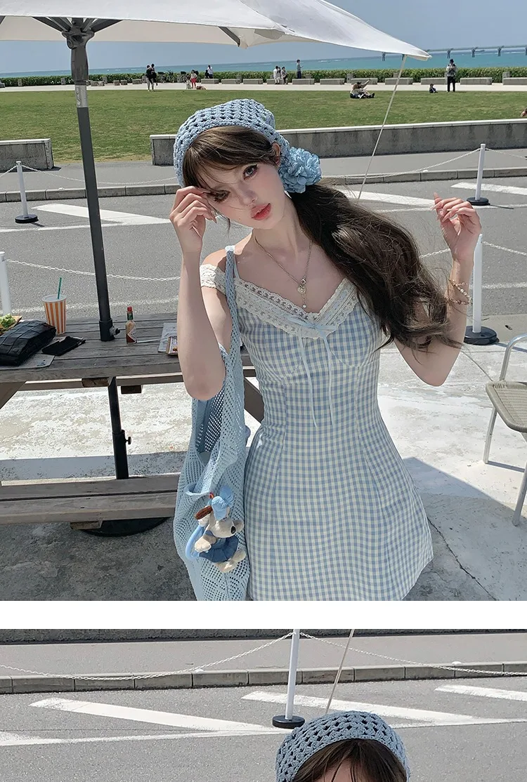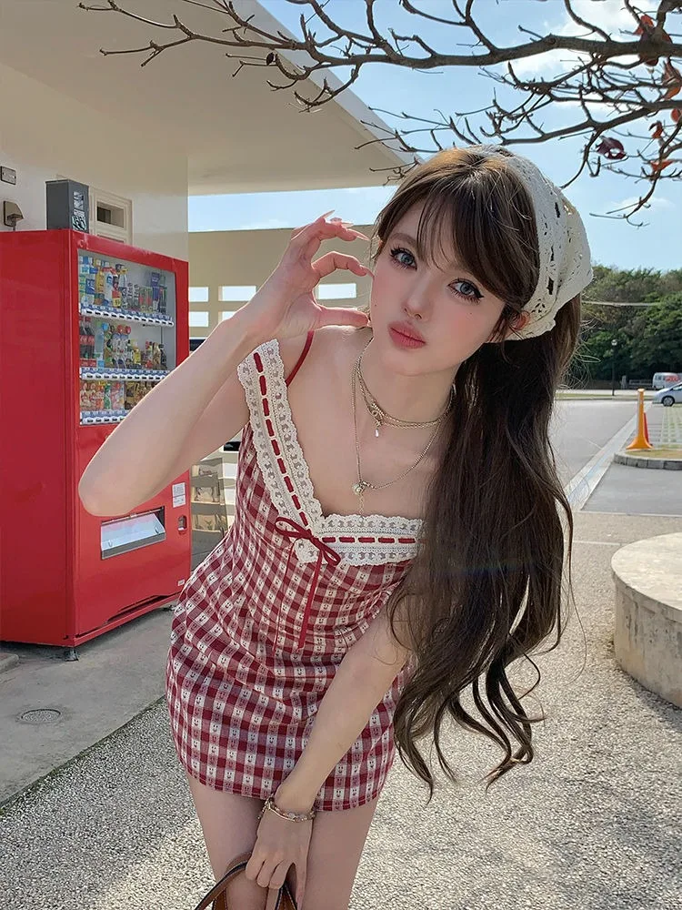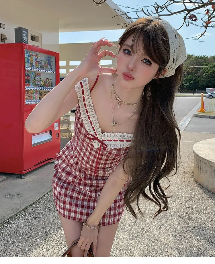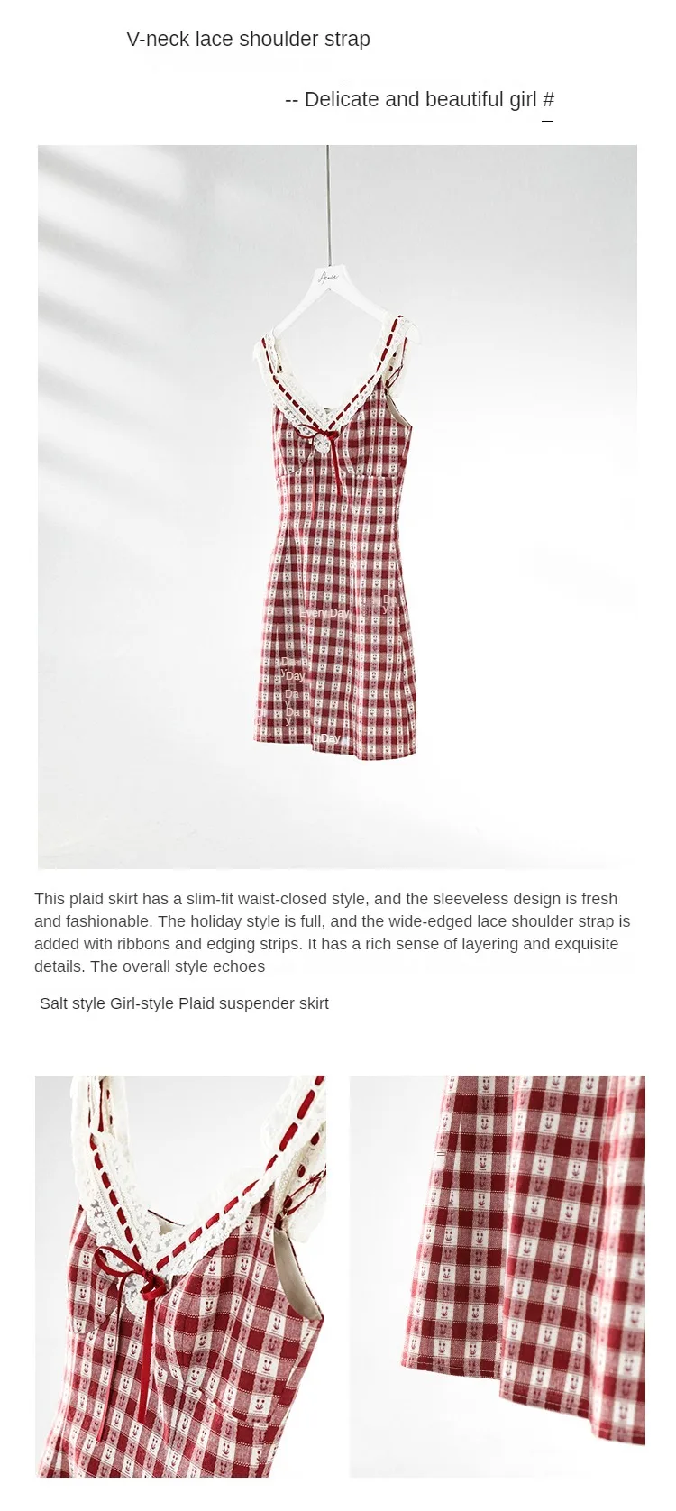 KYLETHOMASW - Lace Suspender Plaid Dress For Women's 2024 Summer New Popular Clothing Korean Fashion Elegant Party High Quality Short Dresses.