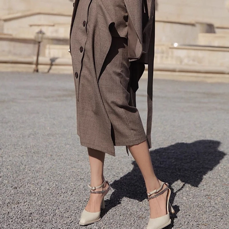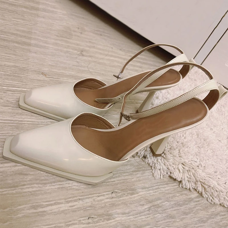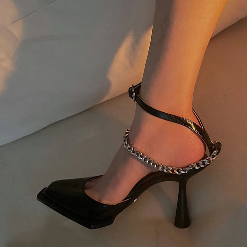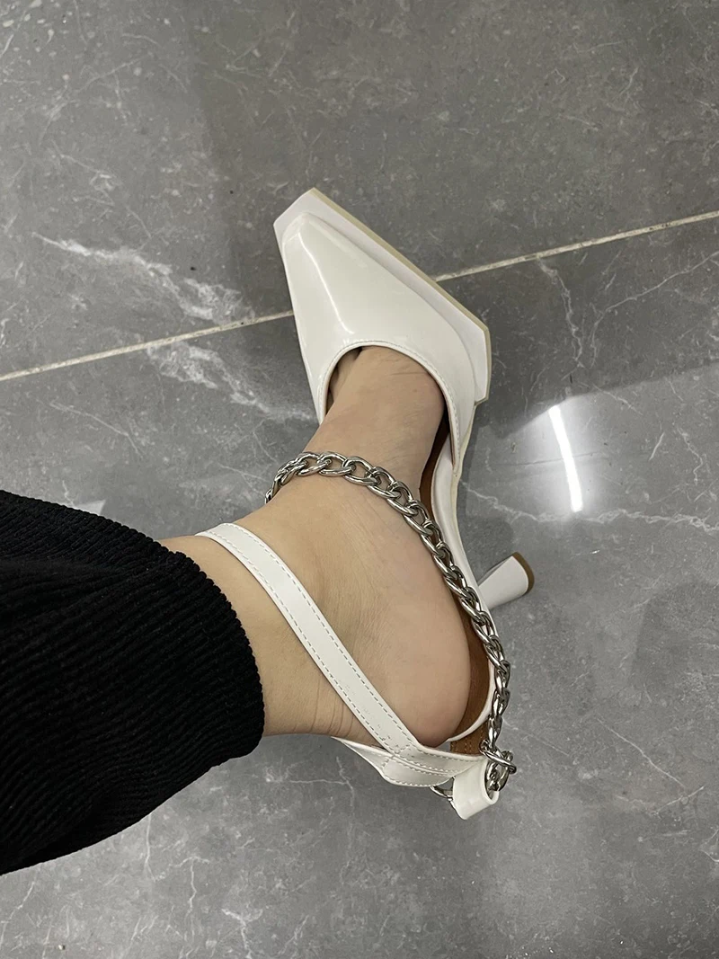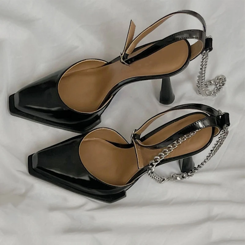 KYLETHOMASW - New Buckle Pointed Toe Sandals Women Metal Chain Sandalias Female Stiletto High Heels Dress Shoes Women Party zapatos de mujer