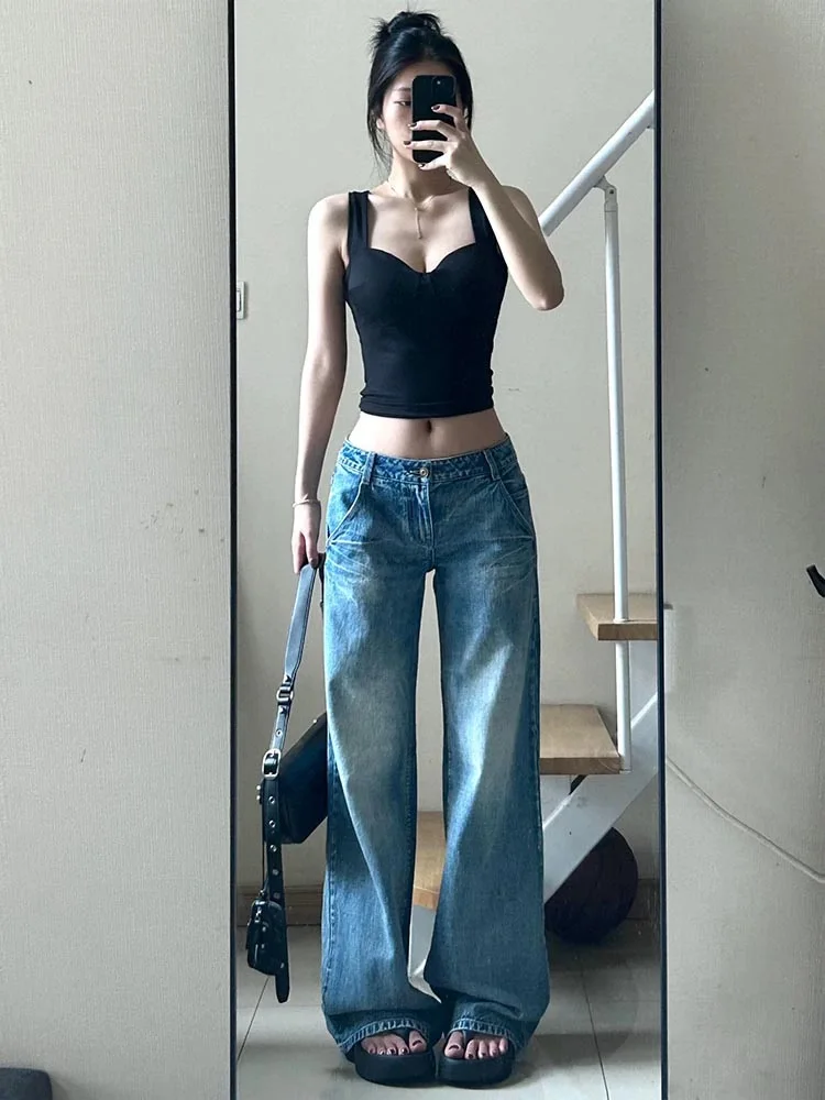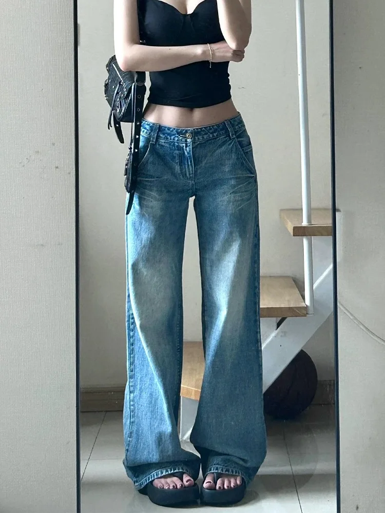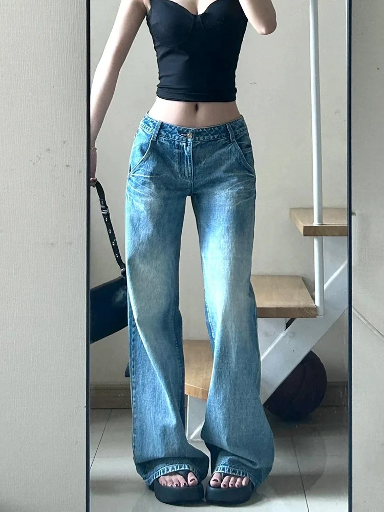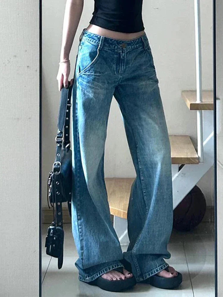KYLETHOMASW  -  New Vintage Washed Distressed Fashion Female Wide Leg Pants American Basic High Waist Loose Casual Straight Simple Women Jeans