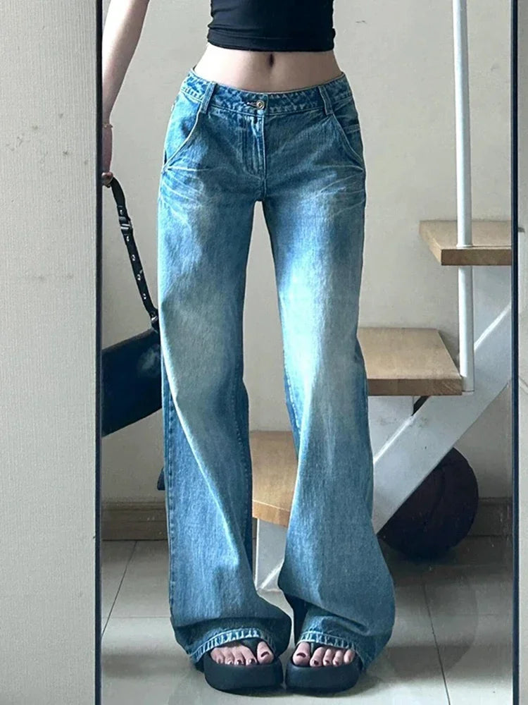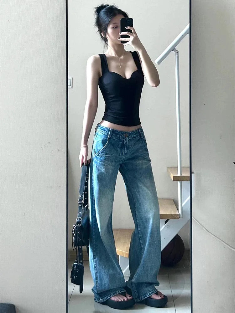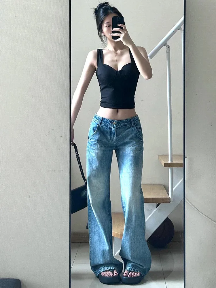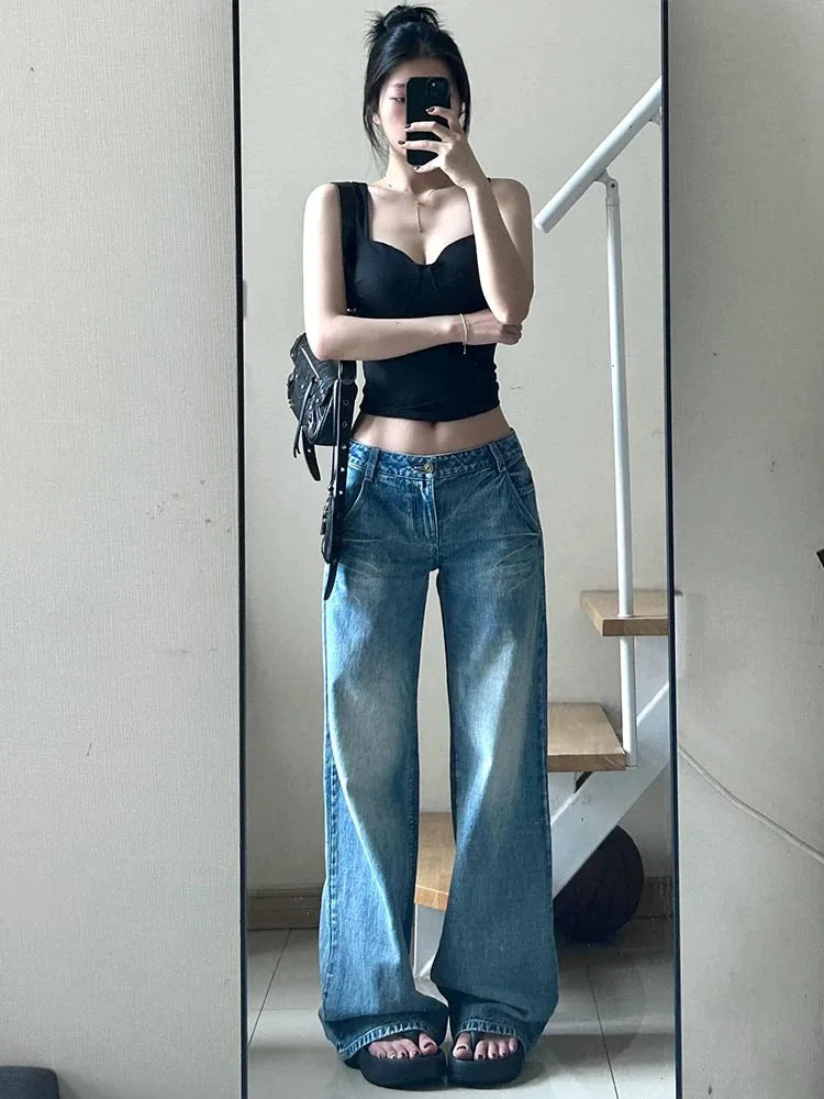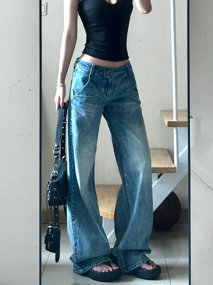 KYLETHOMASW  -  New Vintage Washed Distressed Fashion Female Wide Leg Pants American Basic High Waist Loose Casual Straight Simple Women Jeans
