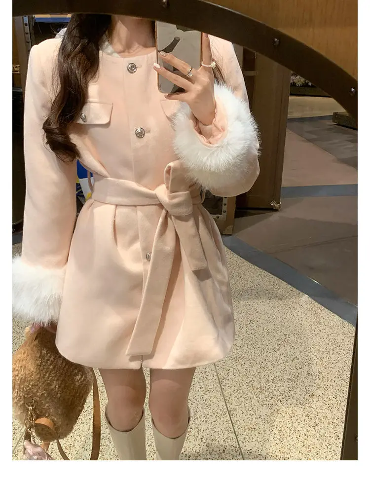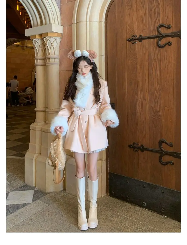 KYLETHOMASW - Pink Wool Coat Women Clothing Winter Coat Thickt Temperament Fur Collar Lace up Slimming A-line Mid Length Top Winter Clothes