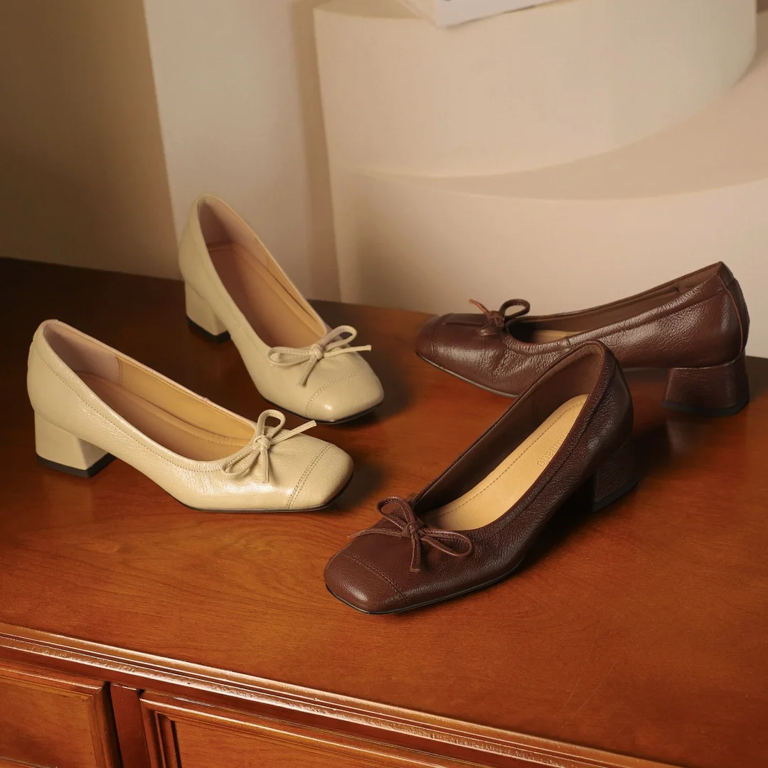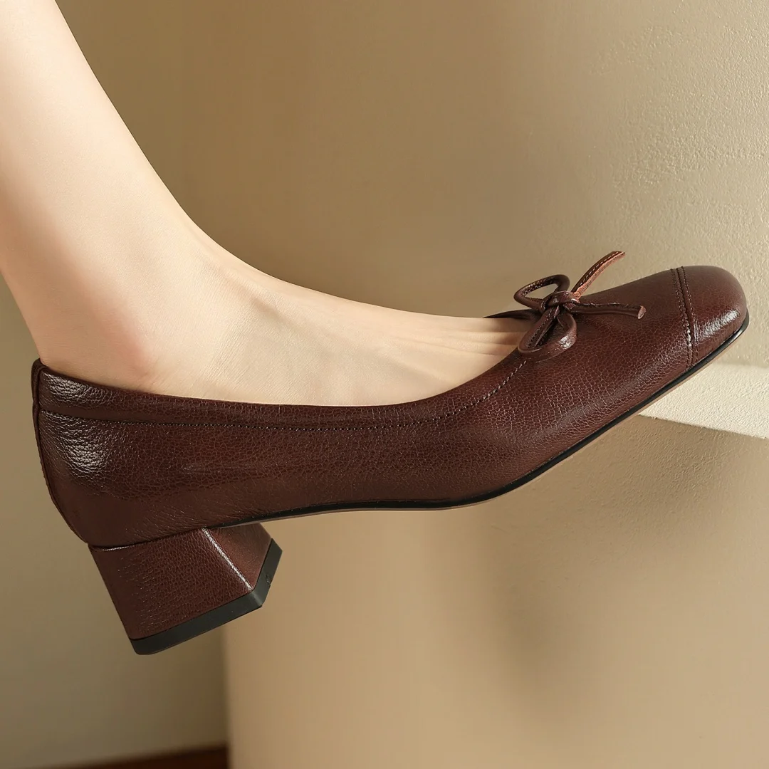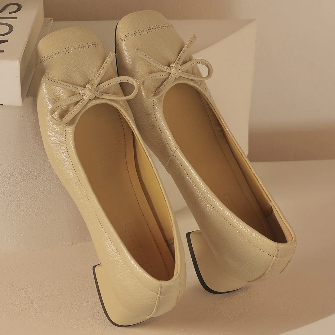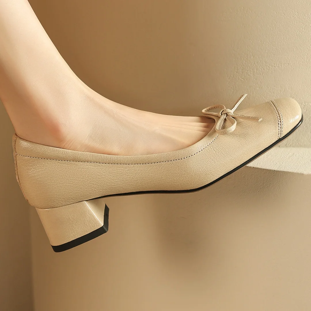 KYLETHOMASW - Plus size 34-41 women's sheepskin slip-on pumps 4cm thick low heel sweet bowtie elegant ladies high quality soft comfort shoes