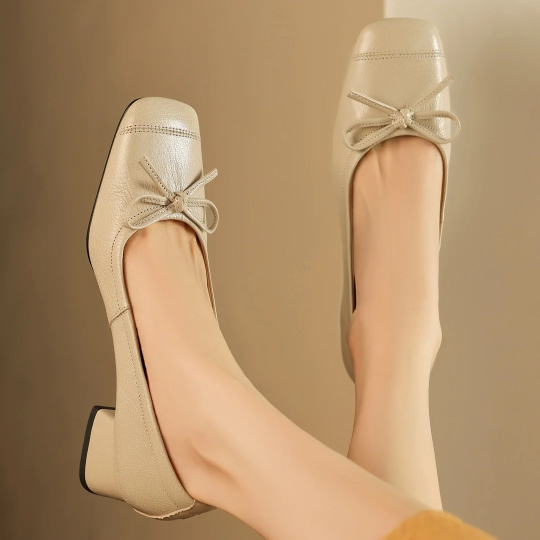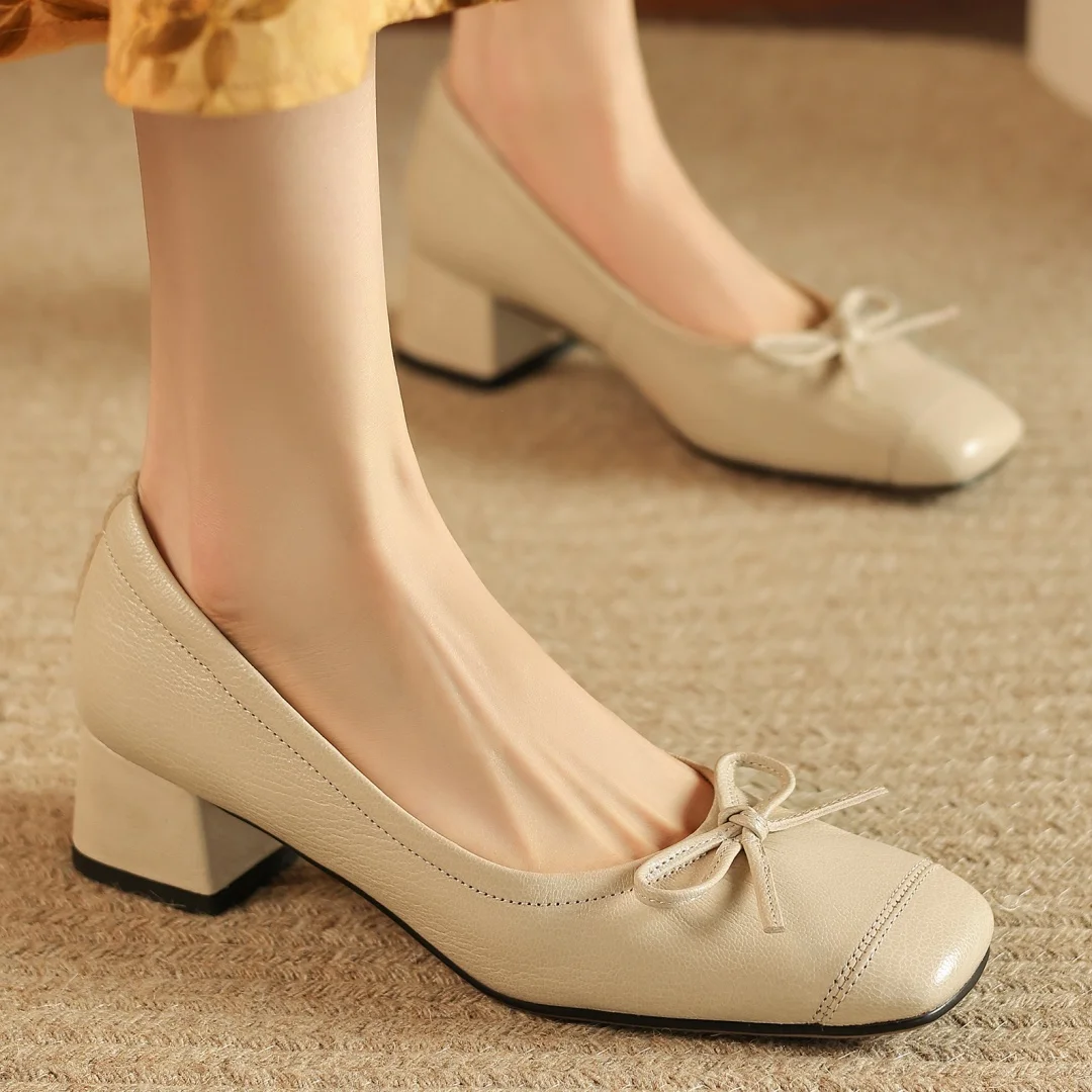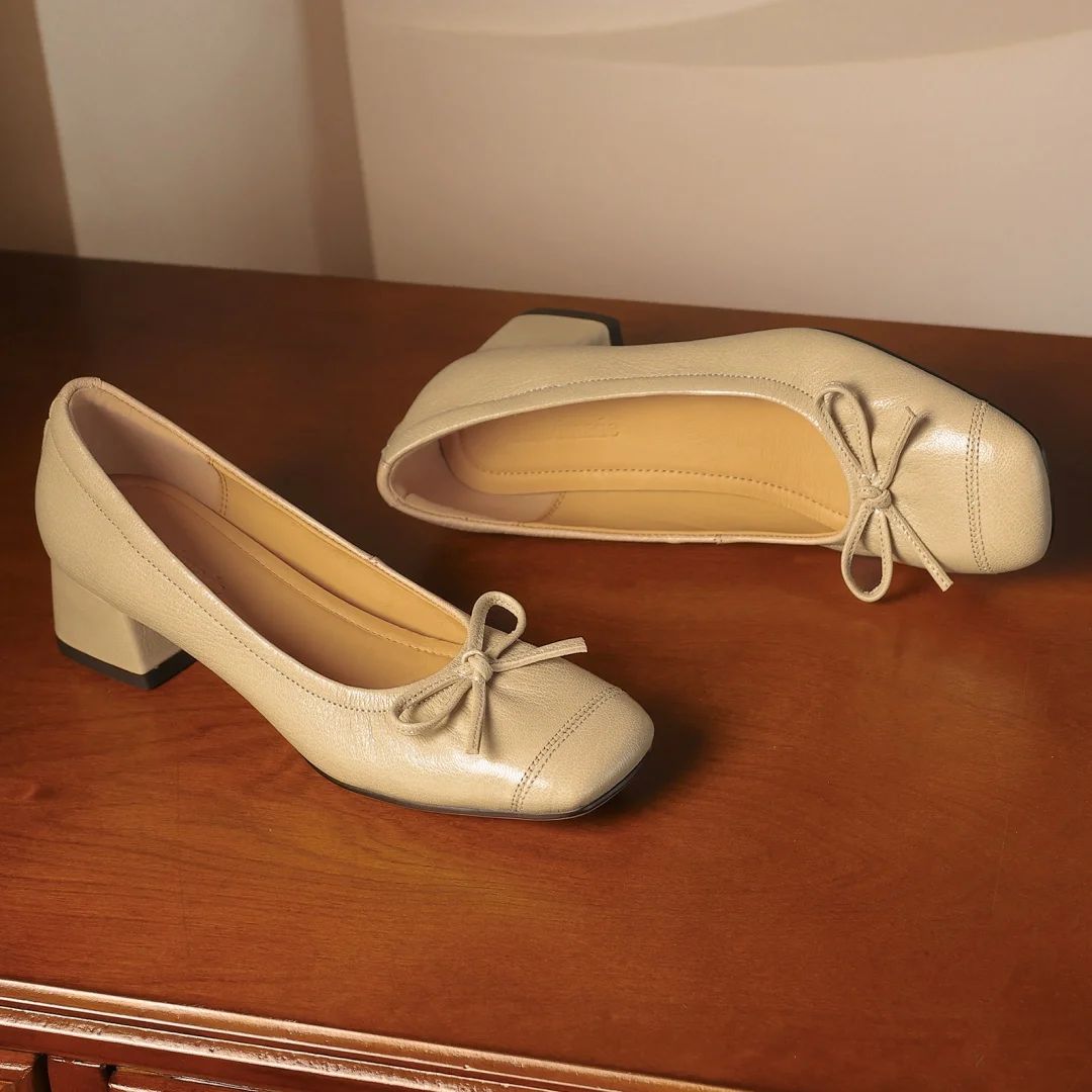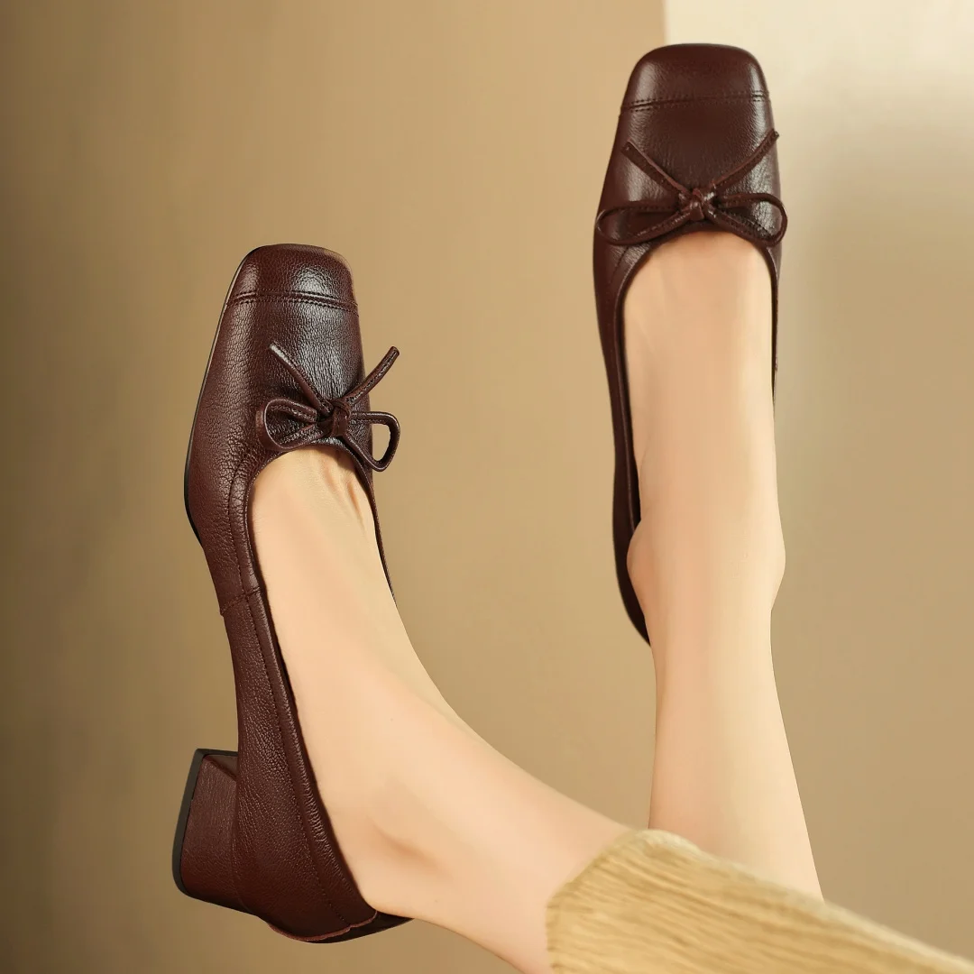 KYLETHOMASW - Plus size 34-41 women's sheepskin slip-on pumps 4cm thick low heel sweet bowtie elegant ladies high quality soft comfort shoes