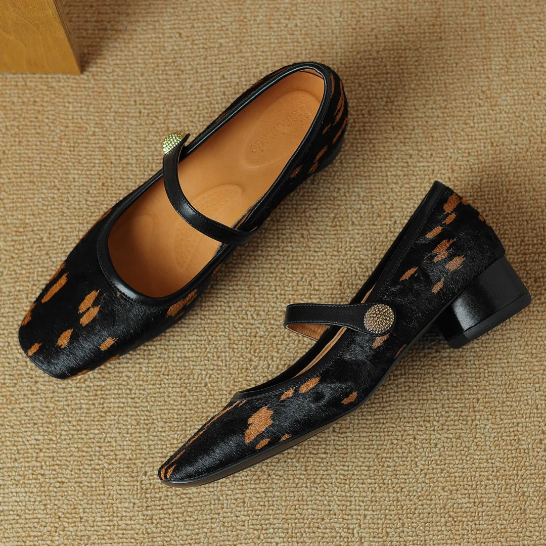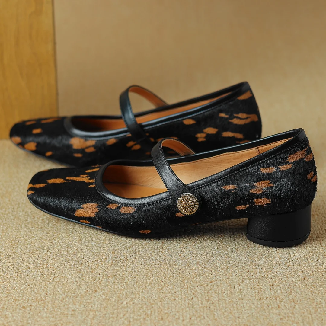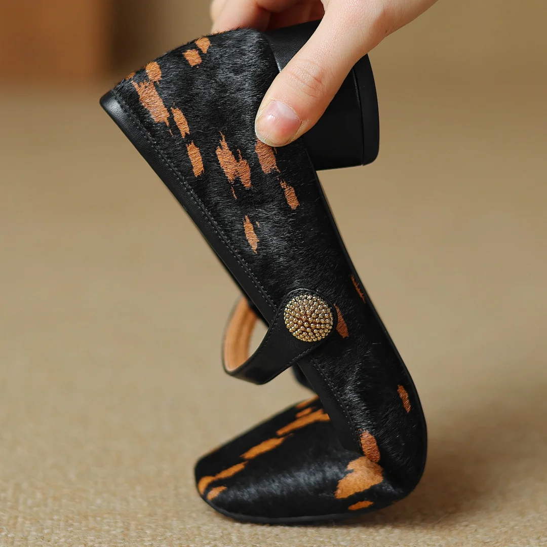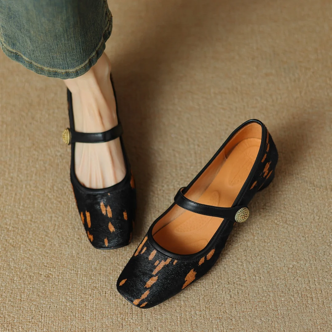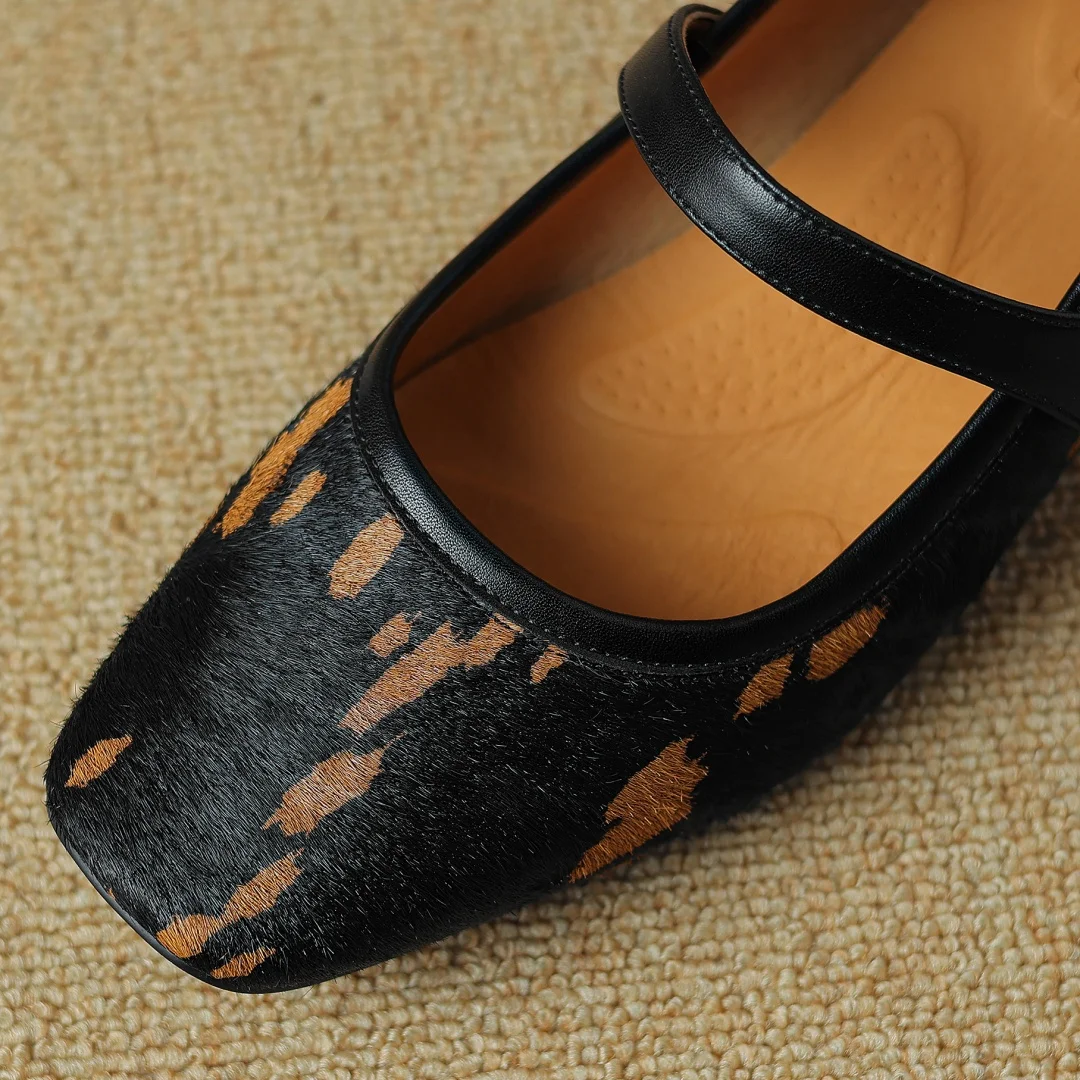 KYLETHOMASW - Plus size 34-42 women's leopard horsehair Mary Jane flats square toe high quality female soft comfortable slim elegant shoes hot