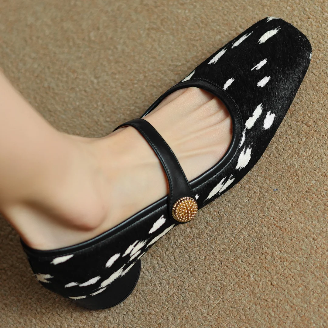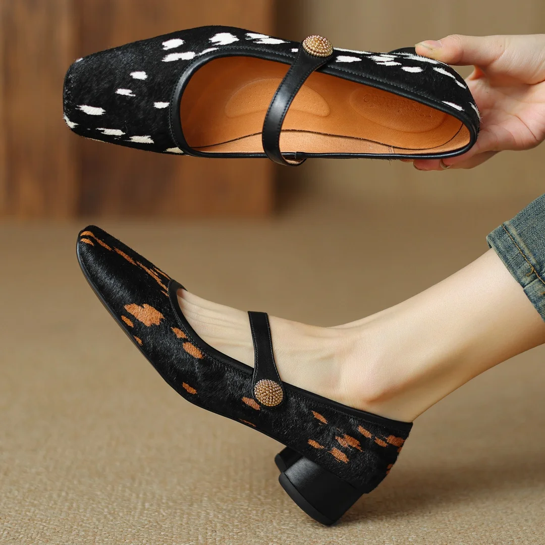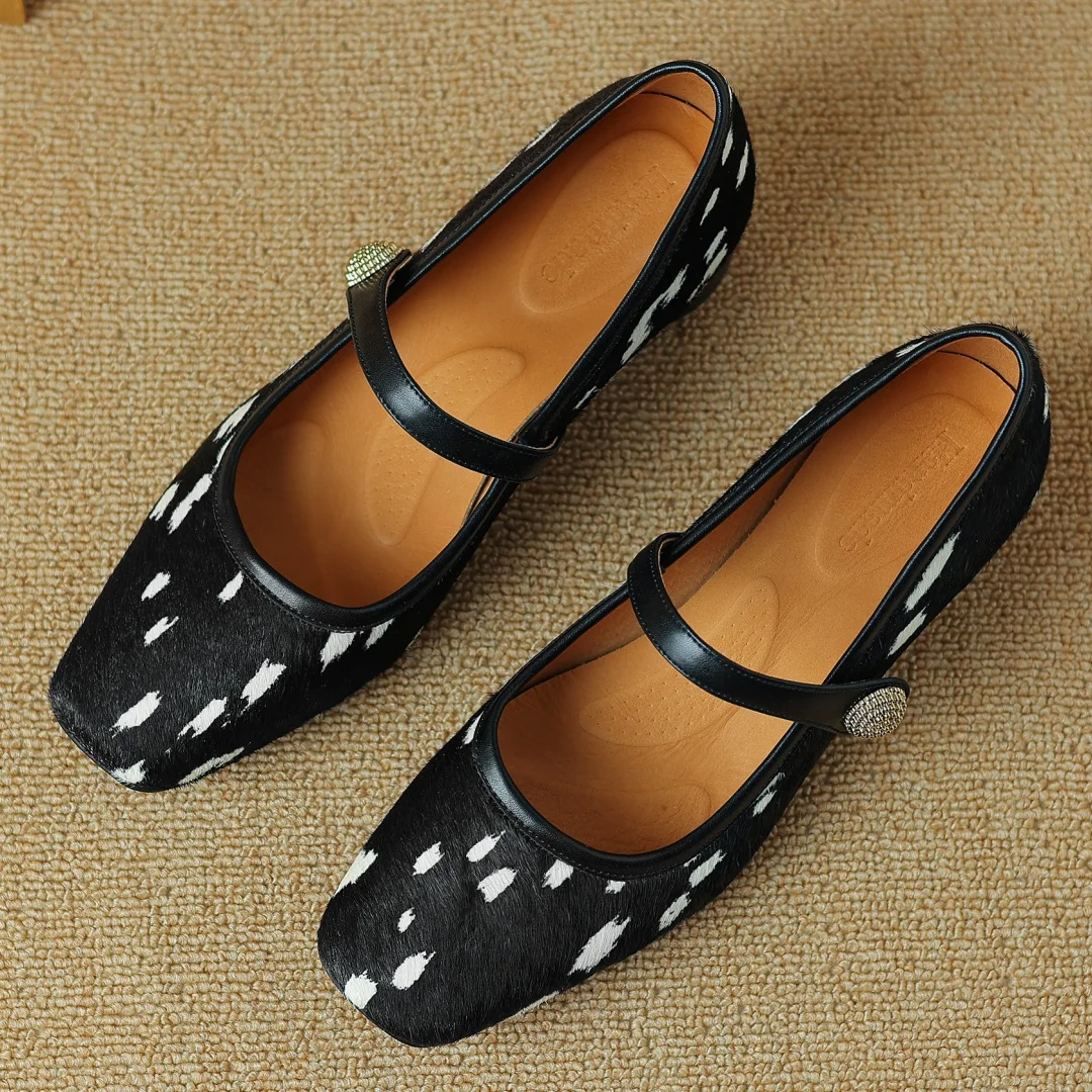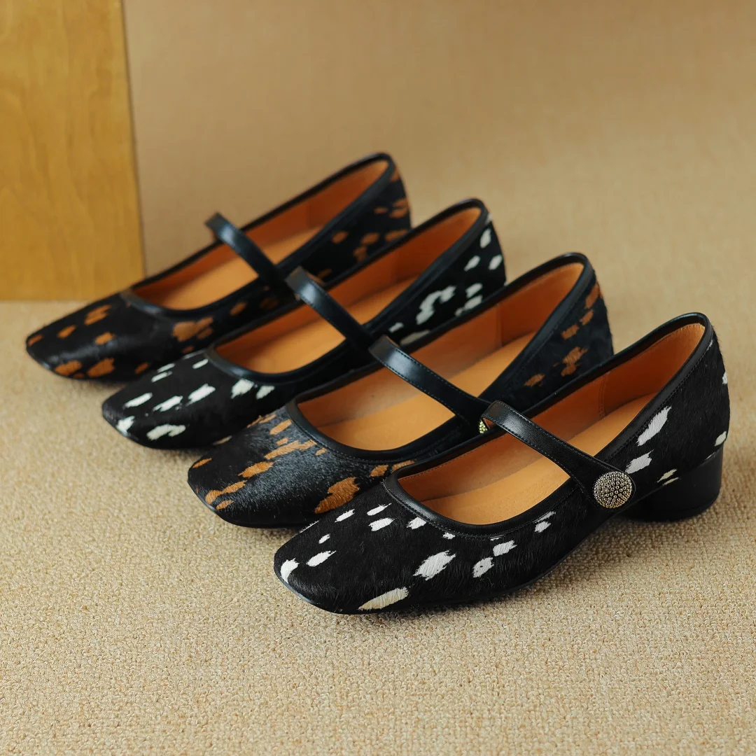 KYLETHOMASW - Plus size 34-42 women's leopard horsehair Mary Jane flats square toe high quality female soft comfortable slim elegant shoes hot