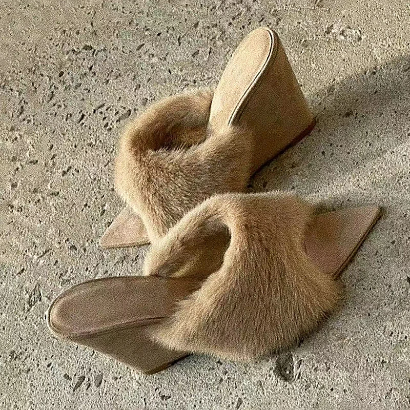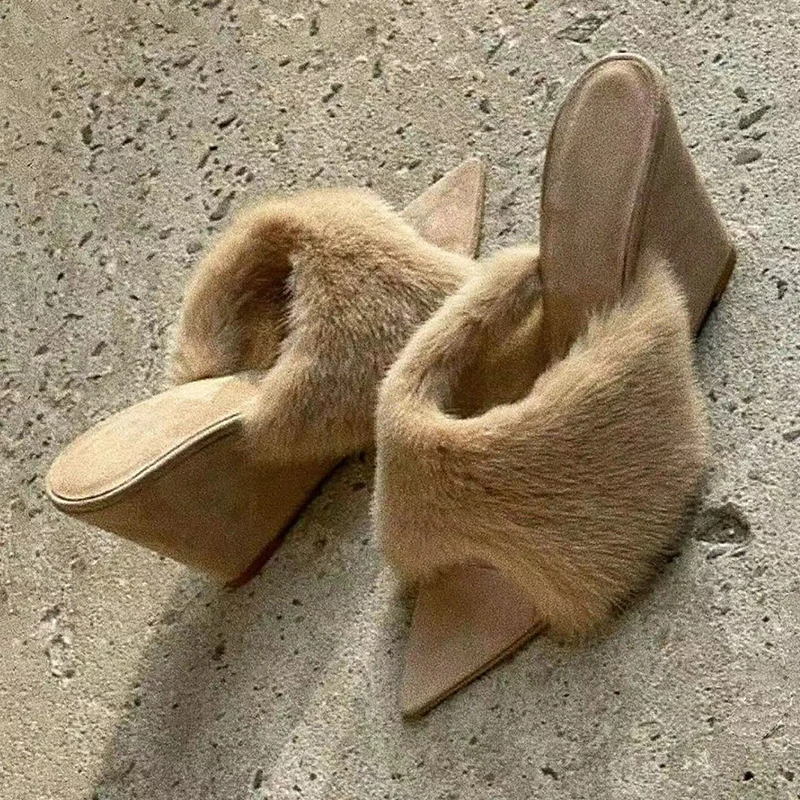KYLETHOMASW - Plush Women's Autumn Slippers French Pointed Open-toed Fluffy Slippers Home Outdoors Fashion Wedge Shoes Women Heels Highquality
