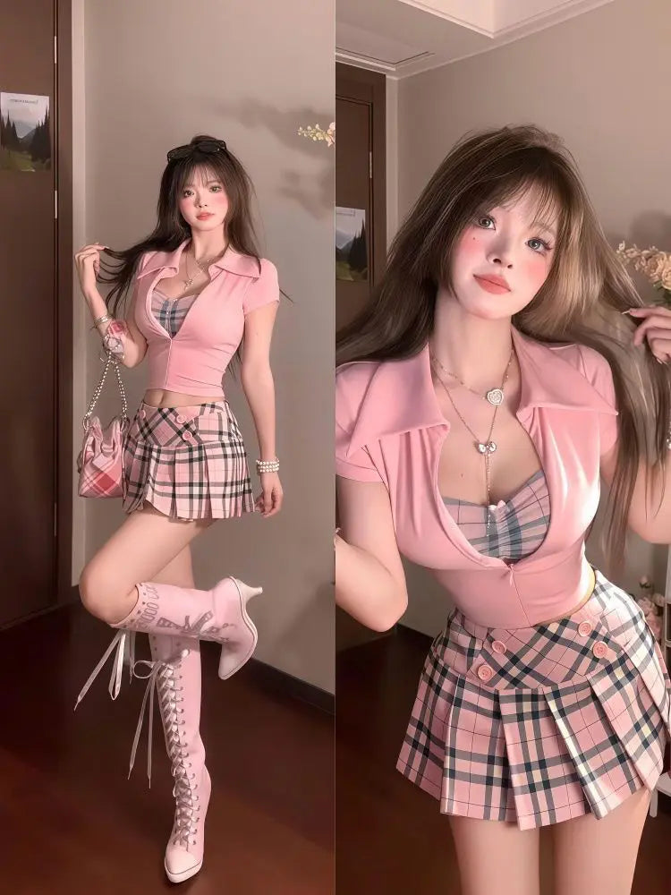 KYLETHOMASW - Preppy Style Women's Summer V-neck Slim Fit T-shirt Short-sleeved High Waisted Plaid Short Skirt Two-piece Set
