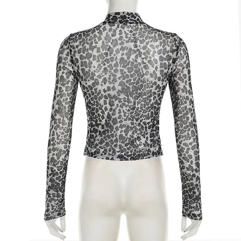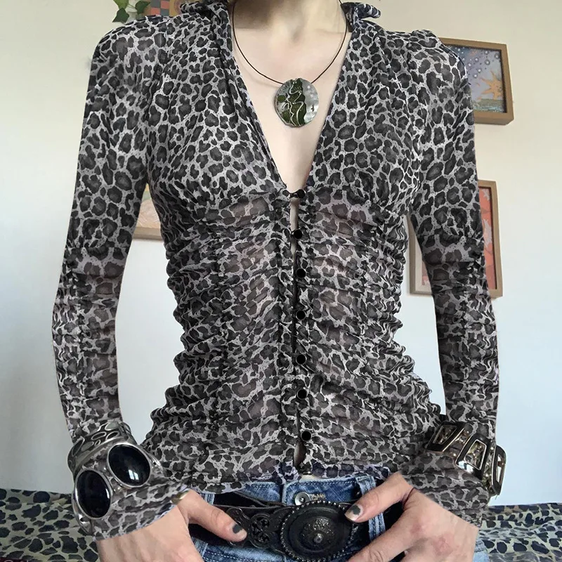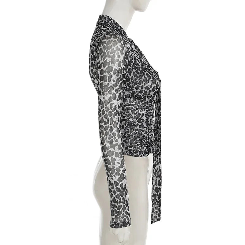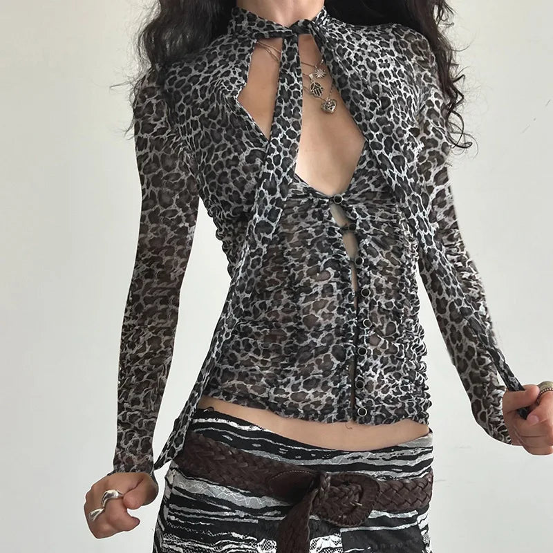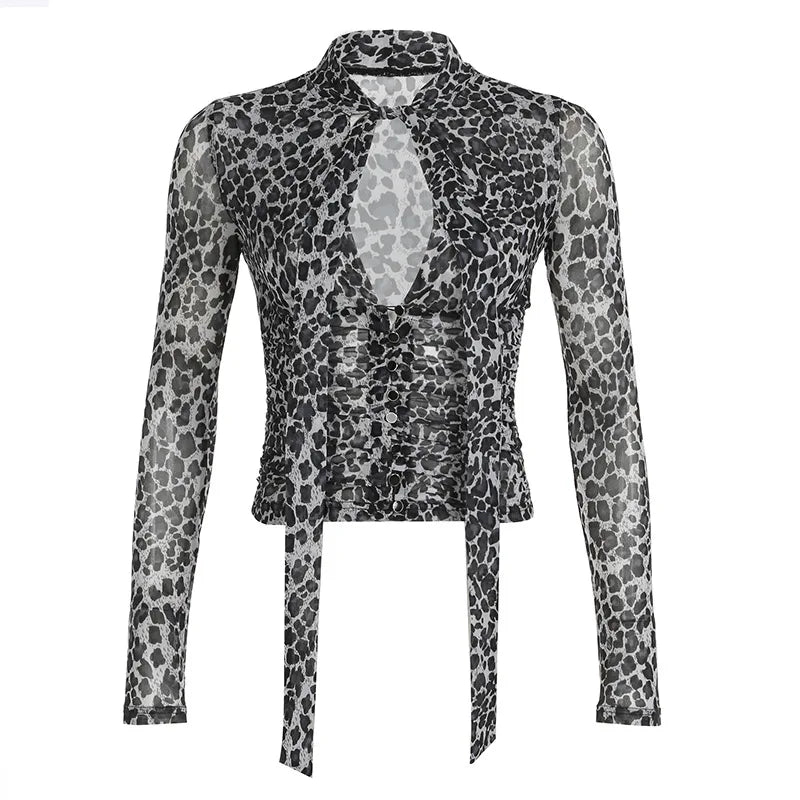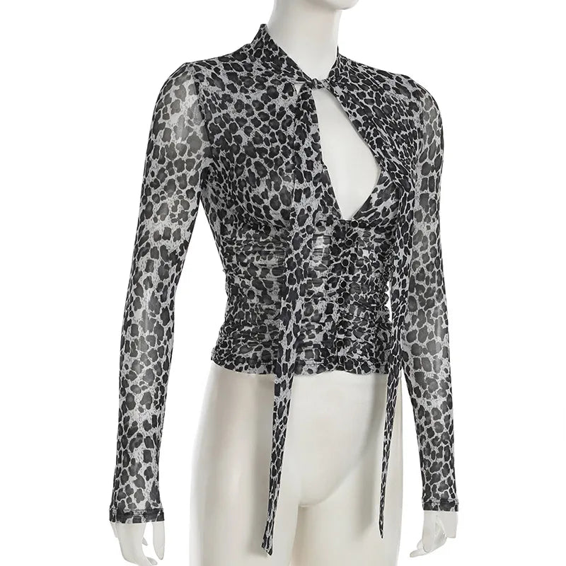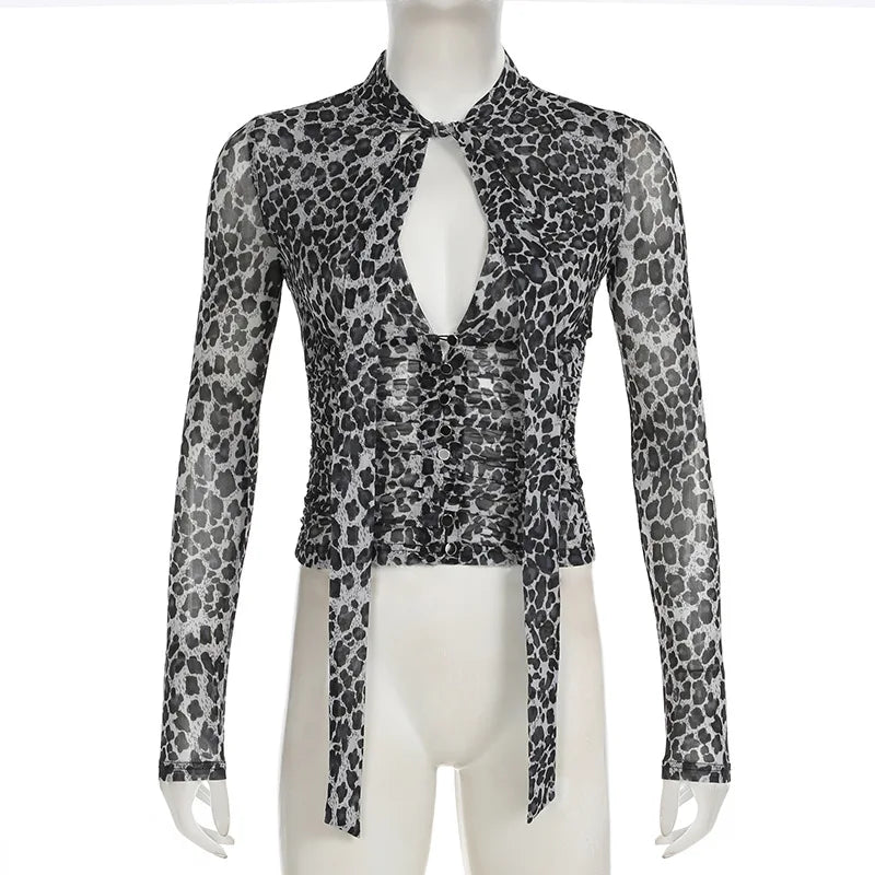 KYLETHOMASW - Printed irregular low cut scarf tie T-shirt pure desire style thin mesh top with breasted mesh