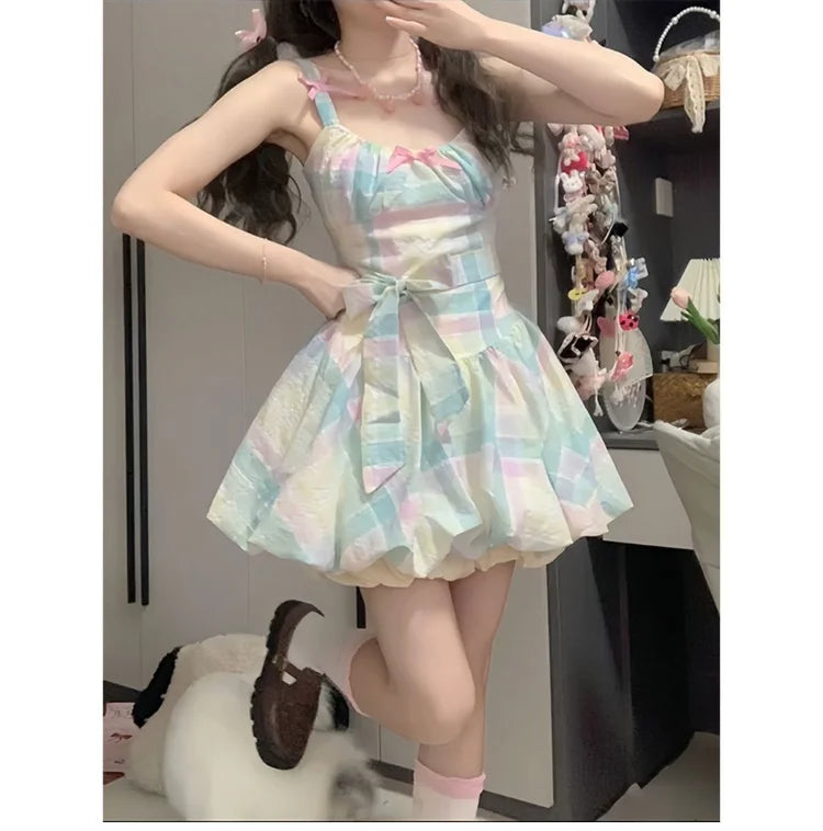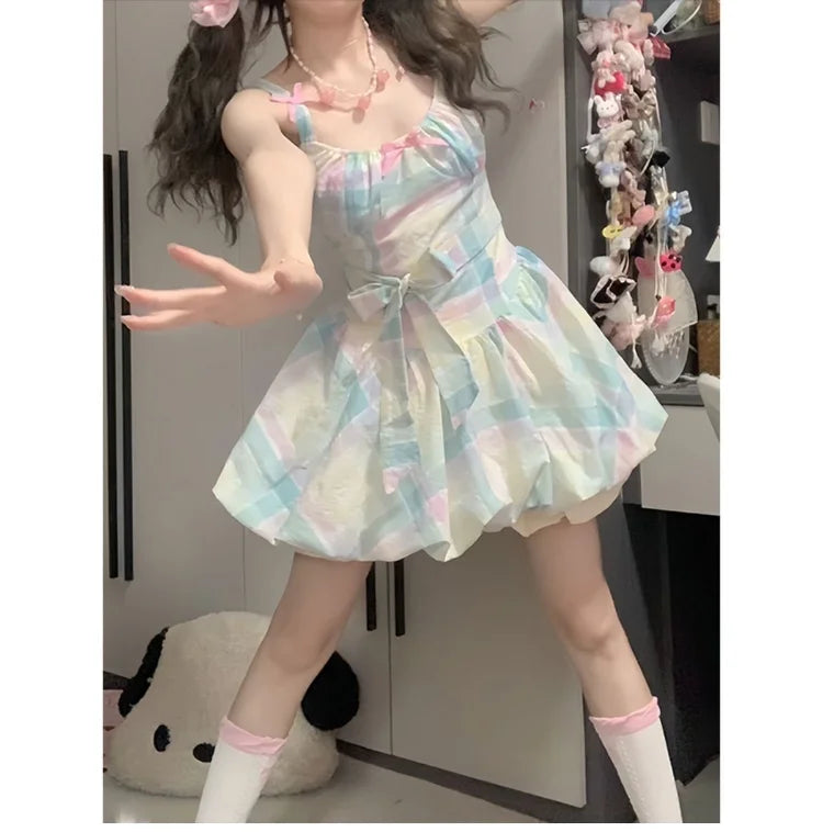 KYLETHOMASW - Rainbow Dresses Women Sweet Sleeveless Bow Slash Neck Sweet Elegant Summer Fashion Bud Mini Dress Female Casual Party