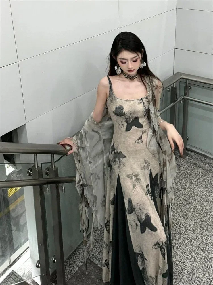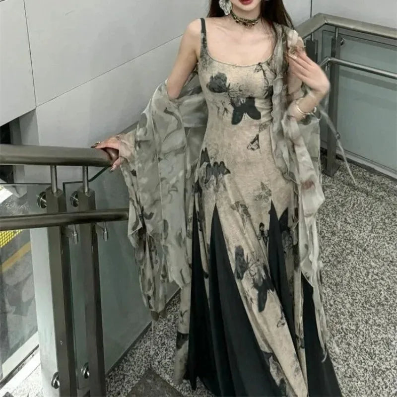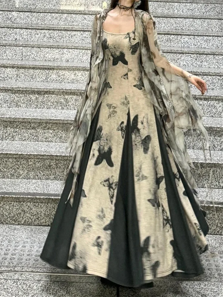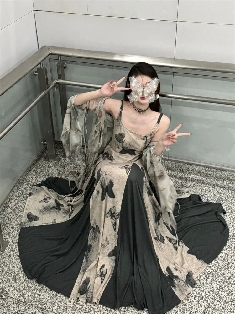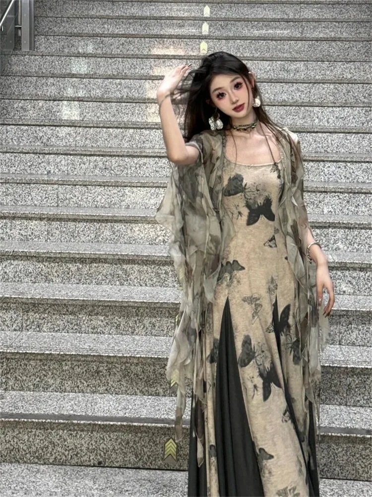 KYLETHOMASW  -  Retro Butterfly Print Patchwork Camisole Dress for Women+ Thin Long Sleeve Loose Cardigan 2025 Summer New Two Piece Sets