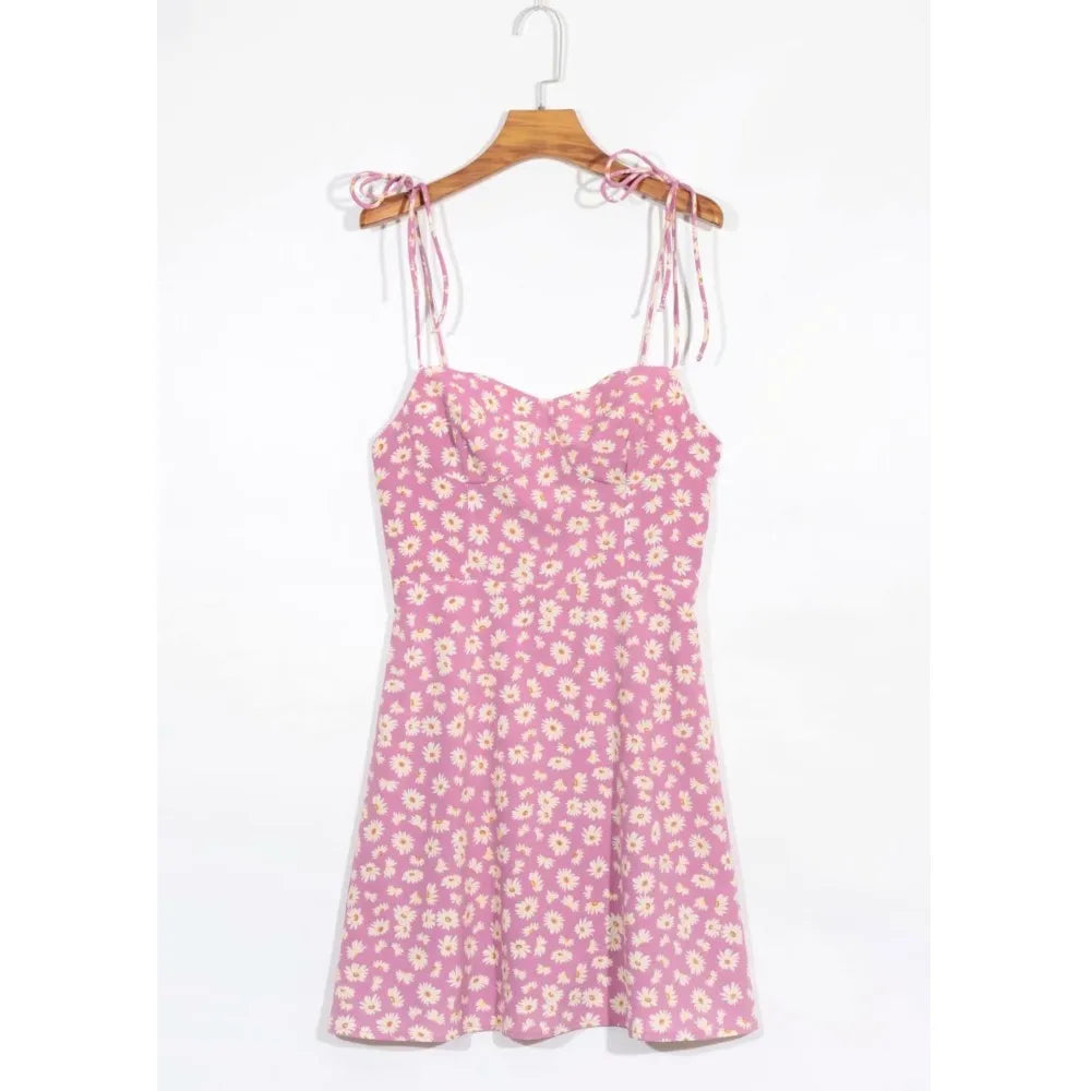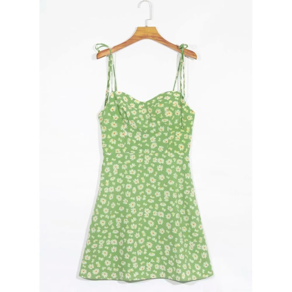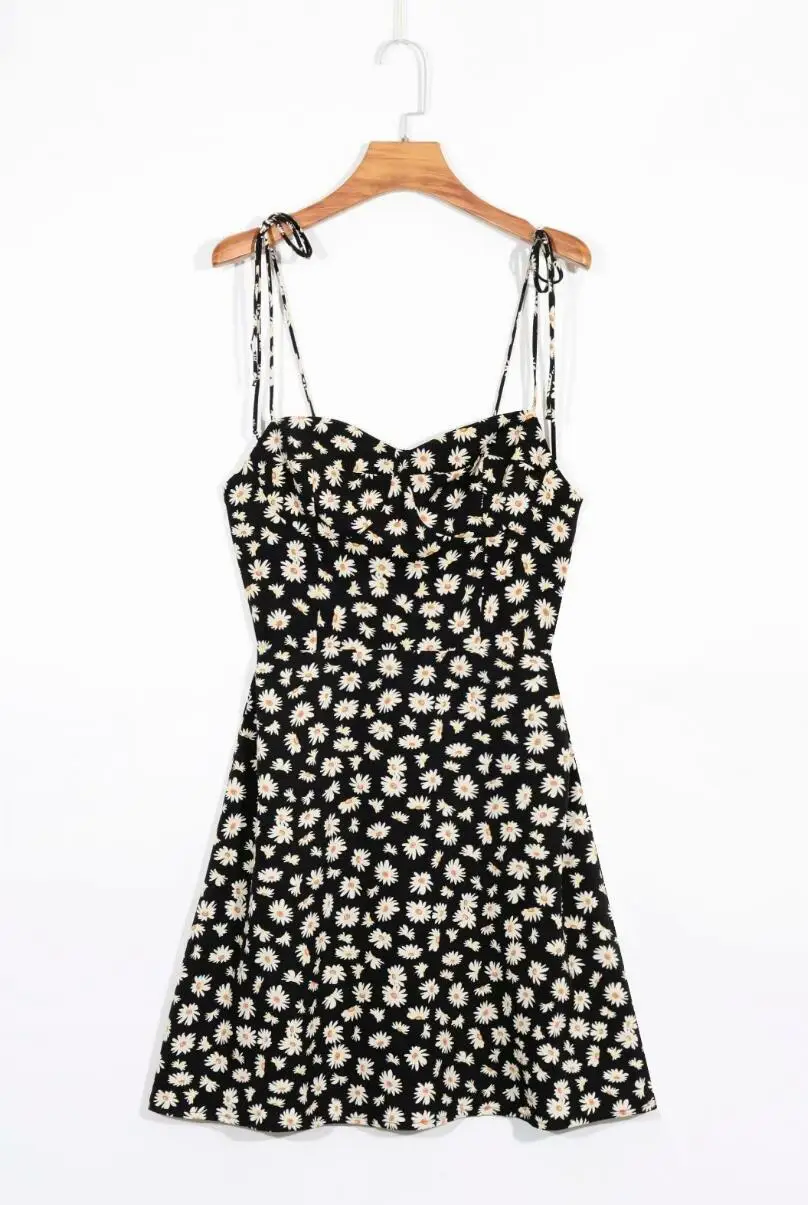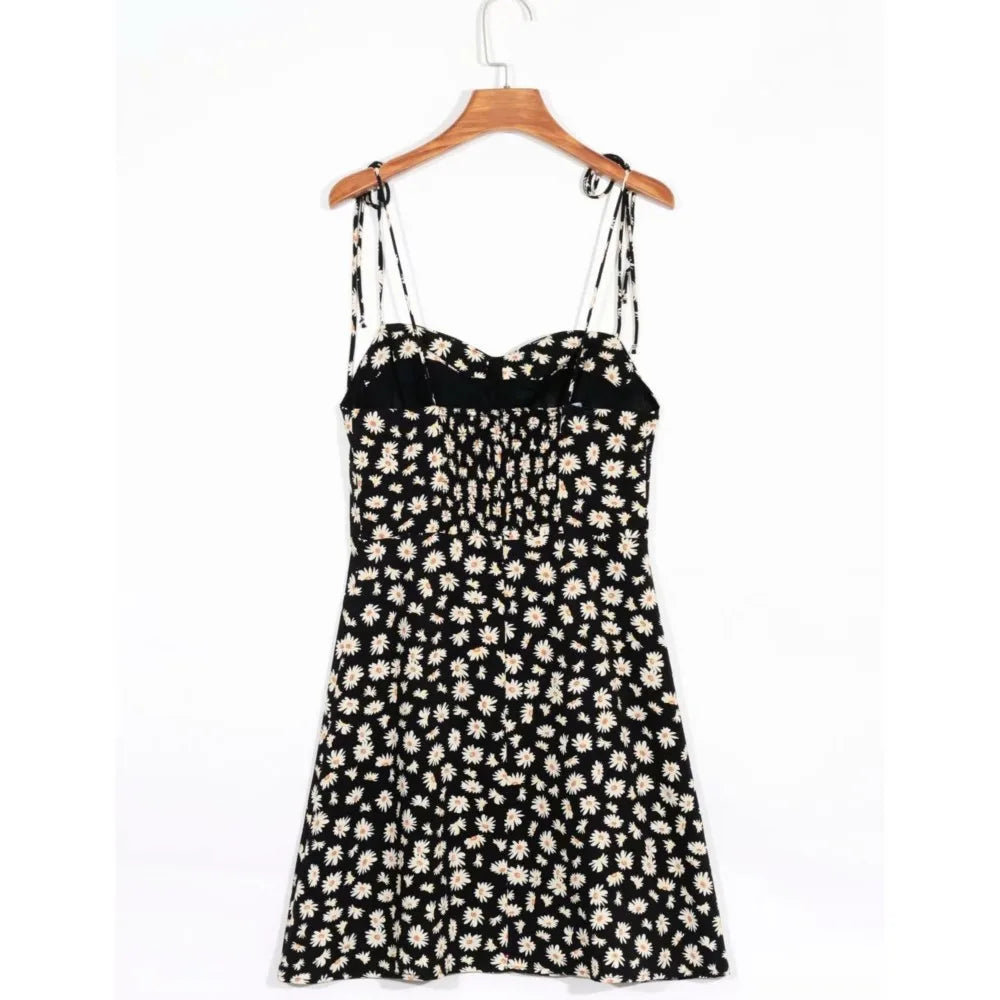 KYLETHOMASW - Retro Daisy Flower Print Bandage Spaghetti Strap Dress Retro Sexy Women Slim Bow Lacing Up Sling Dresses Holiday Robe