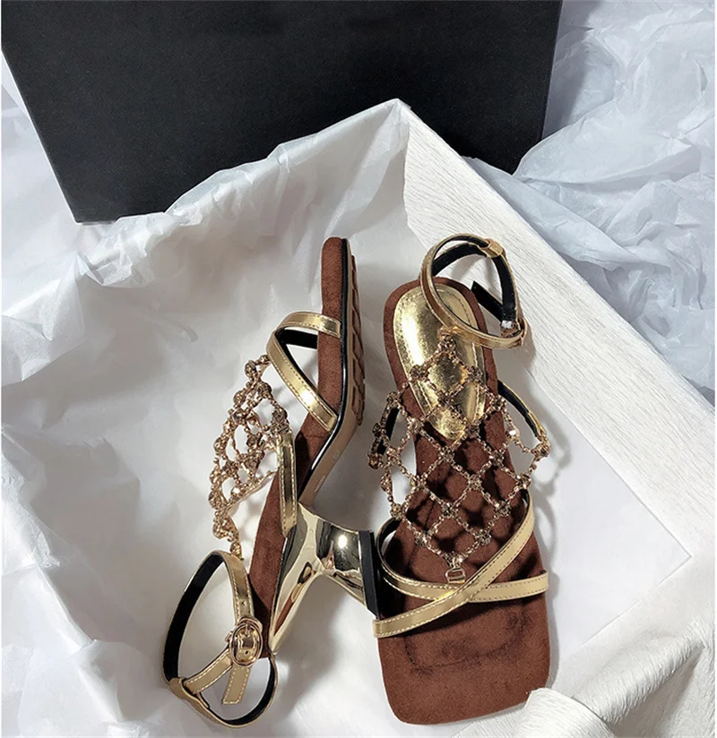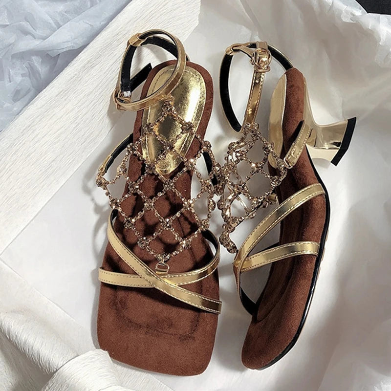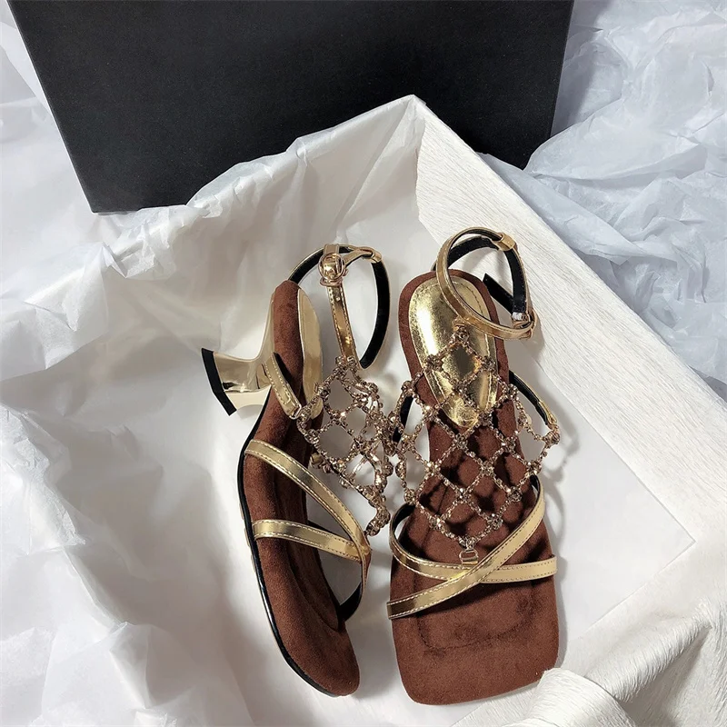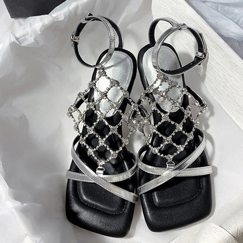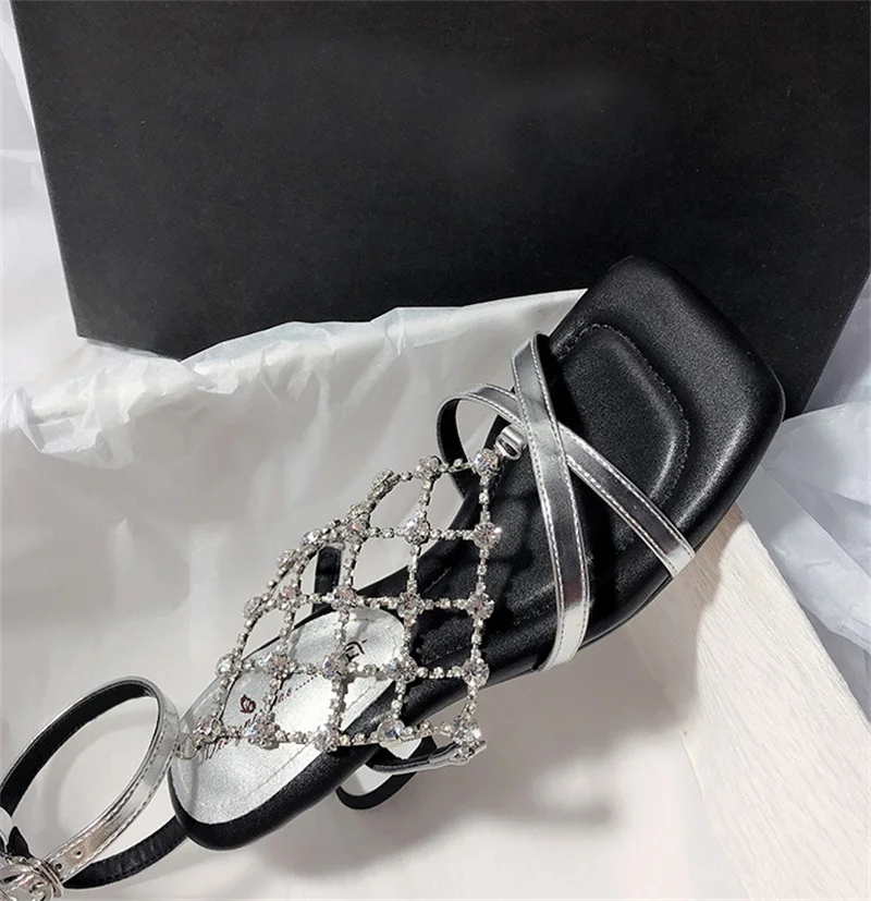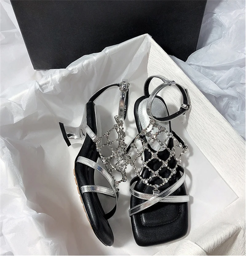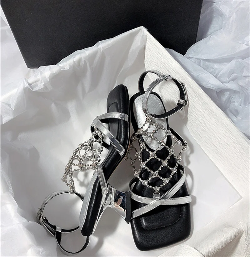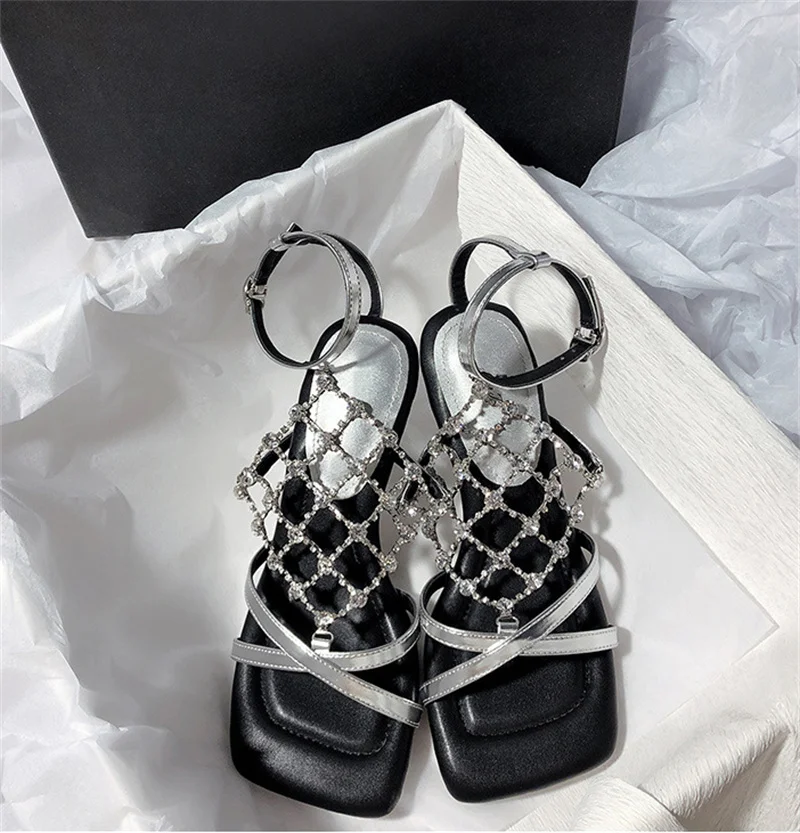KYLETHOMASW - Roma Style Hollow Out Crystal Mesh Women Sandals Cozy Square Open Toe Strange Low Heels Shoes Summer Gladiator Sandalias