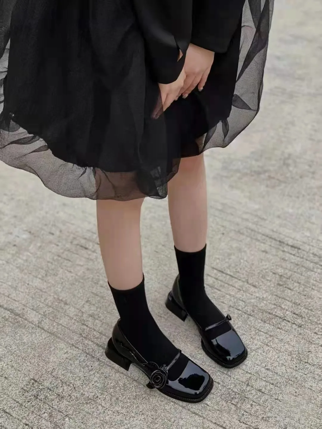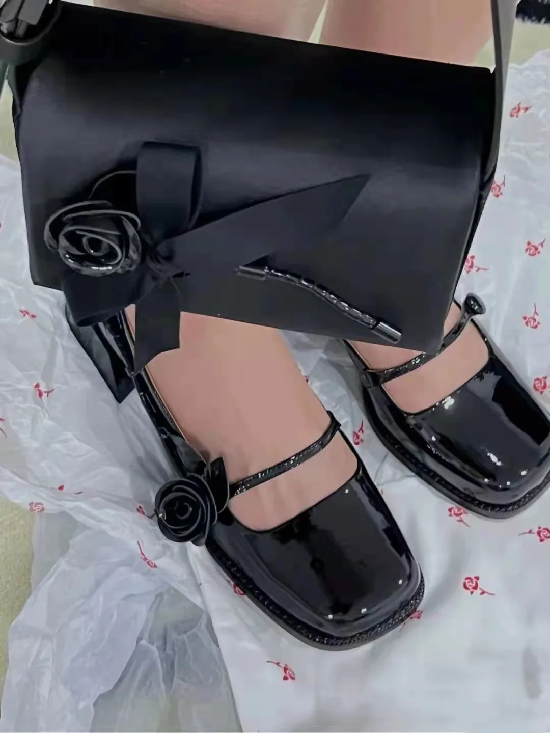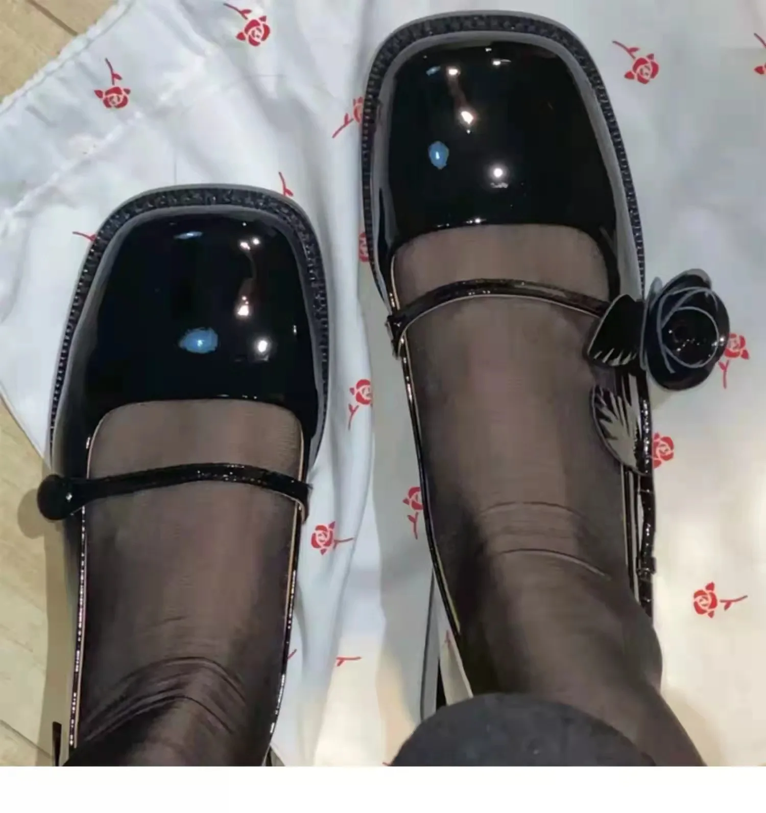 KYLETHOMASW  -  rose flower patent leather shoes woman brand designer sqaure toe pumps female thick heel button strap mary janes talons hauts
