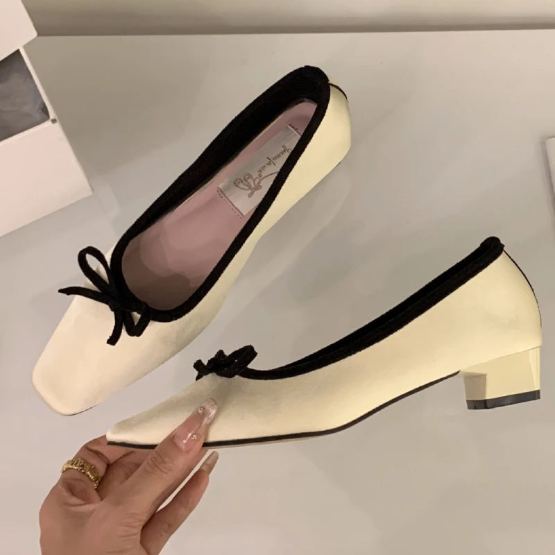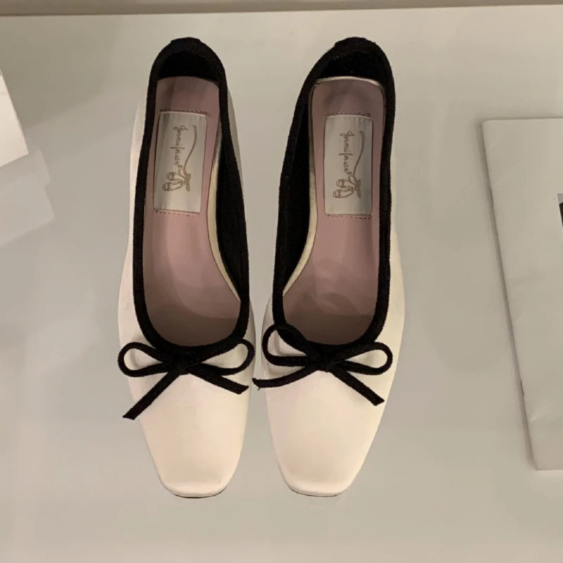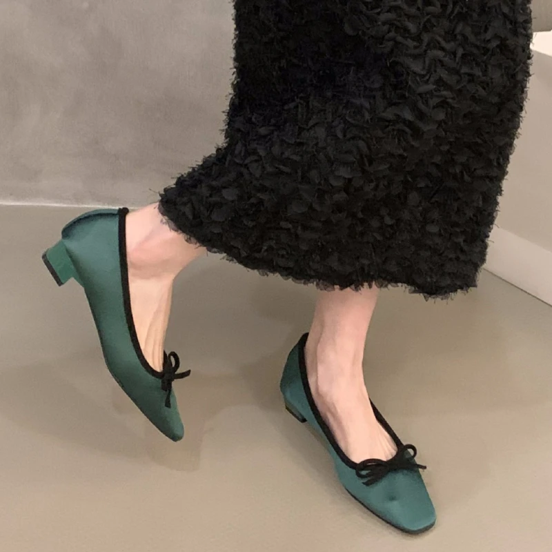 KYLETHOMASW - Satin Round Toe Bowknot Womens Flat Shoes Vintage Brand Designe Open Heel Sweet Party Dress Fashion Square Heel Women Loafers