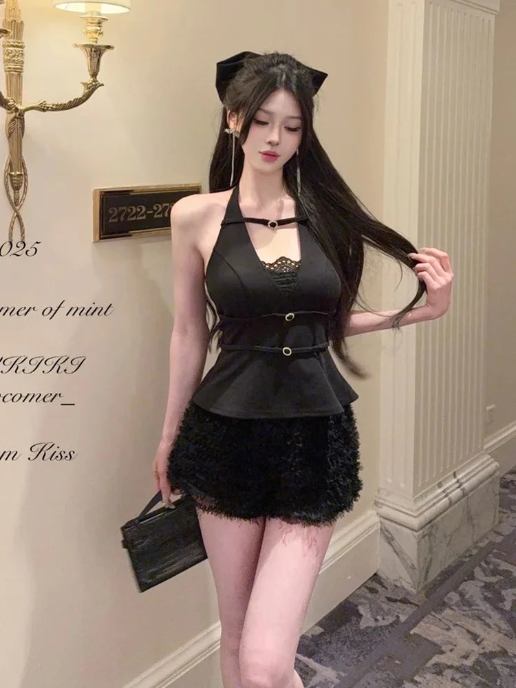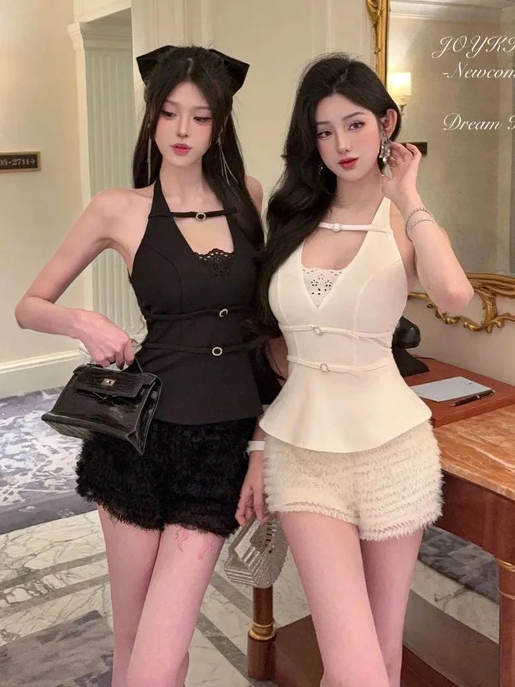 KYLETHOMASW - Sexy Set Women's Metal Buckle Halter Neck Top High Waist Shorts Two-piece Set Fashion Female Clothes