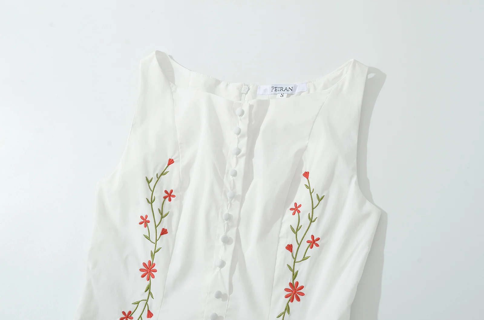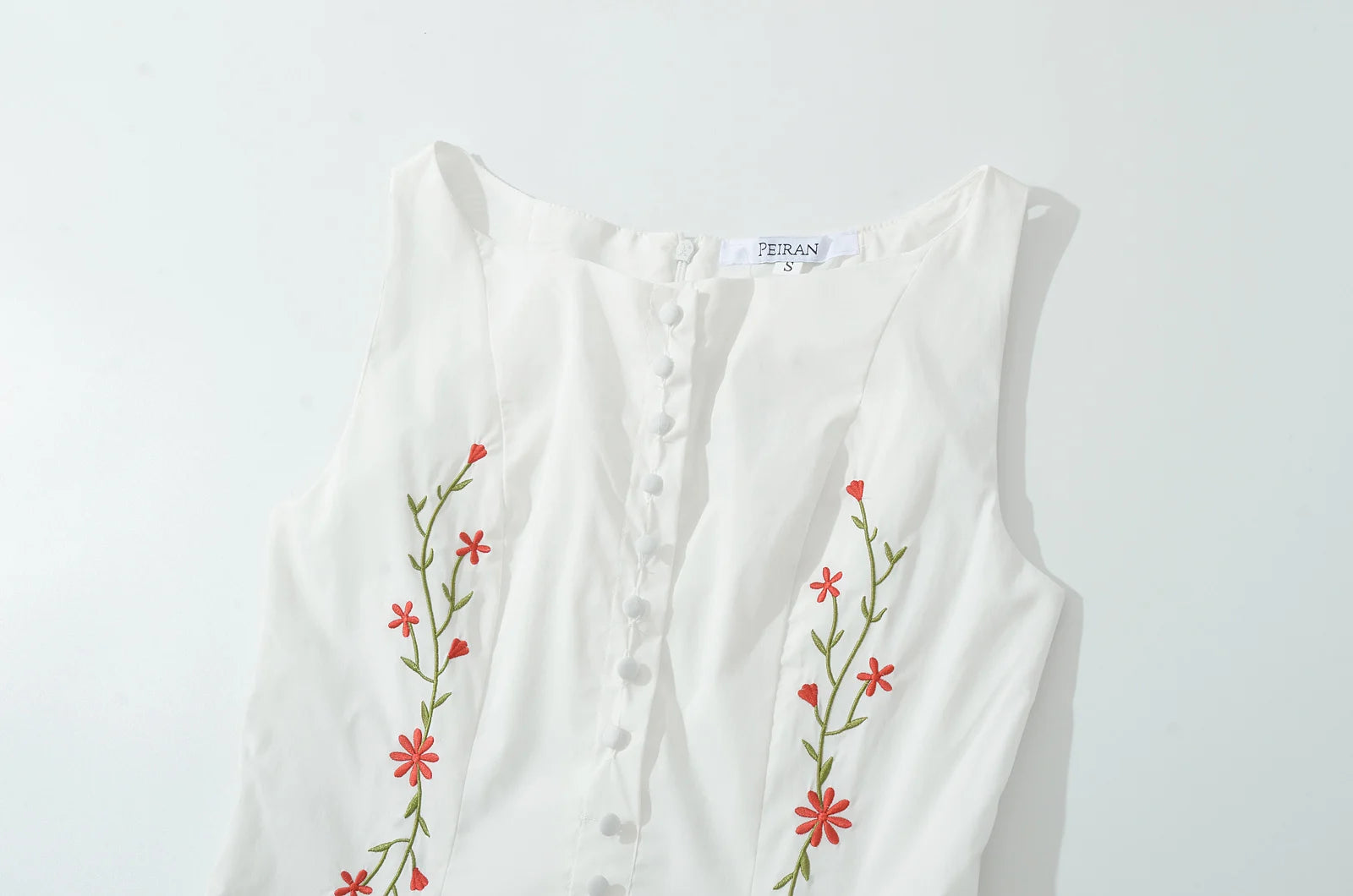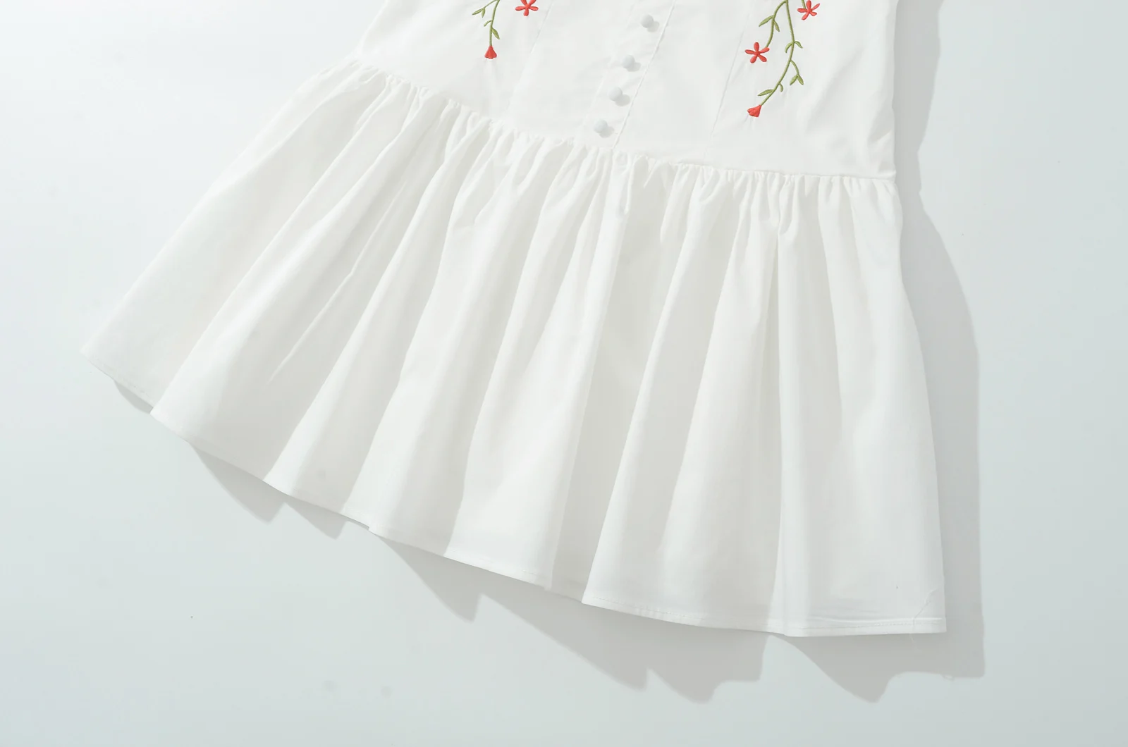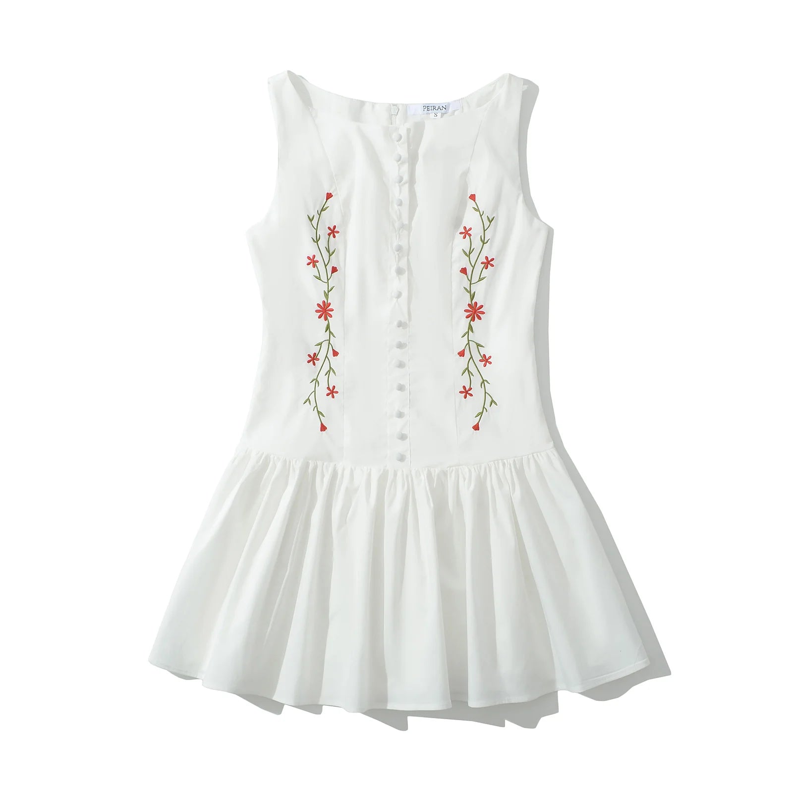 KYLETHOMASW - Sexy White Embroidery Floral Low Waist Mini Tank Dress Women Open Buttons Neck Bodycon Sleeveless Ruched Hem Swing Party Robe