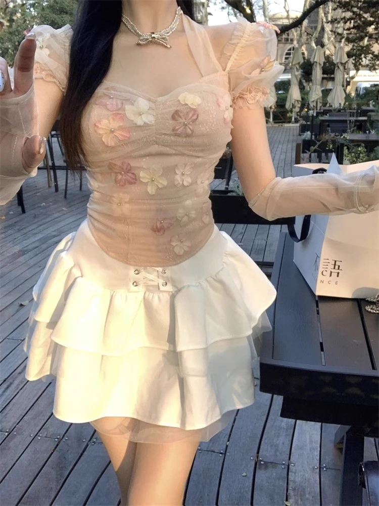 KYLETHOMASW - Shirts Women Flowers Lace Patchwork Bandage Suqare Collar Slim Short Sleeve Sweet Elegant Blouse Sweet Sexy Crop Tops