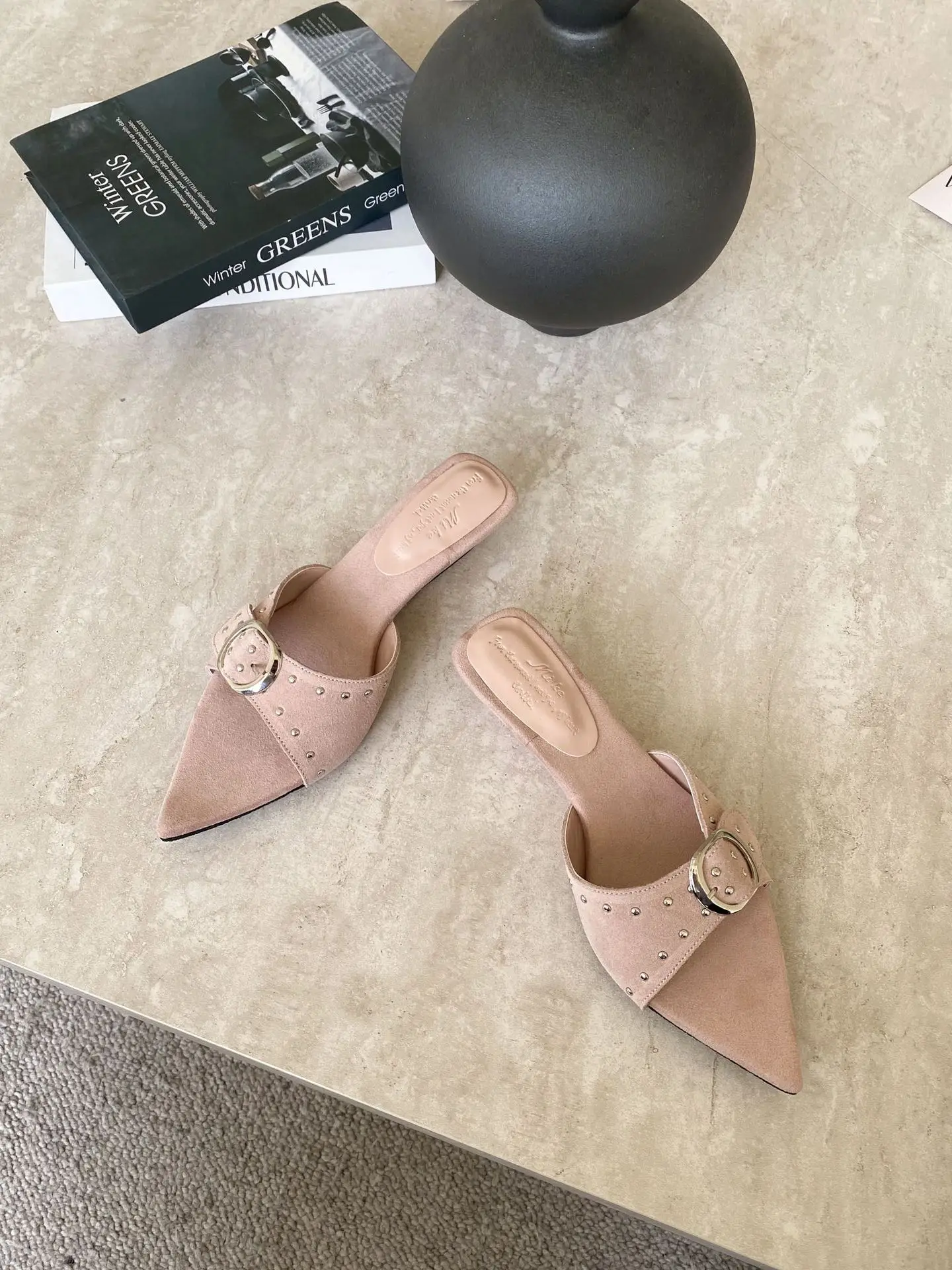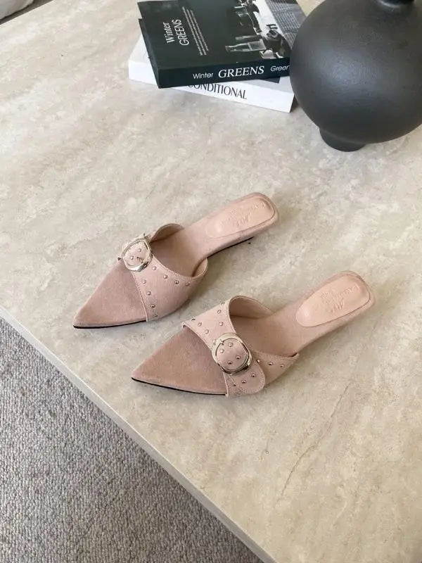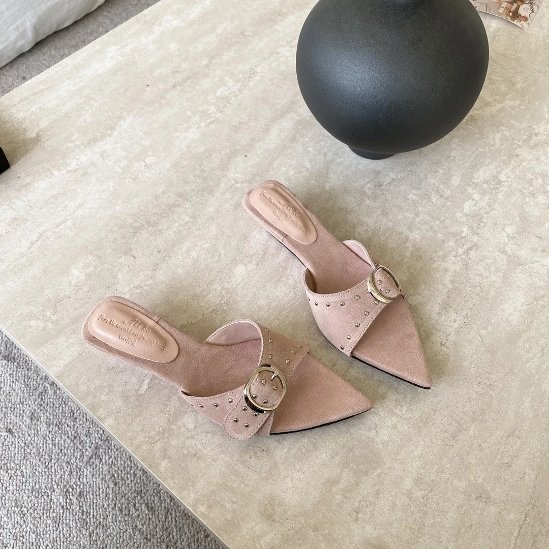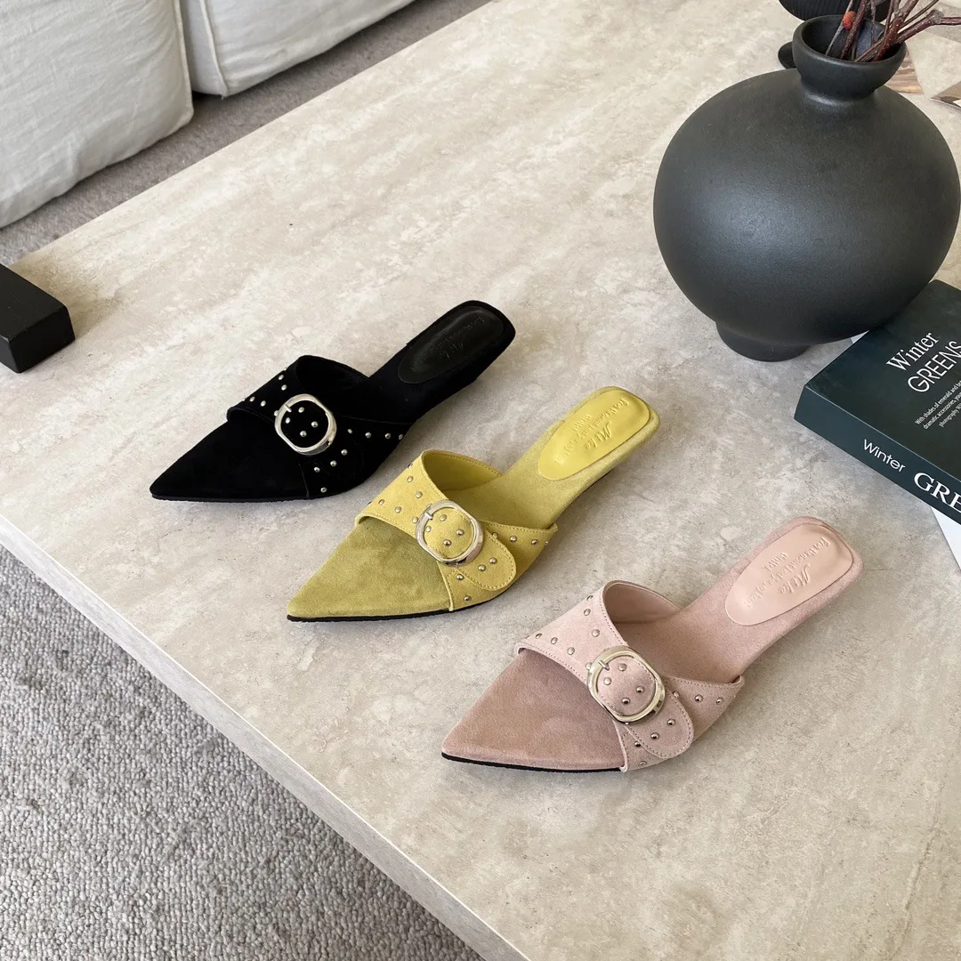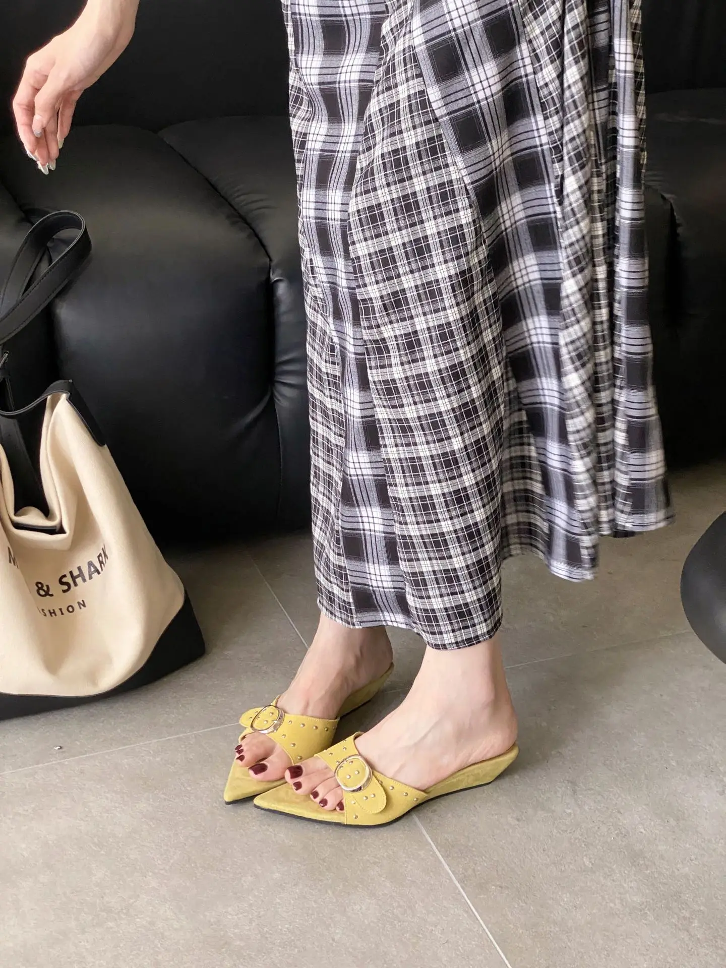 KYLETHOMASW - Shoes Woman 2025 Pointed Toe Slippers Summer Rivet Luxury Slides On A Wedge Low Flock Designer Rome Hoof Heels Fabric Rubber Fas