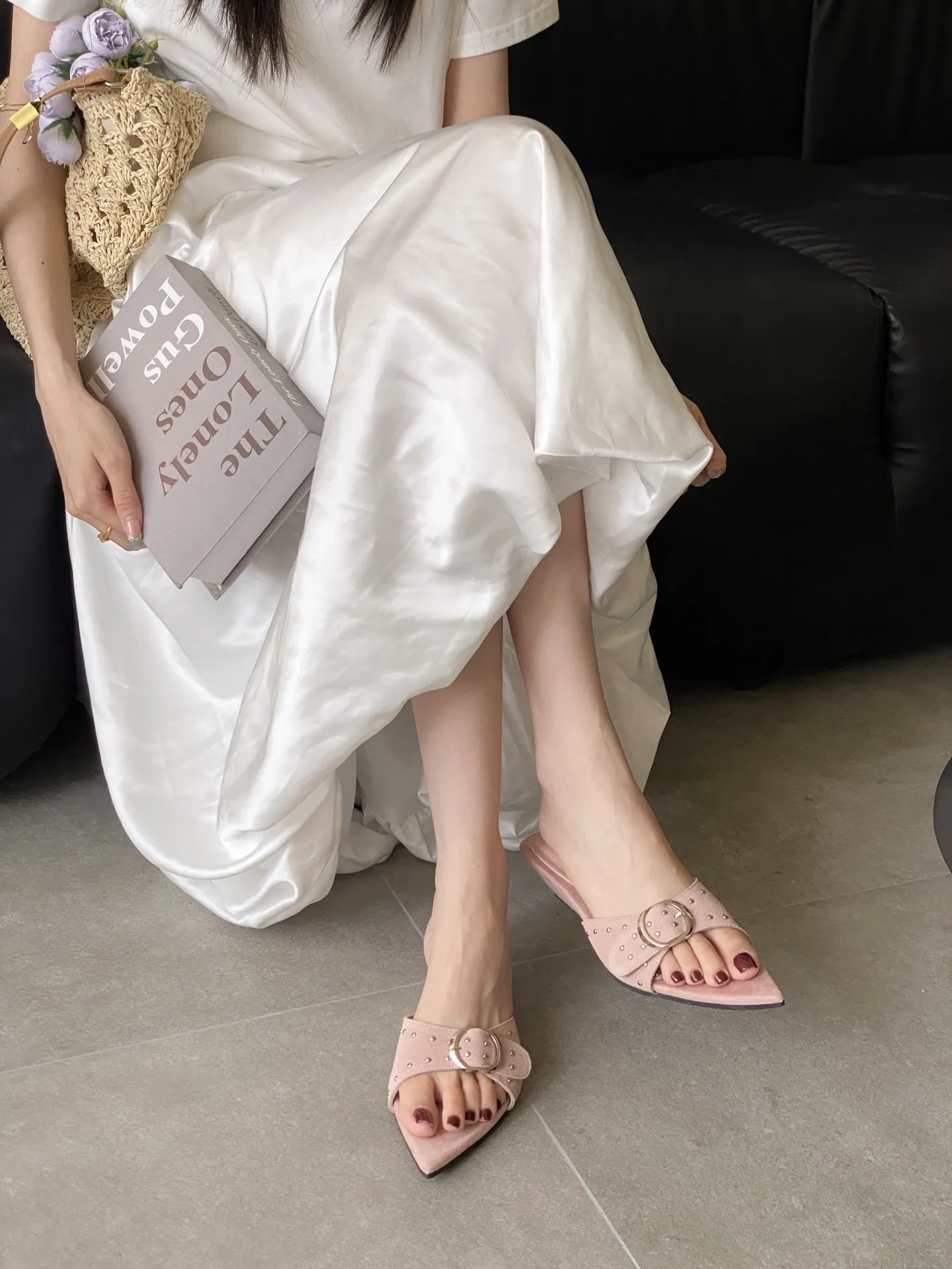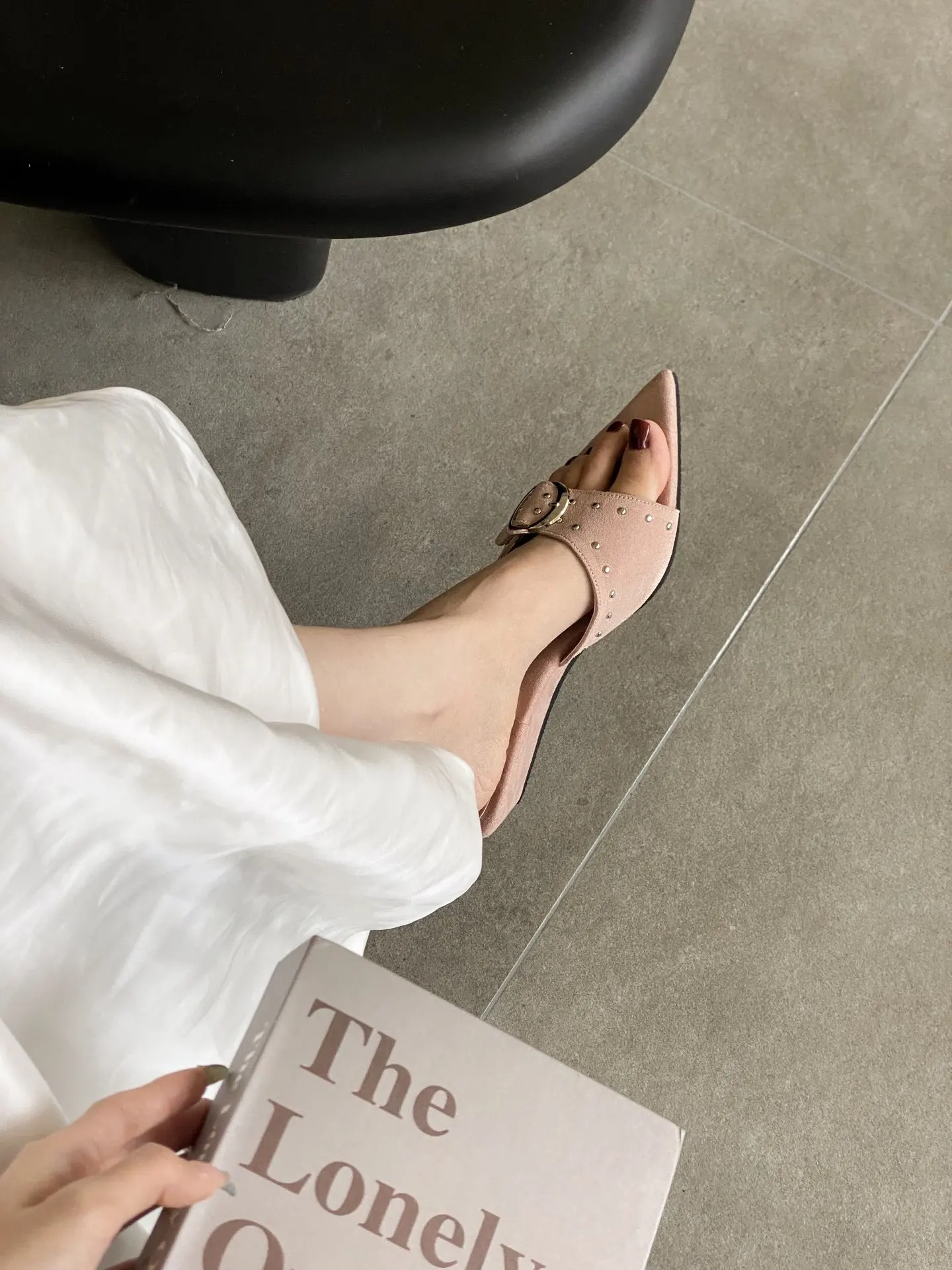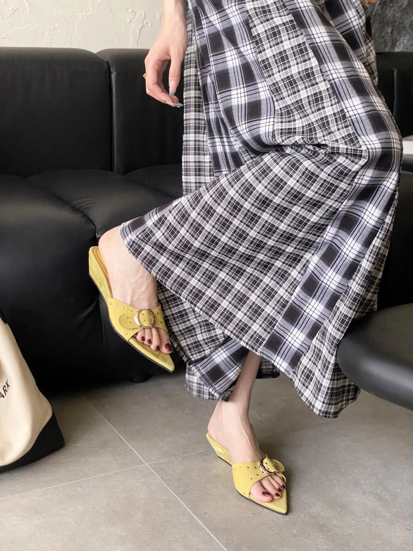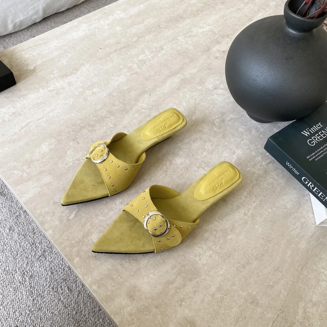 KYLETHOMASW - Shoes Woman 2025 Pointed Toe Slippers Summer Rivet Luxury Slides On A Wedge Low Flock Designer Rome Hoof Heels Fabric Rubber Fas