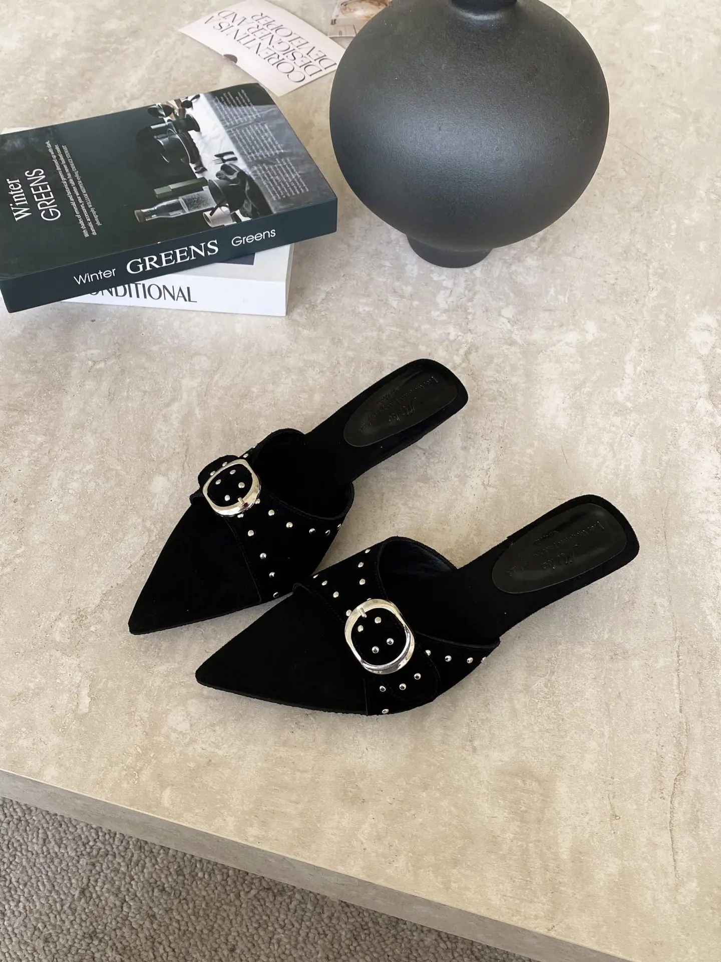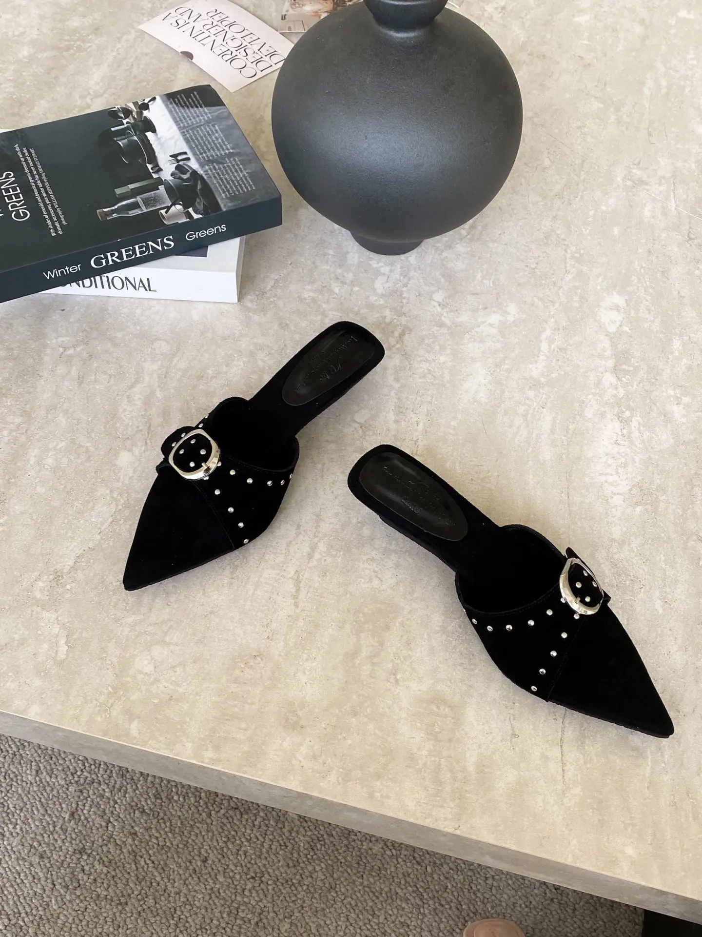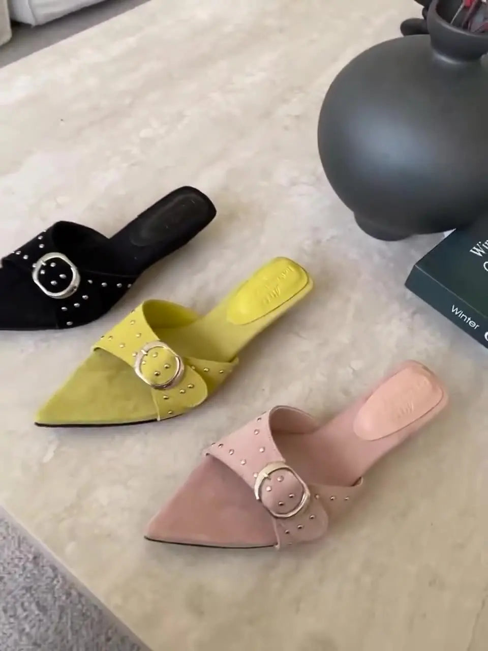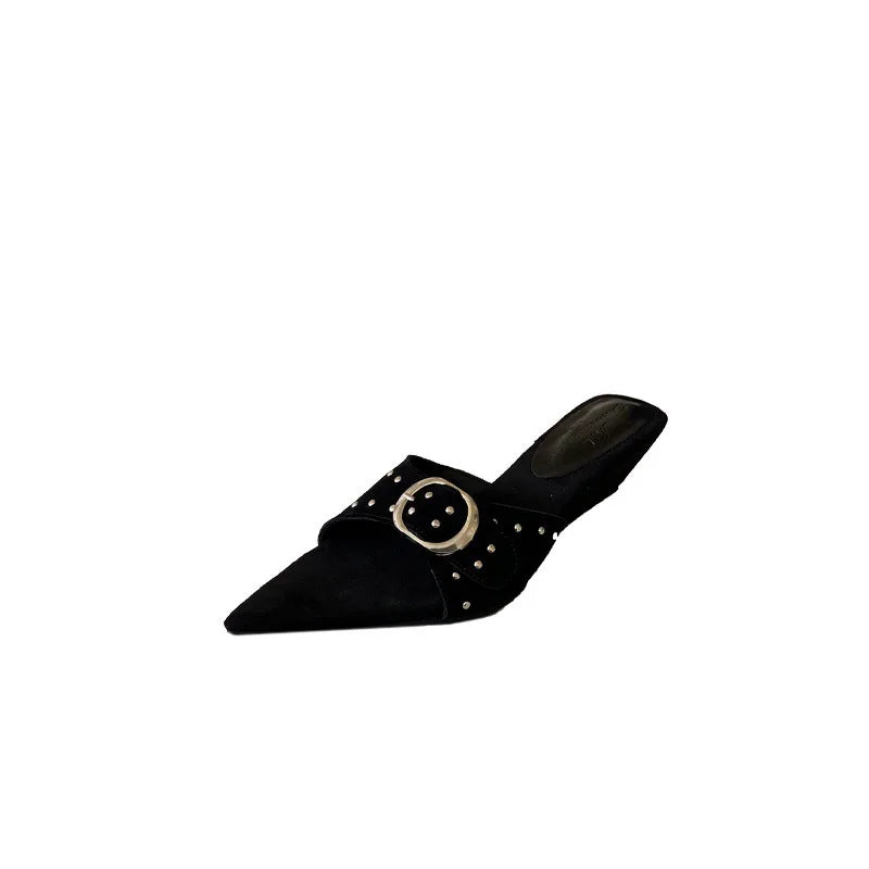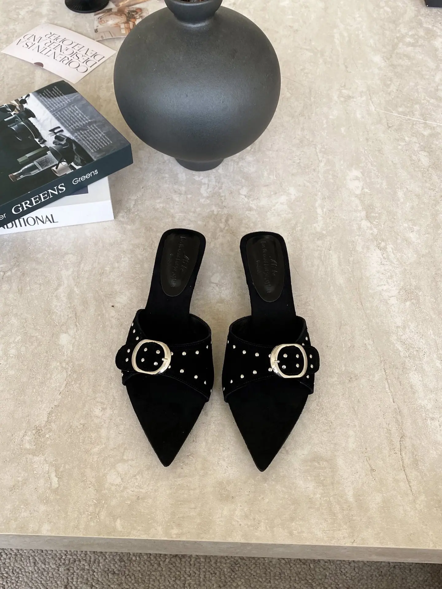 KYLETHOMASW - Shoes Woman 2025 Pointed Toe Slippers Summer Rivet Luxury Slides On A Wedge Low Flock Designer Rome Hoof Heels Fabric Rubber Fas