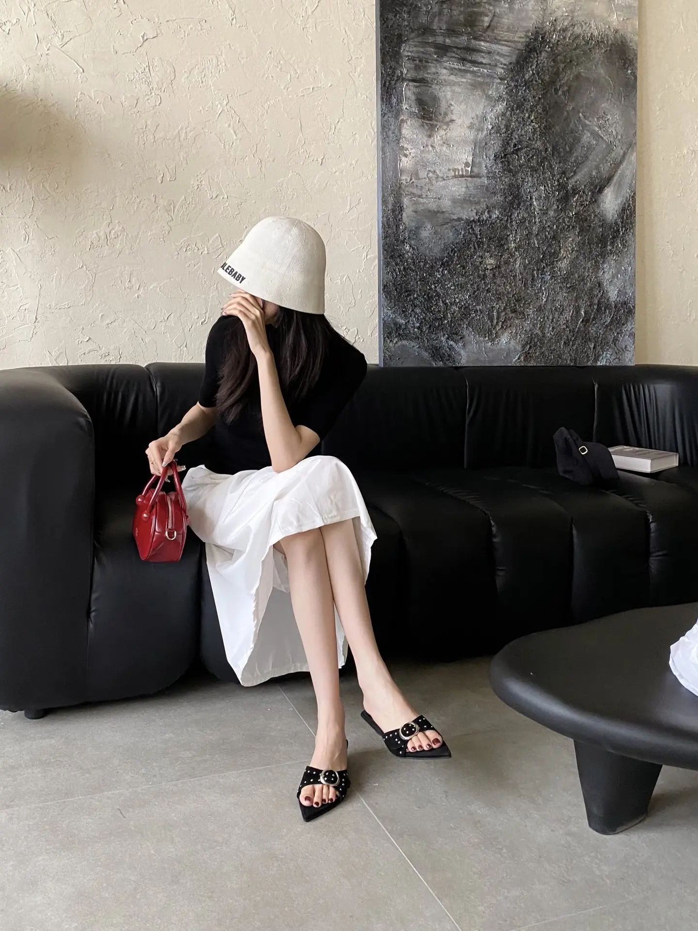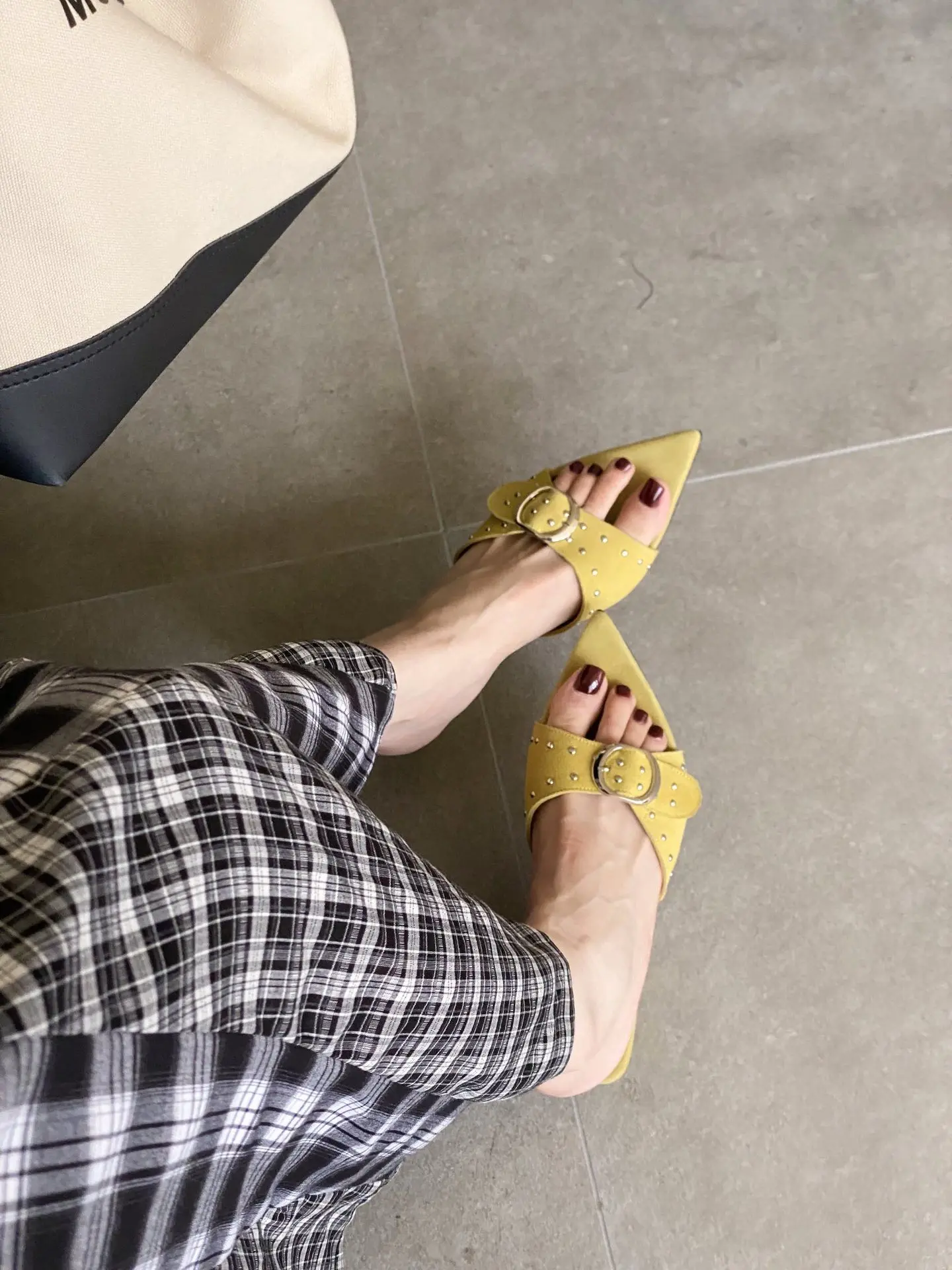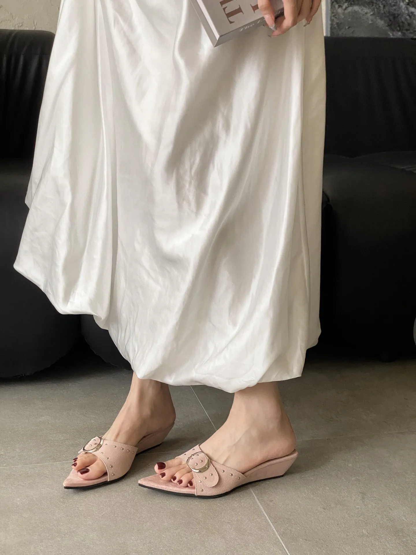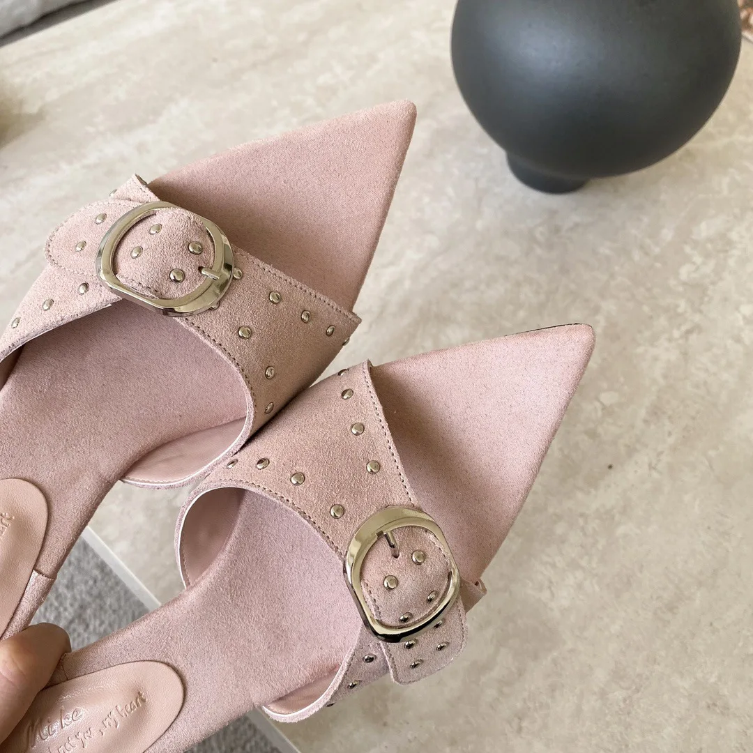KYLETHOMASW - Shoes Woman 2025 Pointed Toe Slippers Summer Rivet Luxury Slides On A Wedge Low Flock Designer Rome Hoof Heels Fabric Rubber Fas