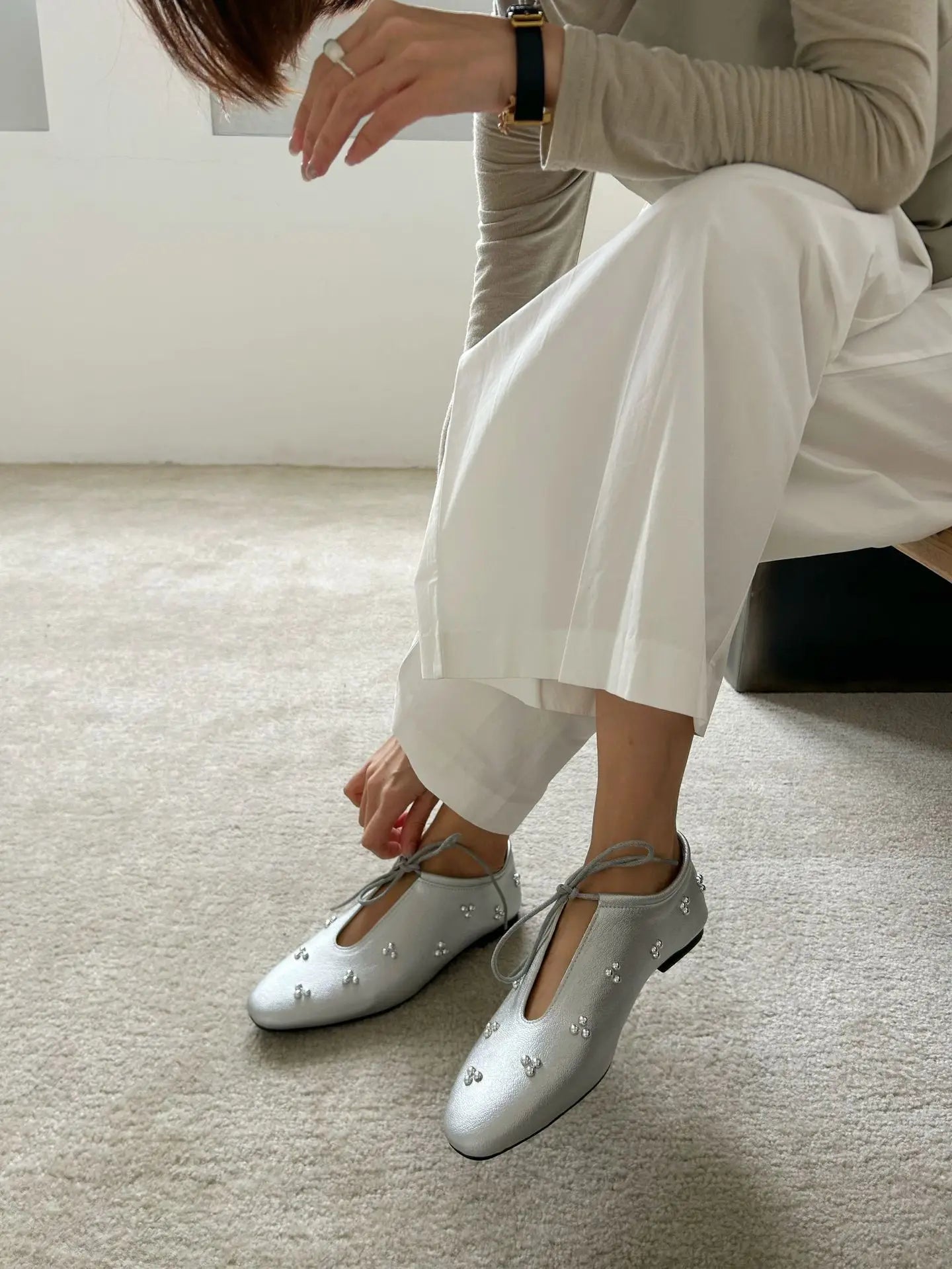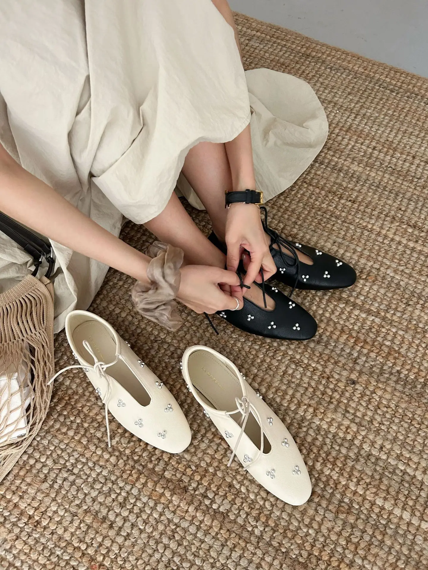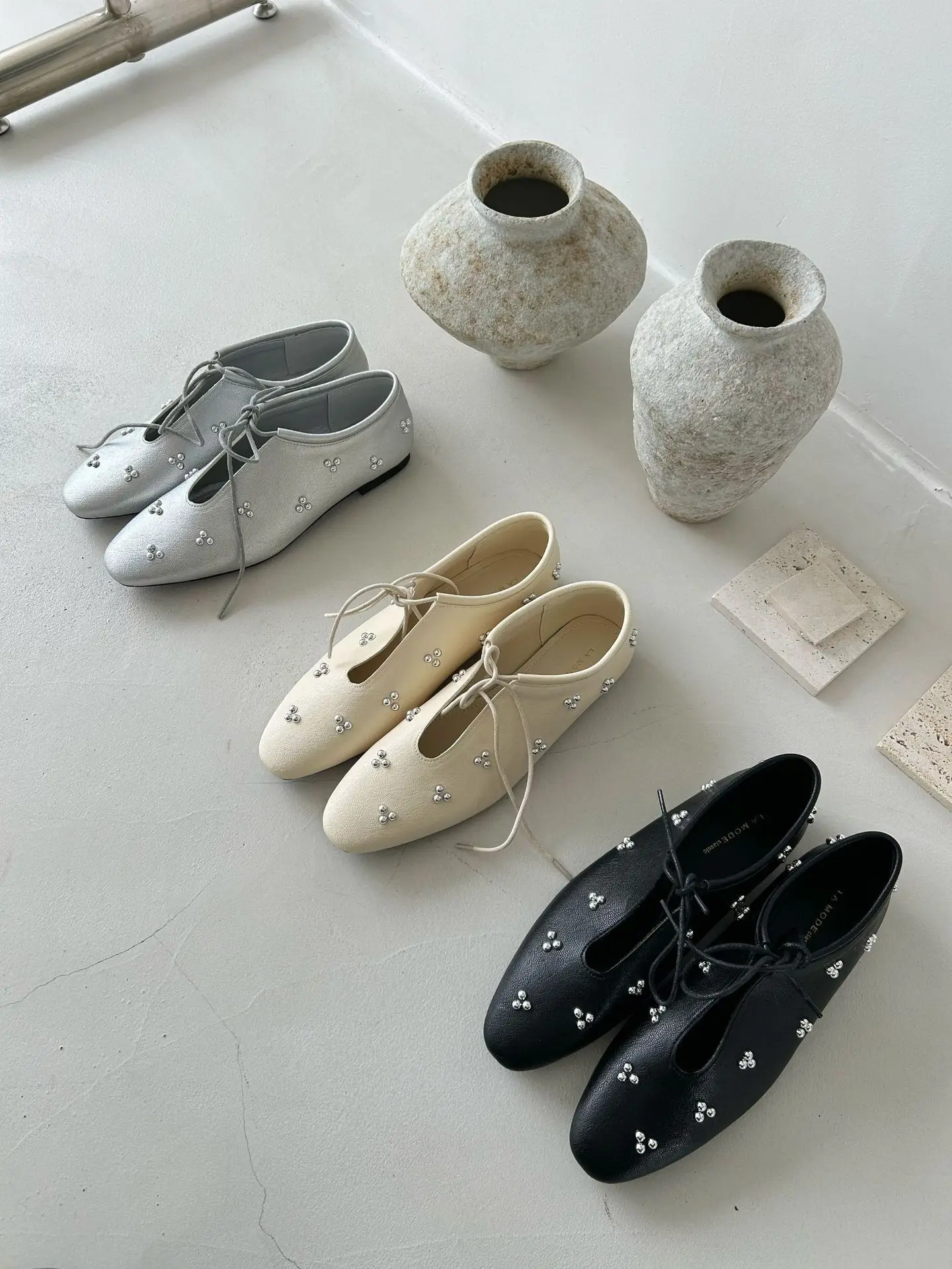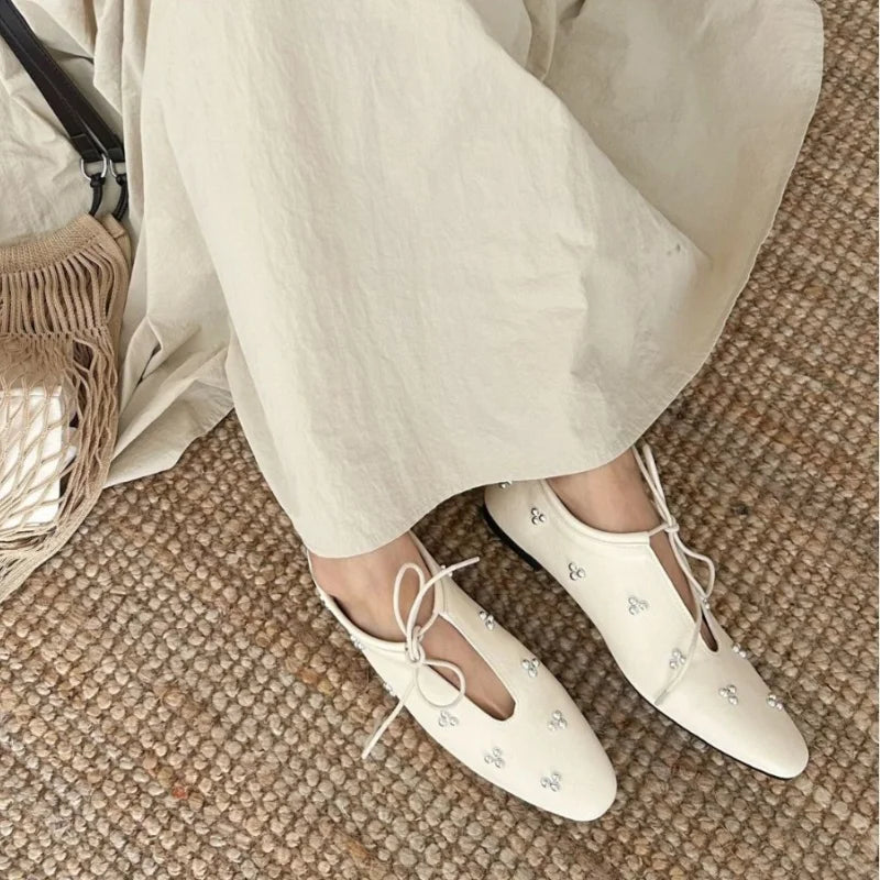 KYLETHOMASW  -  Spring Metal Rivet Decoration Shallow Mouth Ballet Flats 2025 High Quality Soft Bottom Lacing Flat Shoes Casual Comfy Shoes