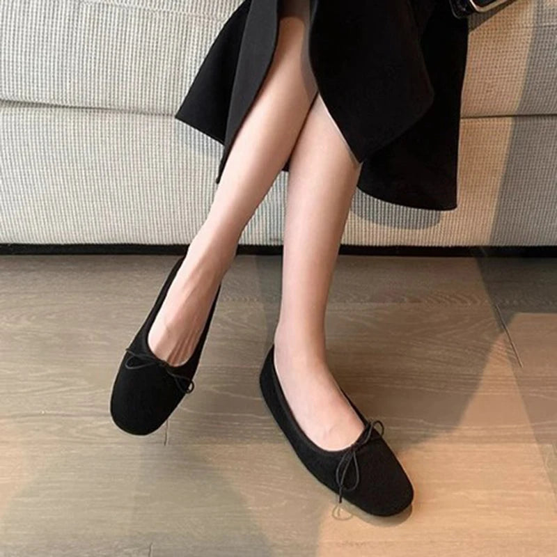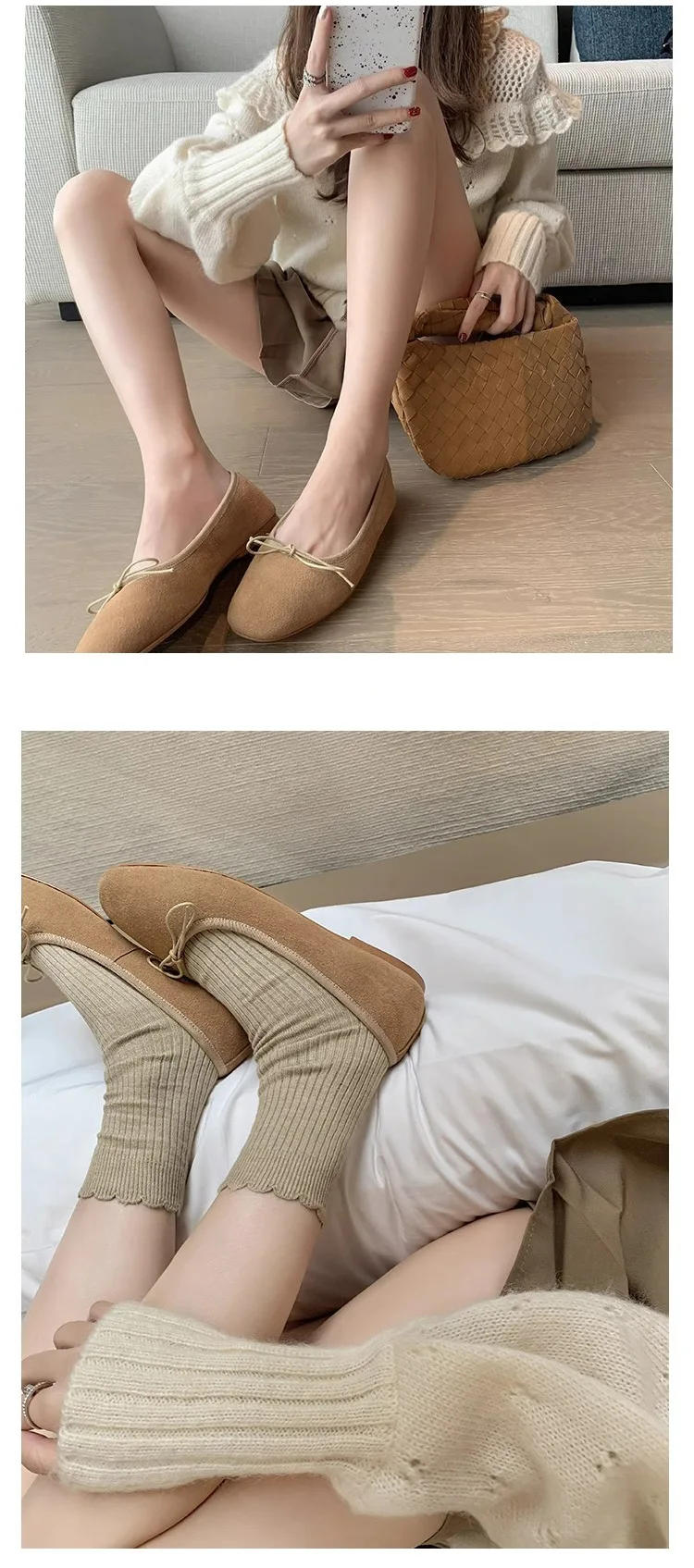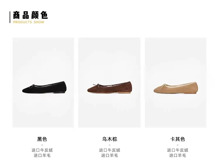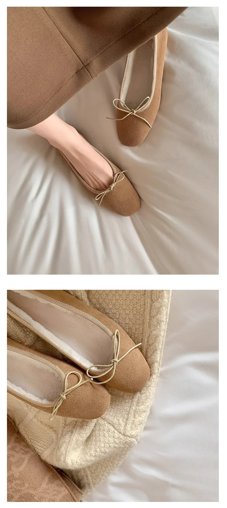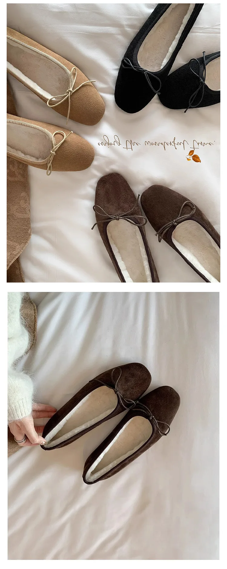 KYLETHOMASW - square toe suede leather fur flats women elegant bowtie ballerina shoes warm plush winter mocasines women slip on furry loafers