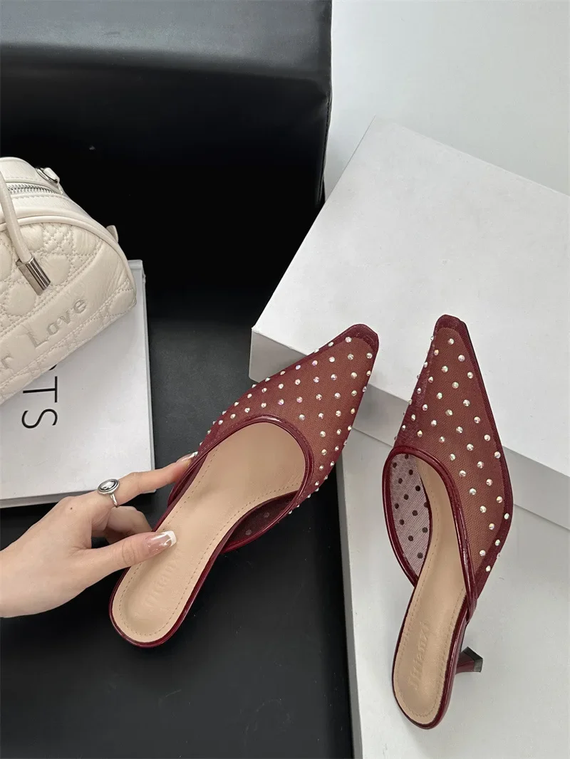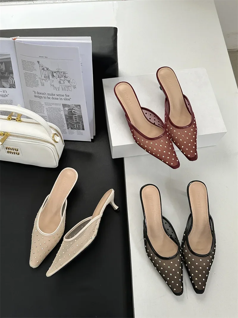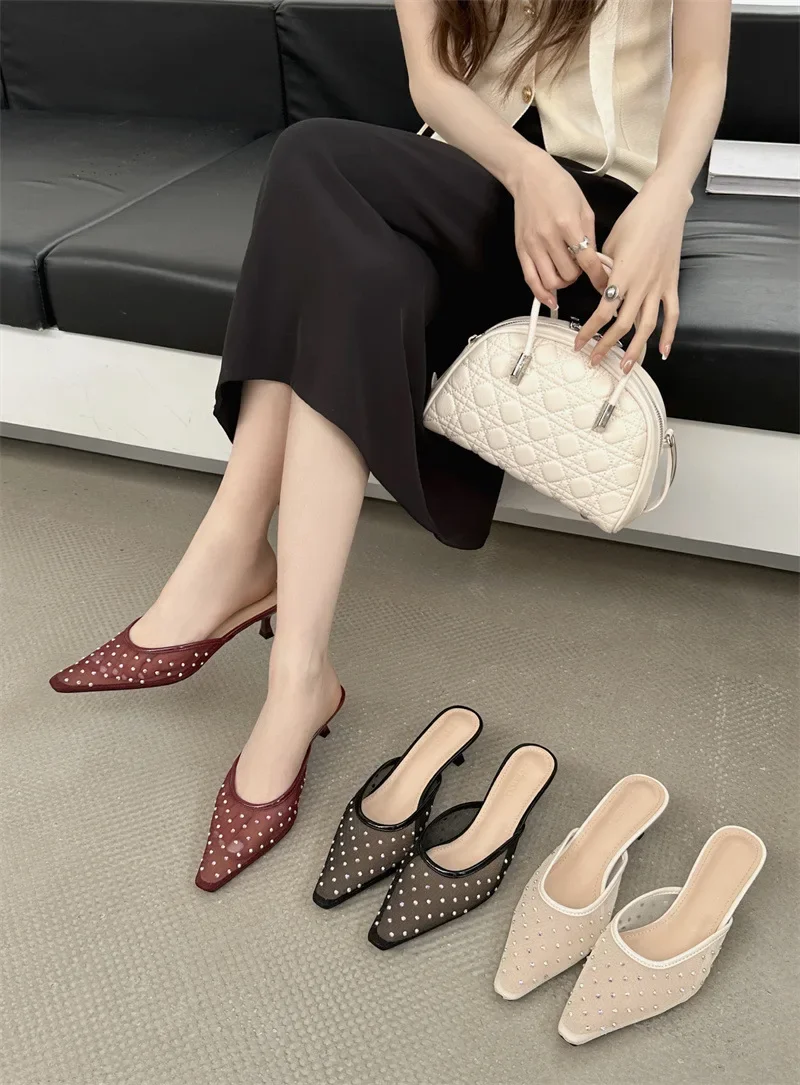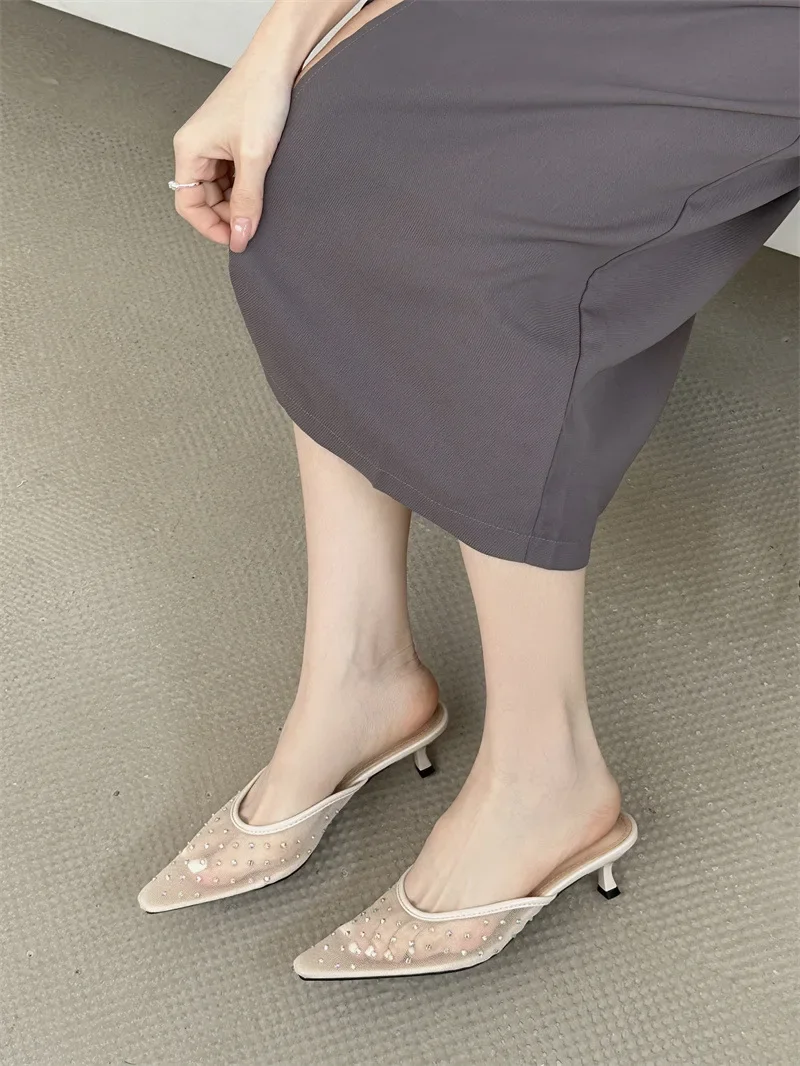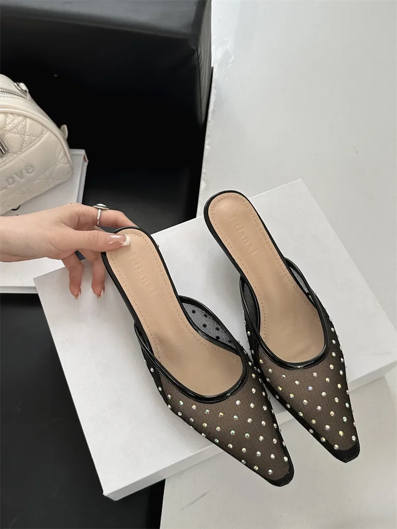 KYLETHOMASW - Summer Mesh Rhinestone High Heels Women Breathable Pointy Toe Shallow Mouth Dress Shoes Women Fashion Sexy Slippers Female