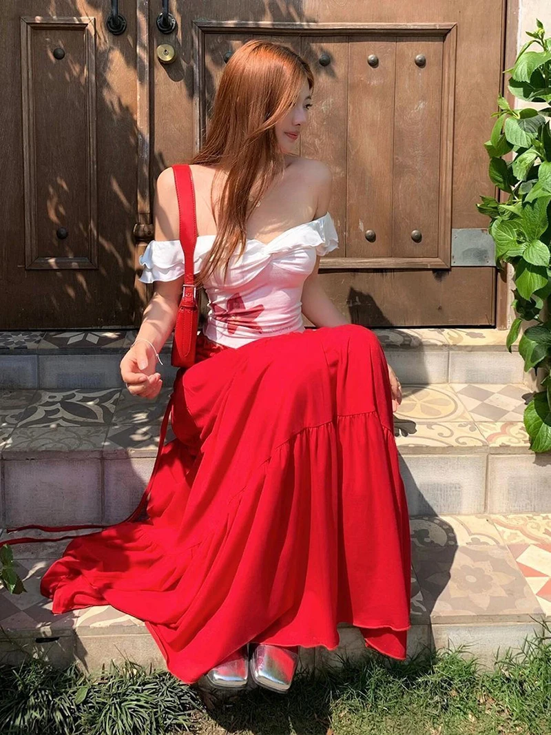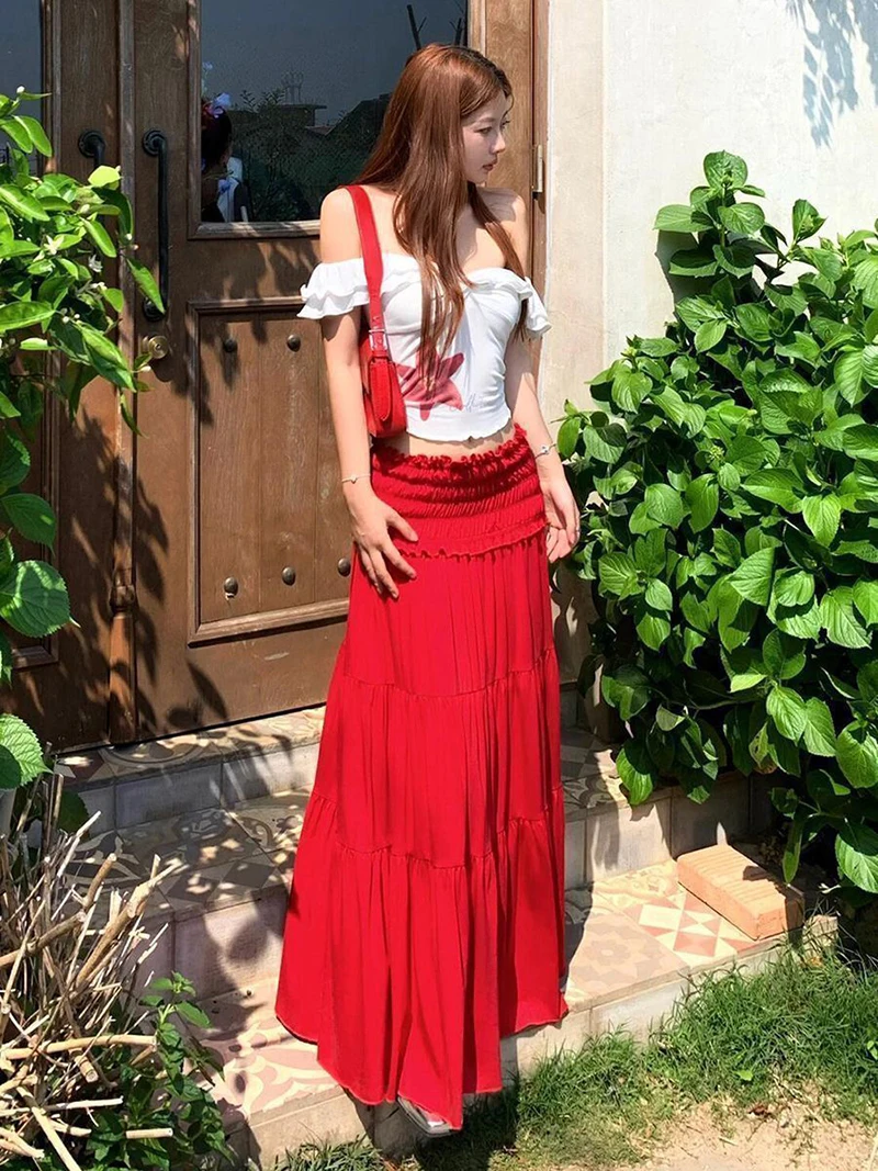 KYLETHOMASW  -  Summer New Beach 2 Piece Sets Women Hotsweet Off Shoulder Star Print Casual Tops Mushroom Edge Draw Pleats Slim Long Skirt