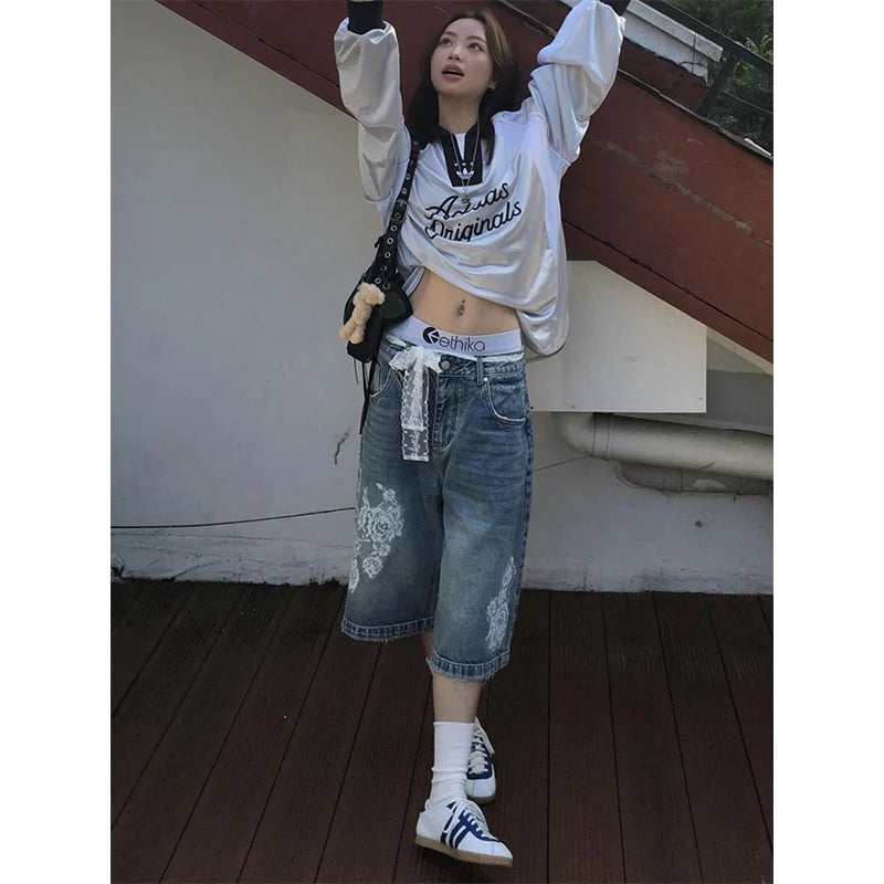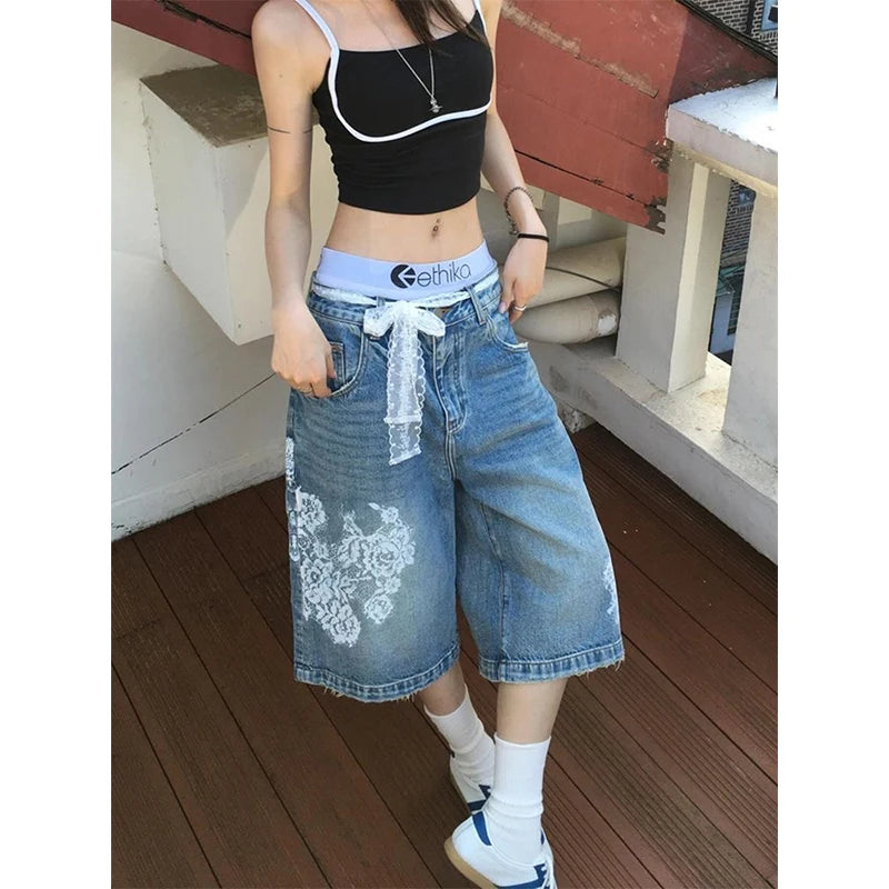 KYLETHOMASW - Summer Vintage Harajuku Aesthetic Style Jeans Women's Sweet Casual Calf-Length Pants Y2K Punk Street Baggy Denim Shorts