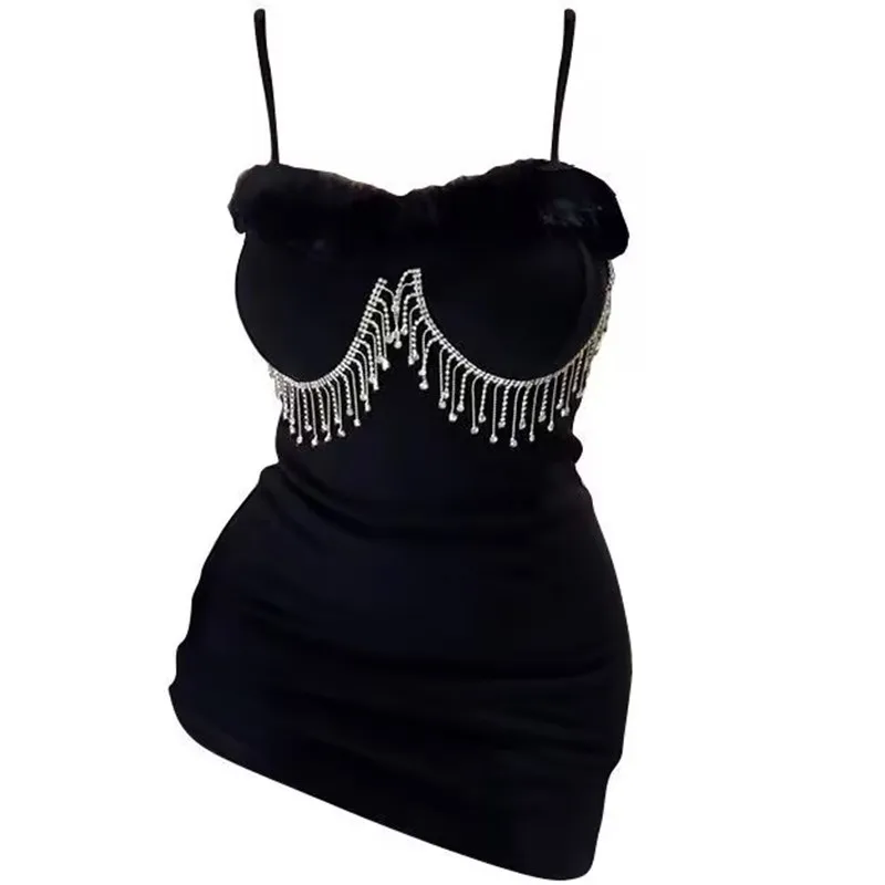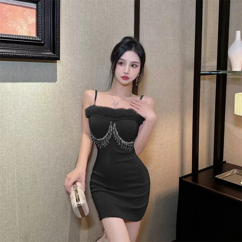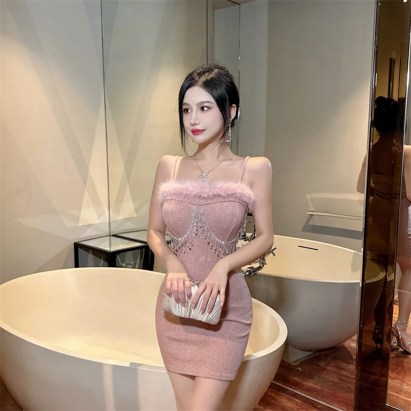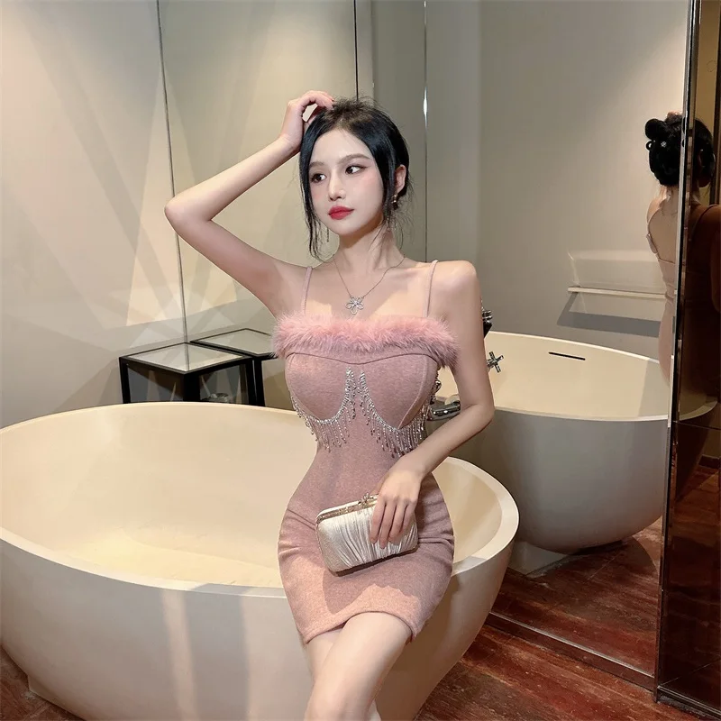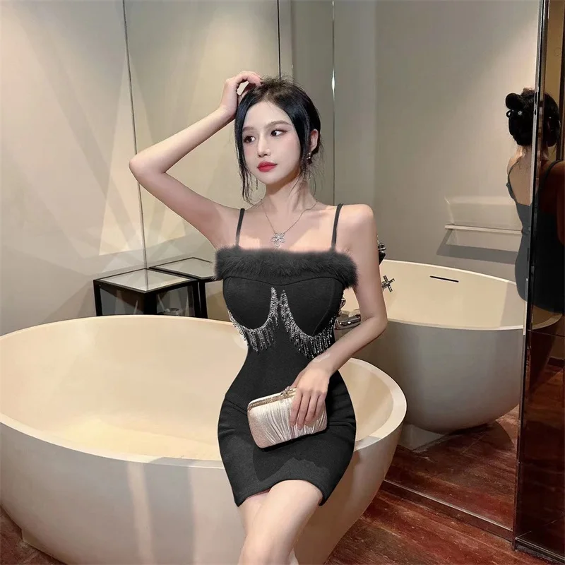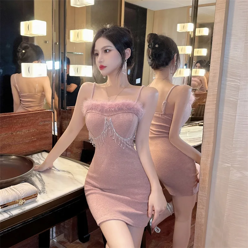 KYLETHOMASW - Sweet Hot Girl Pure Sexy Strap Dress Women's Autumn/winter Fur Collar Slim-fit Wrap Hip Short Dress Fashion Female Clothes