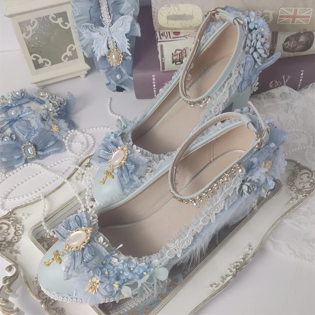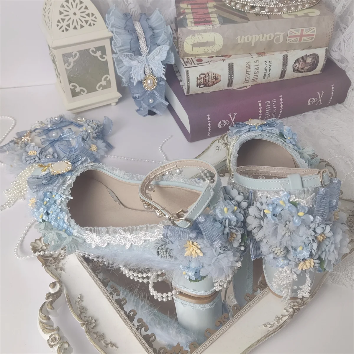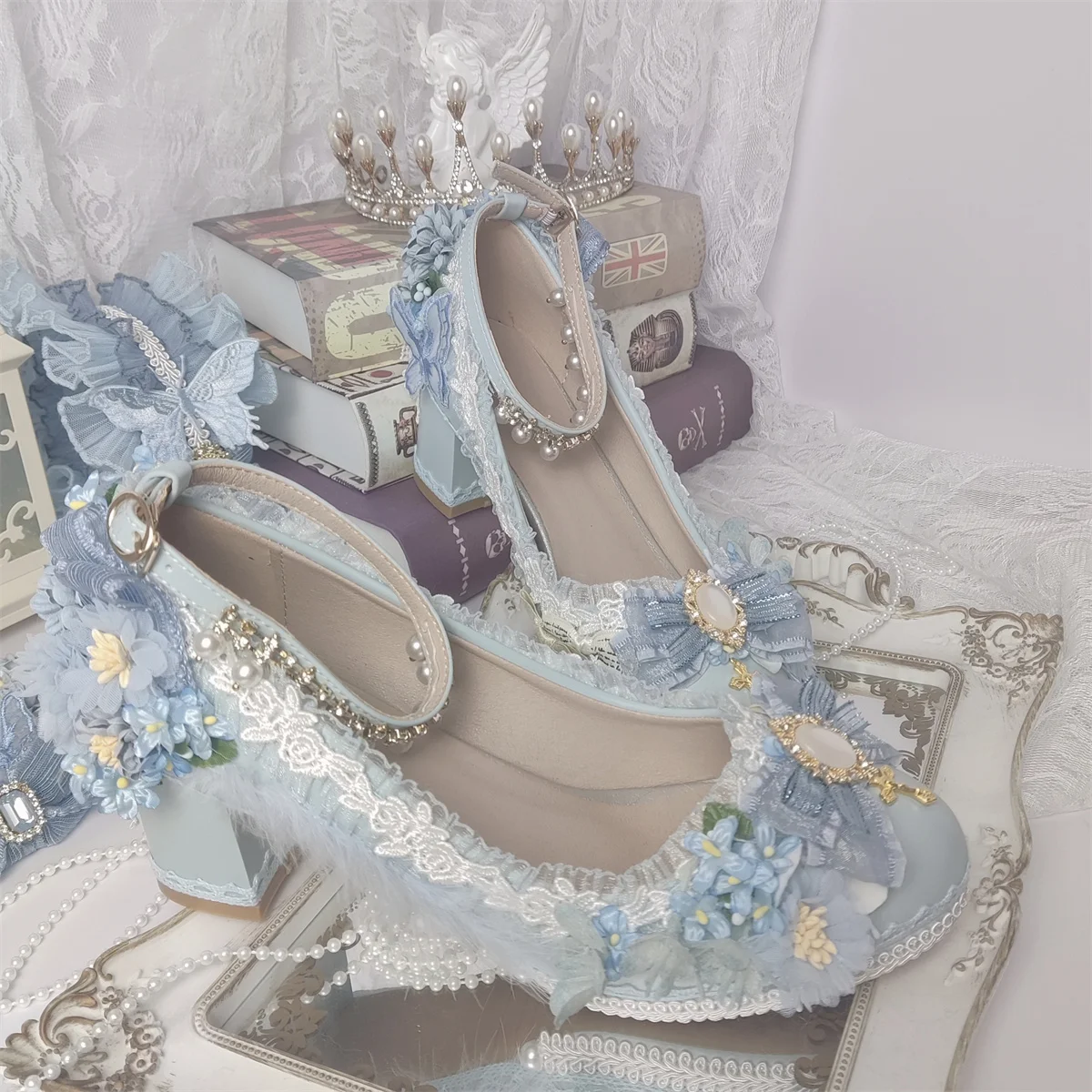 KYLETHOMASW  -  Sweet Lolita Retro Court Style Cosplay Cute Loli Flower Wedding Girls Gem Flower Ribbon Plush Bow 6-8 Cm High Heel Shoes