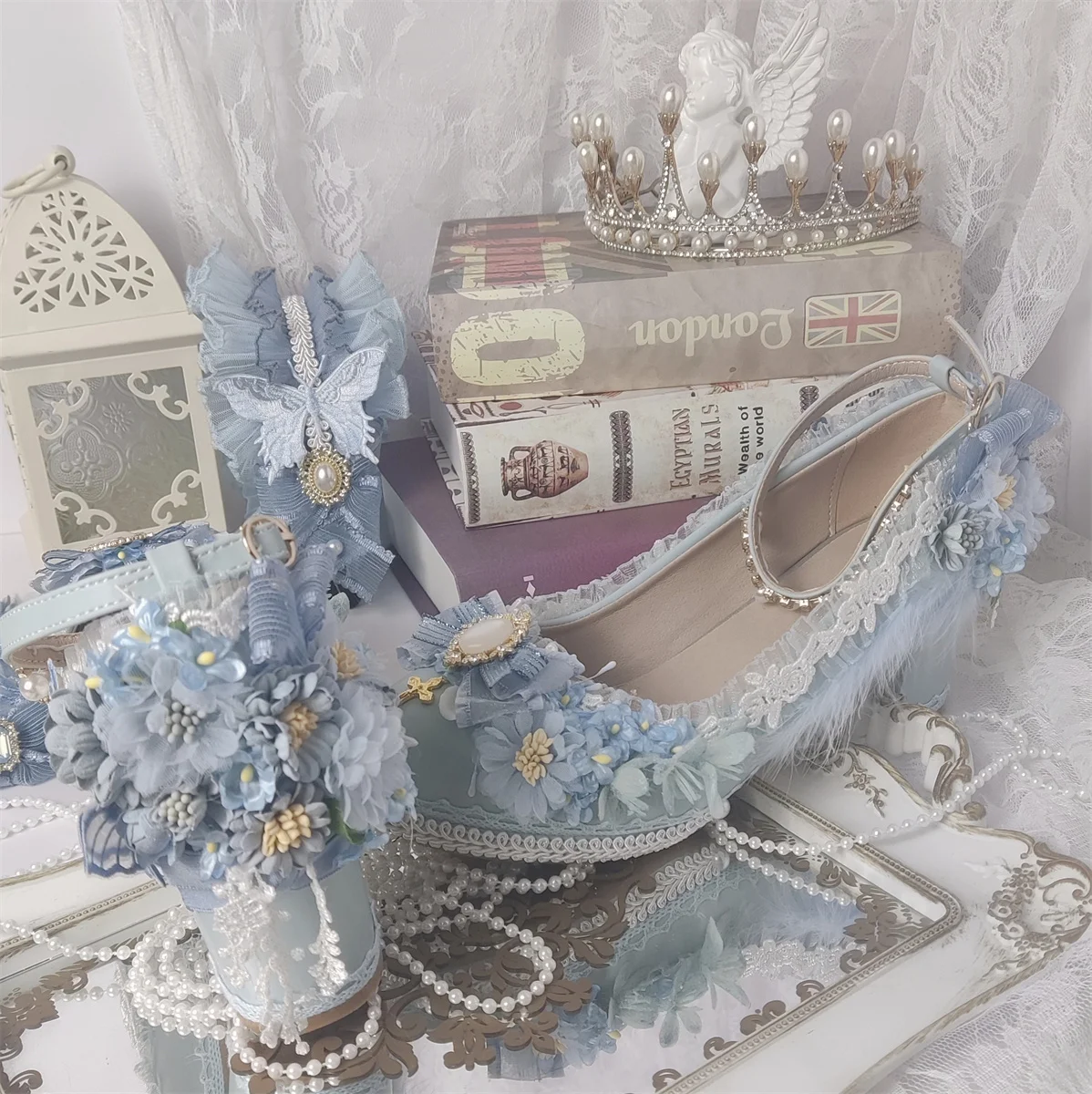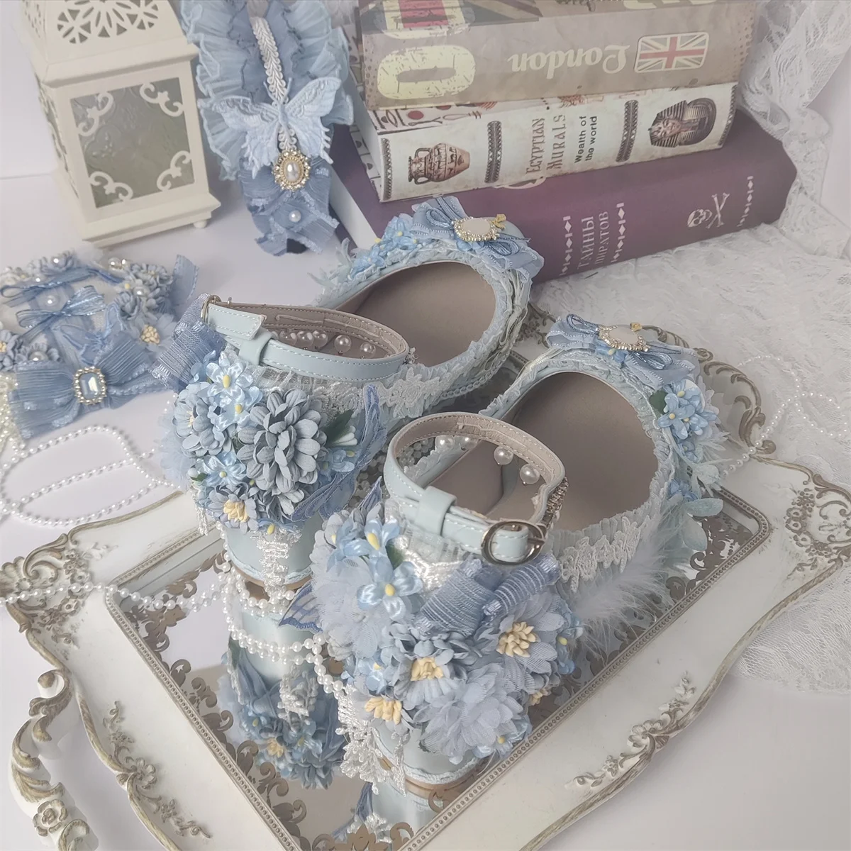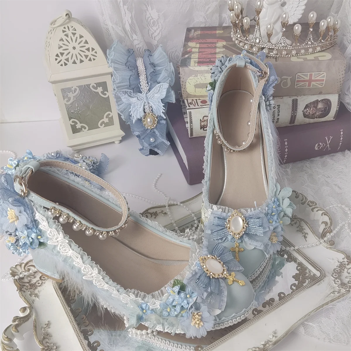 KYLETHOMASW  -  Sweet Lolita Retro Court Style Cosplay Cute Loli Flower Wedding Girls Gem Flower Ribbon Plush Bow 6-8 Cm High Heel Shoes