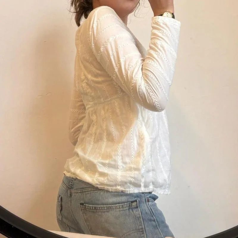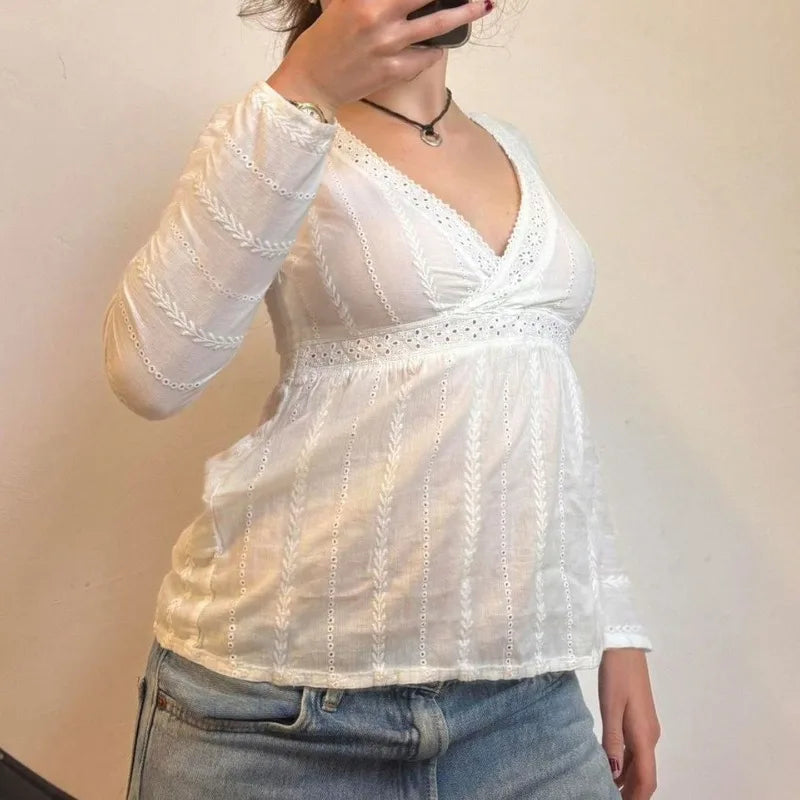 KYLETHOMASW - T Shirts Women Vintage Lace Patchwork Hollow Out V Neck Long Sleeve Ruffles Fashion Sweet Tops Female Autumn Tee Shirt