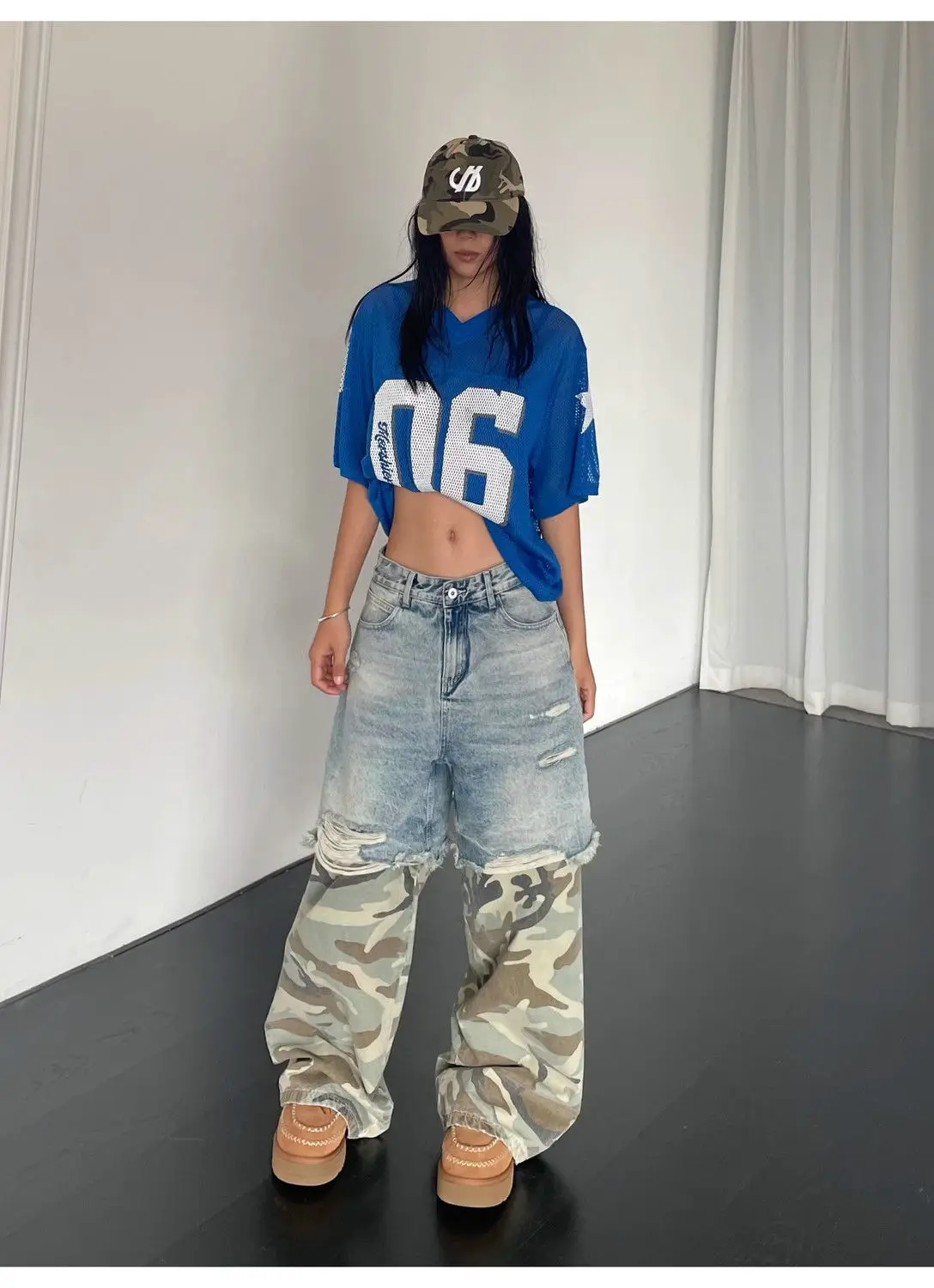 Kylethomasw Vintage Camouflage Spliced Ripped Jeans for Women Hip Hop Y2k Chic Baggy Wide Leg Denim Pants Streetwear Casual Trousers
