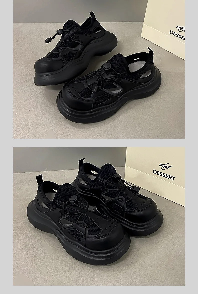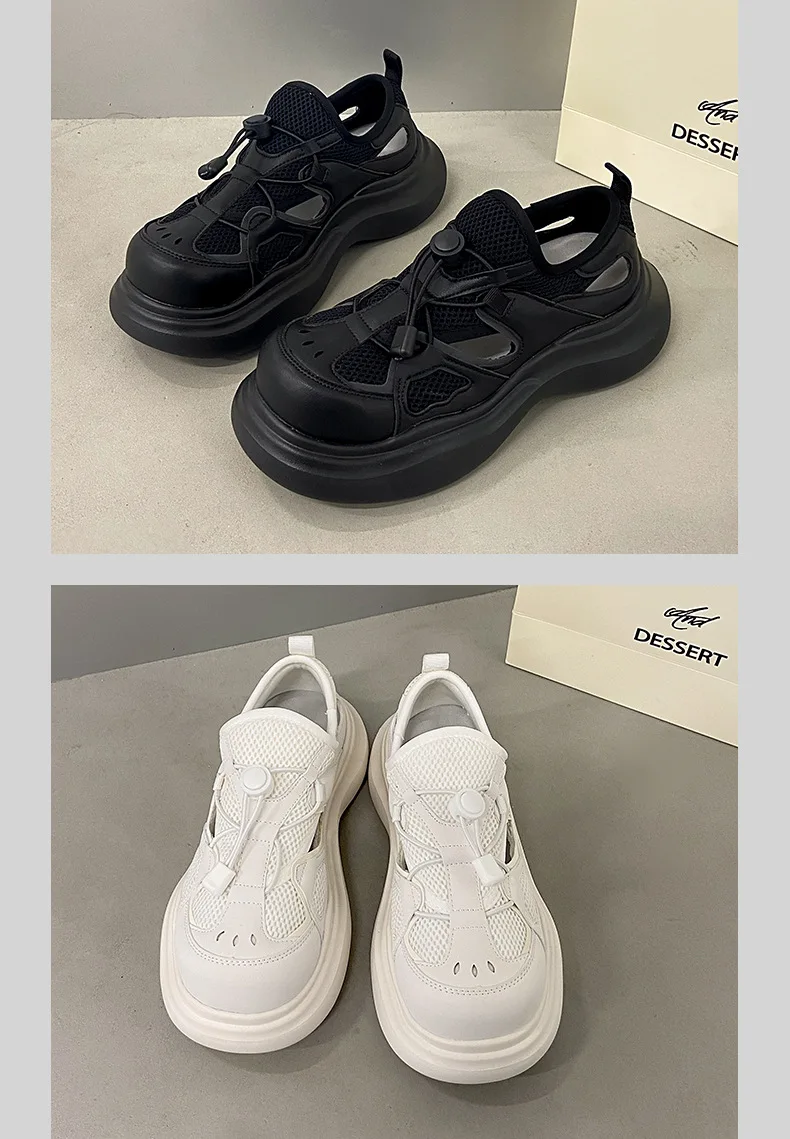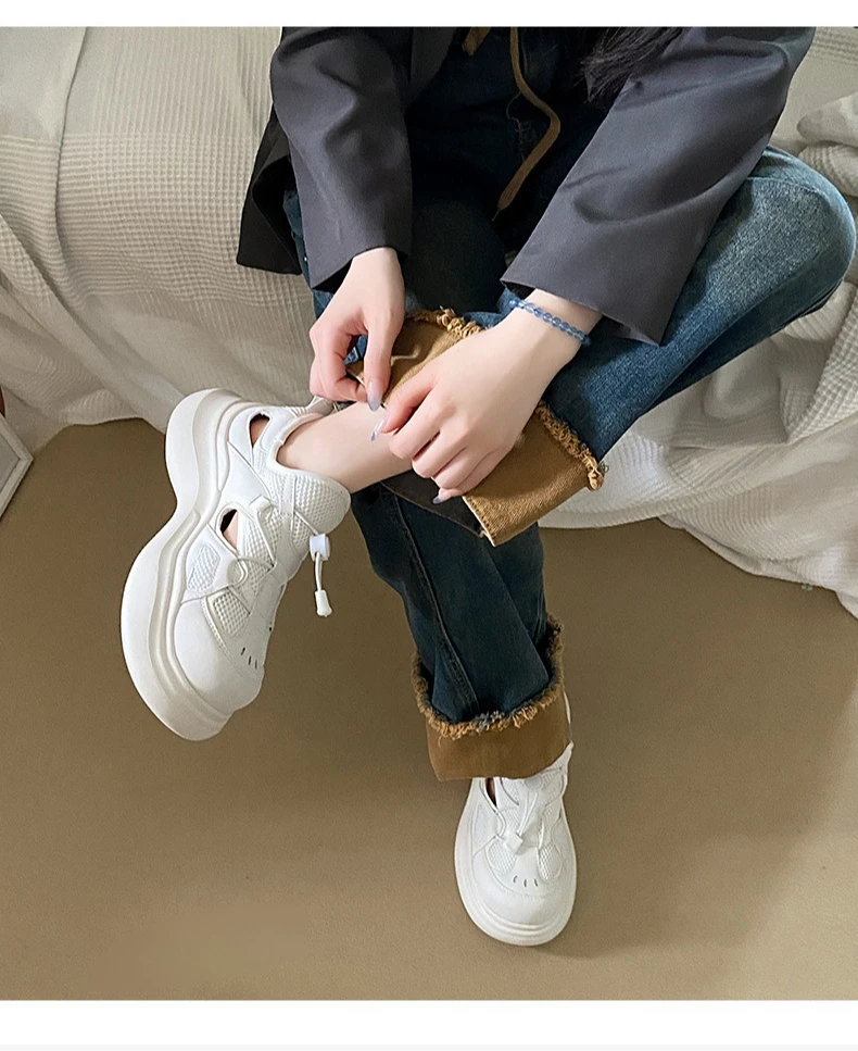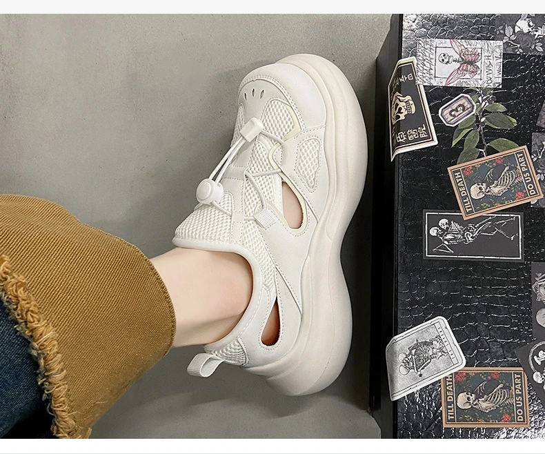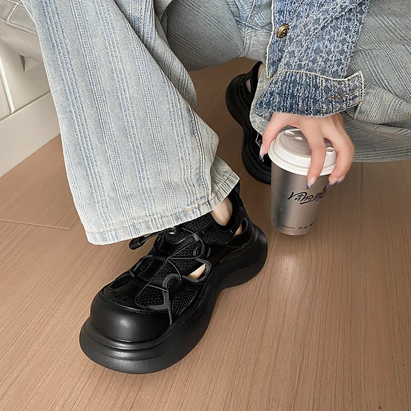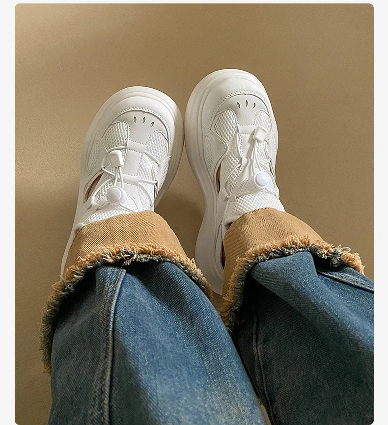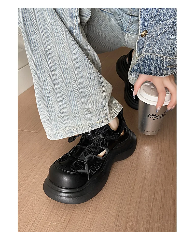 KYLETHOMASW - Vintage Chunky Sneakers for Women Y2K Thick Soled Sandals Sports Shoes Casual Hollow Out Lace-Up Trendy Couple Shoes Black White