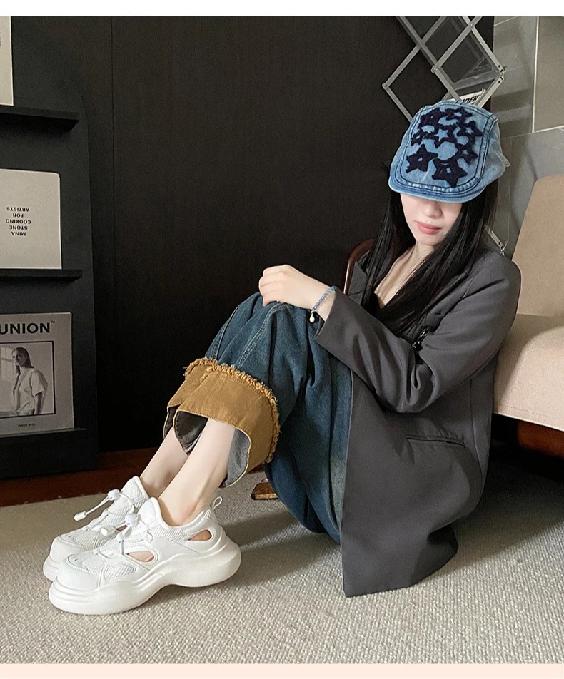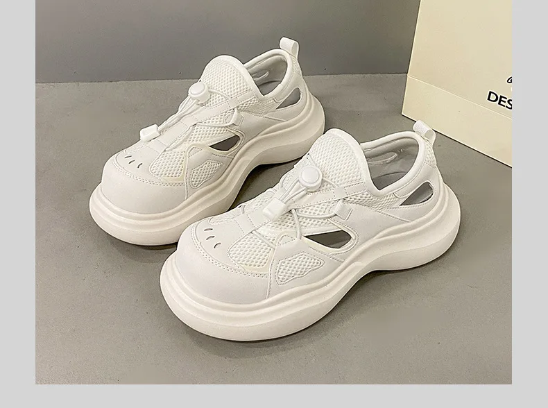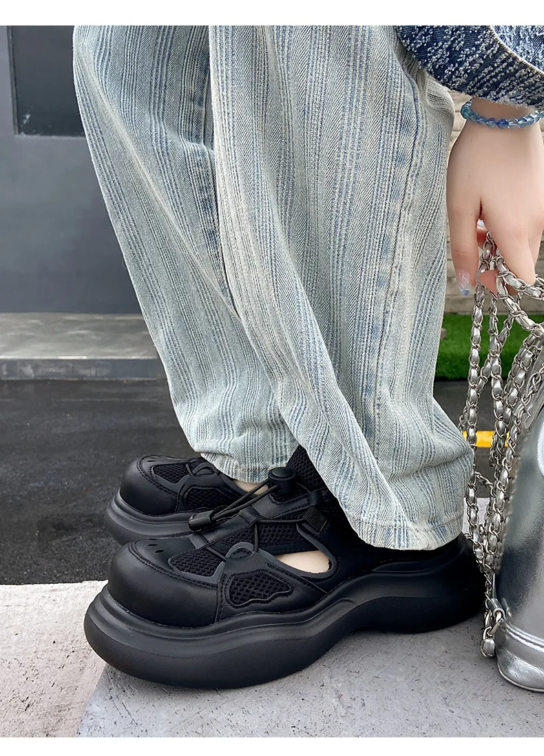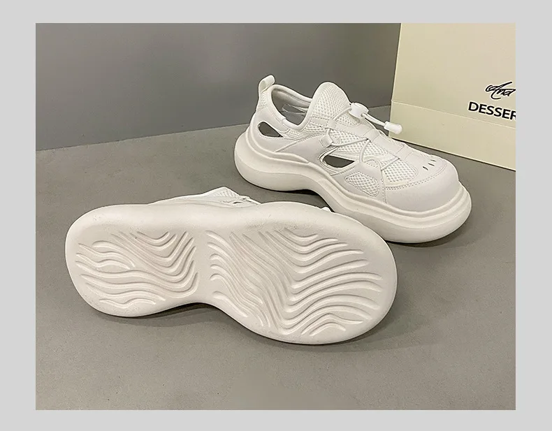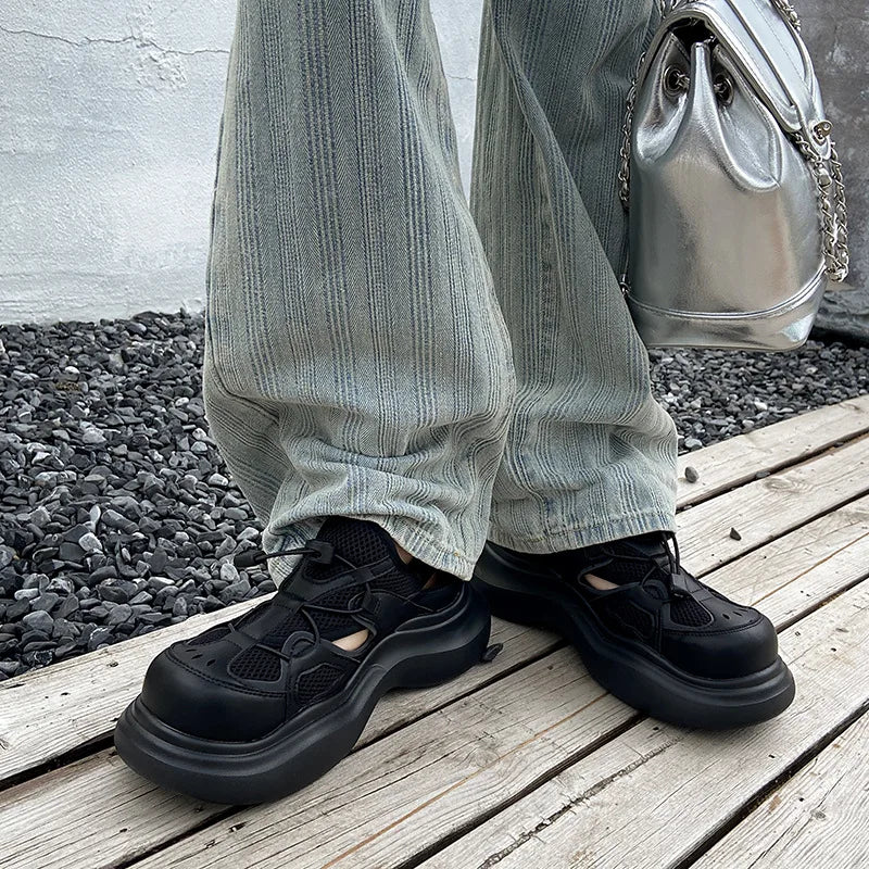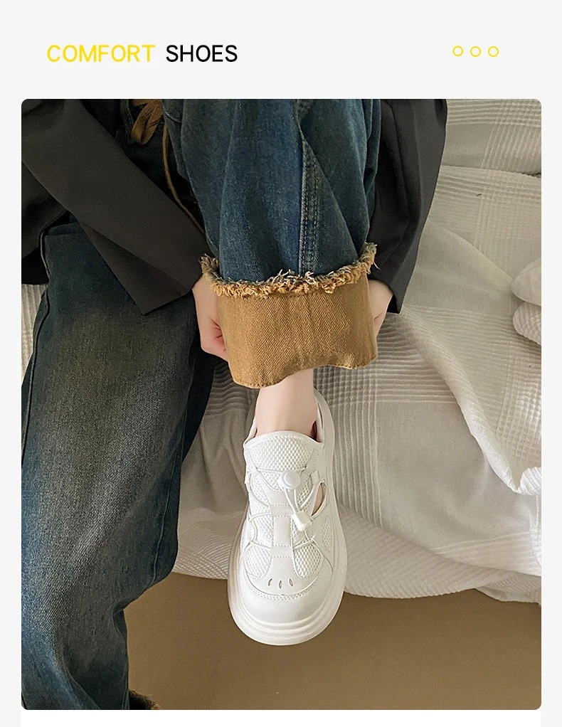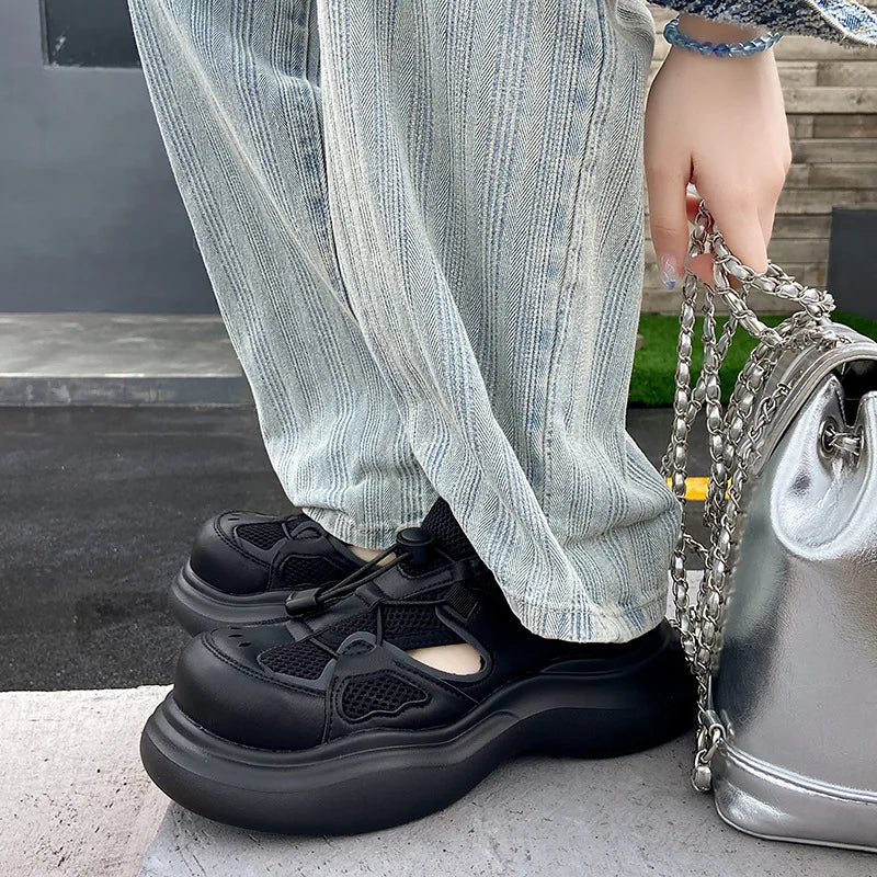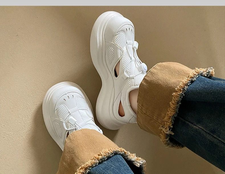 KYLETHOMASW - Vintage Chunky Sneakers for Women Y2K Thick Soled Sandals Sports Shoes Casual Hollow Out Lace-Up Trendy Couple Shoes Black White